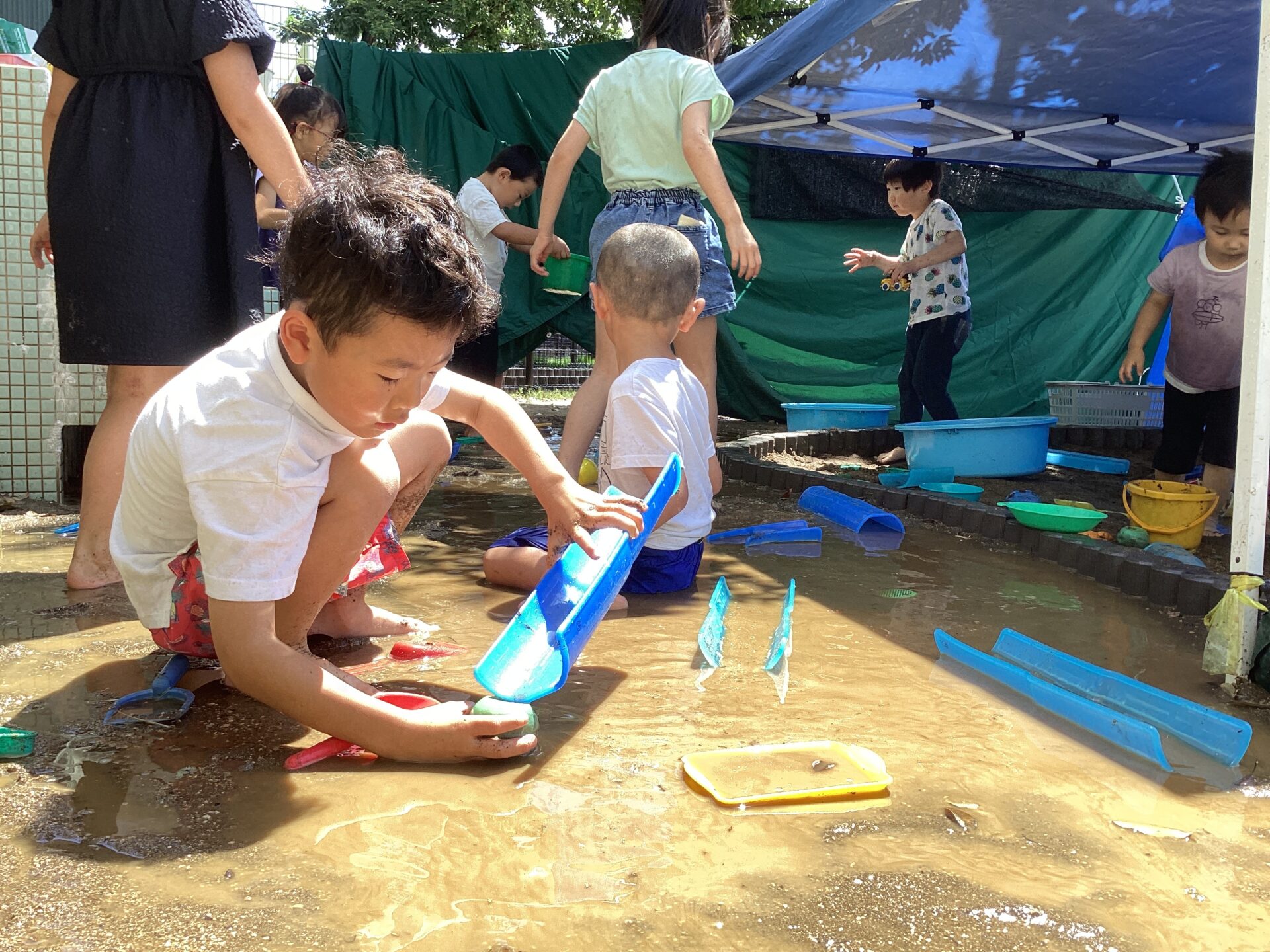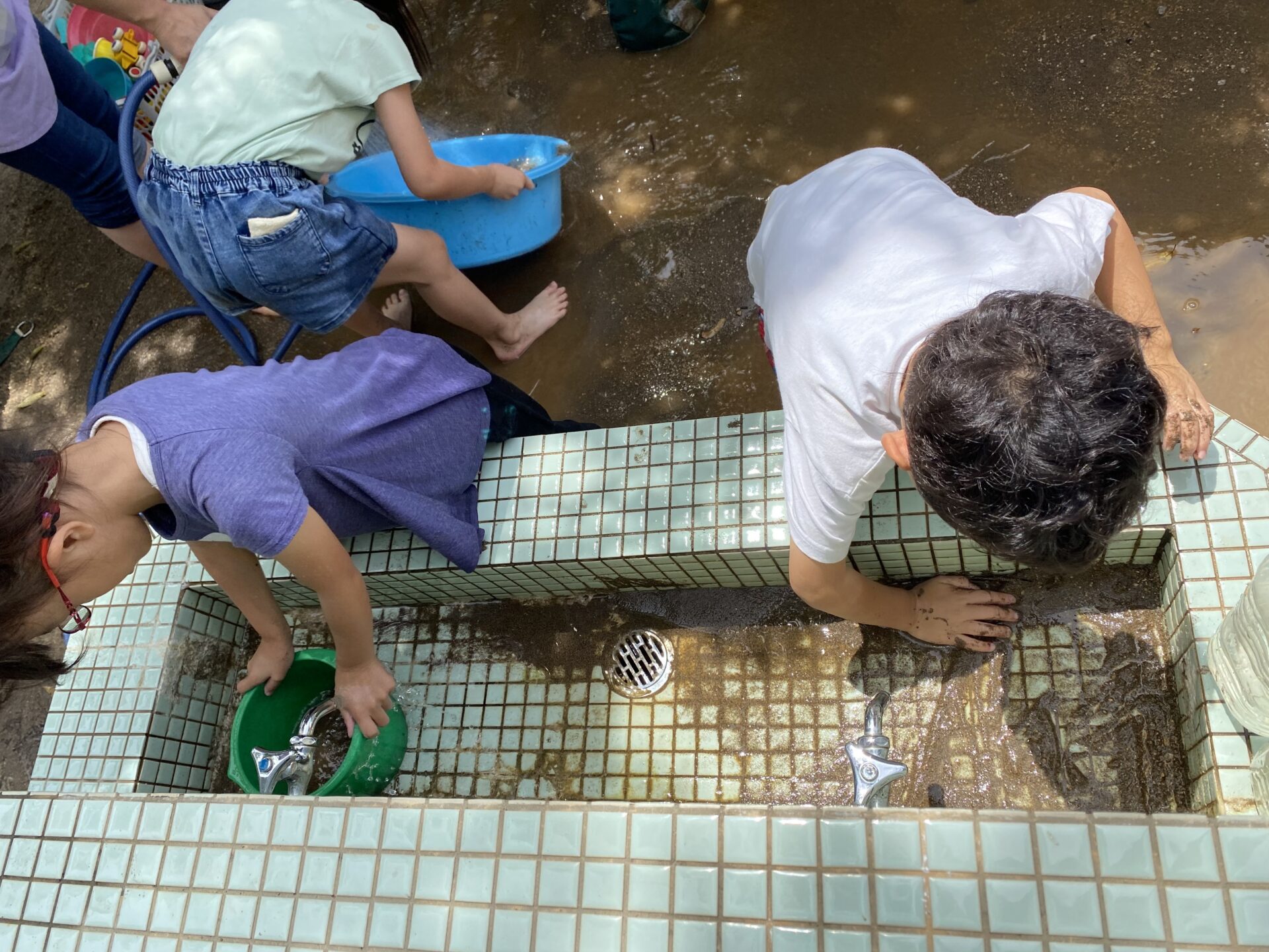最後までどろんこ遊びを楽しんでいたのは、つき組(年長児)の子どもたちです。気が付くと一人の子が、汚れた玩具をきれいに洗ってくれていました。そんな姿を見た他の子どもたちも、一緒に泥だらけになった玩具を洗ってくれました。