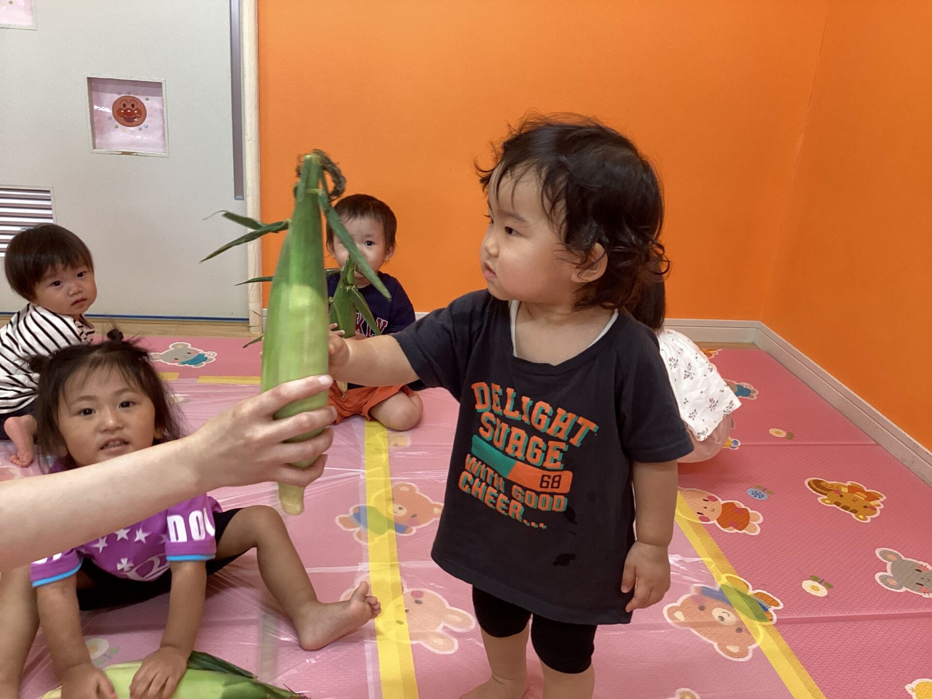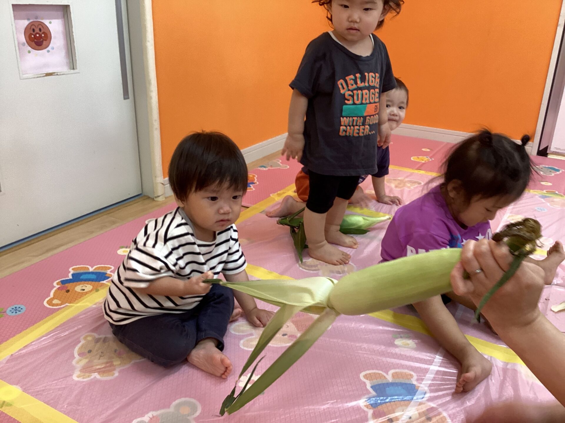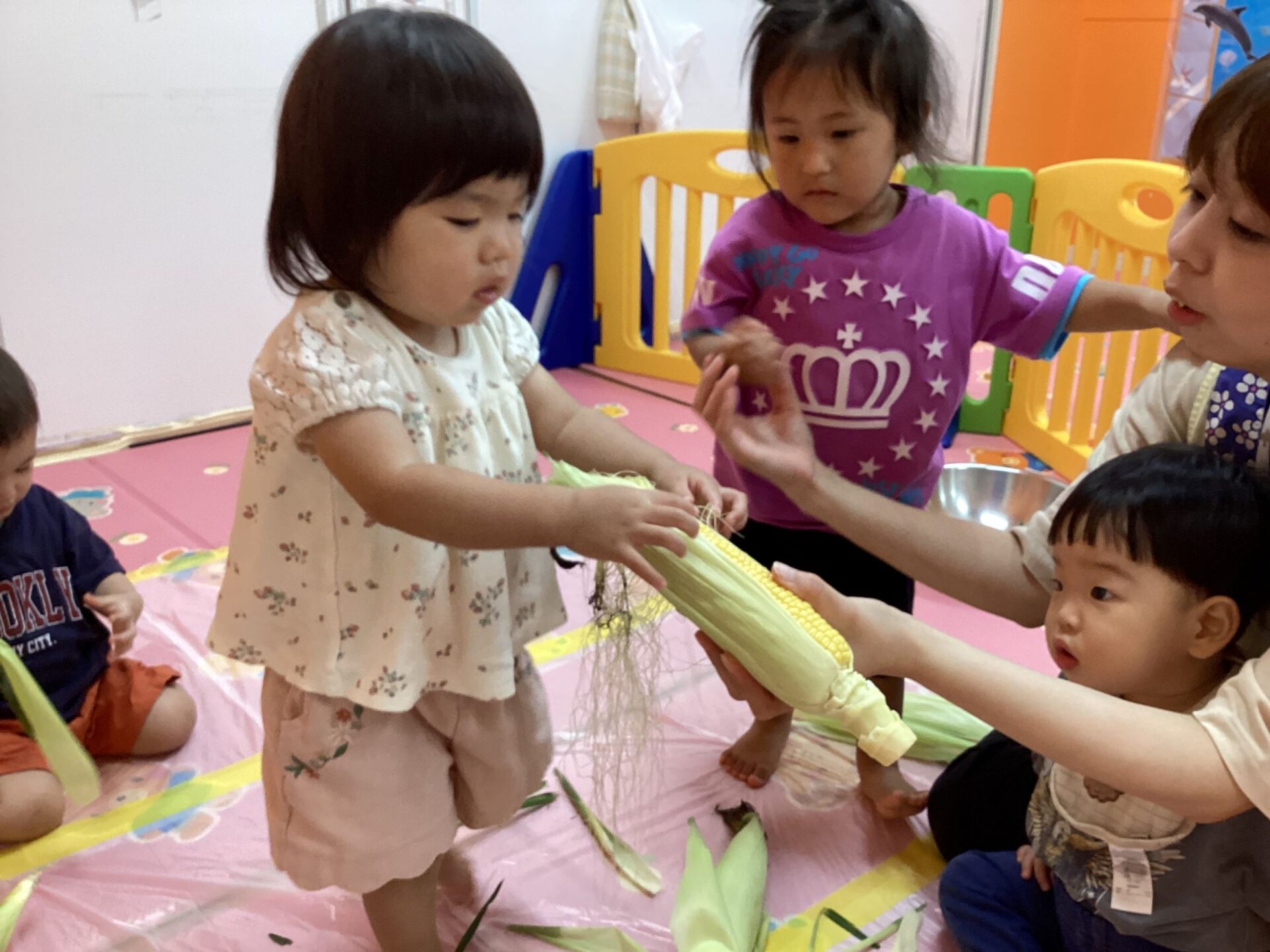 トウモロコシを指先でそっと触ってみたり、優しく抱っこしたり、コロコロ転がしたりと、だんだんトウモロコシに興味が出てきた様子の子どもたちでした🥰