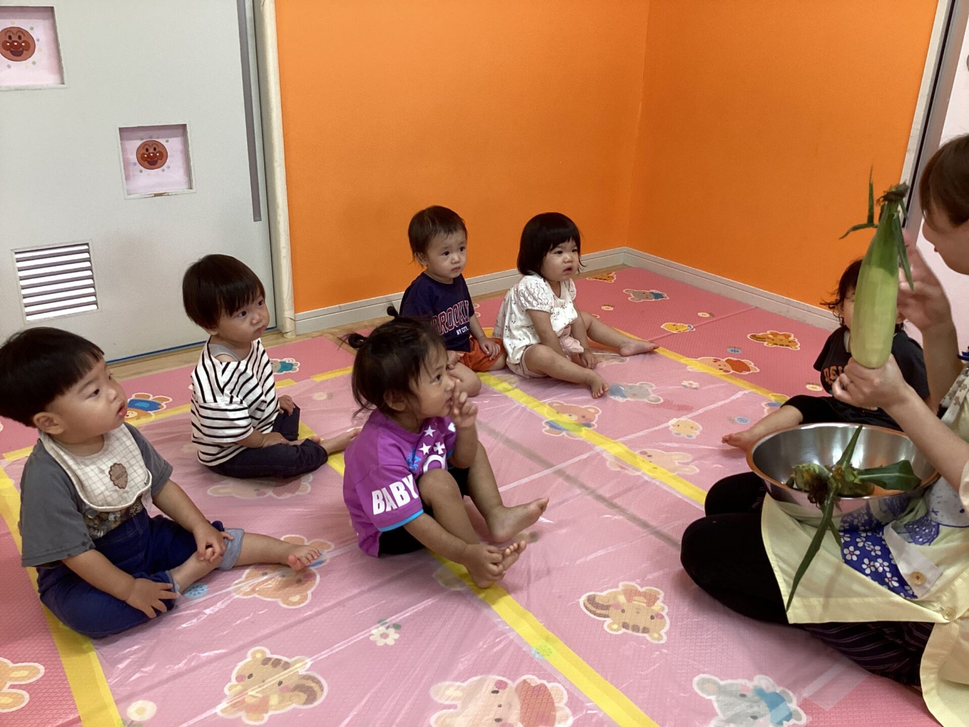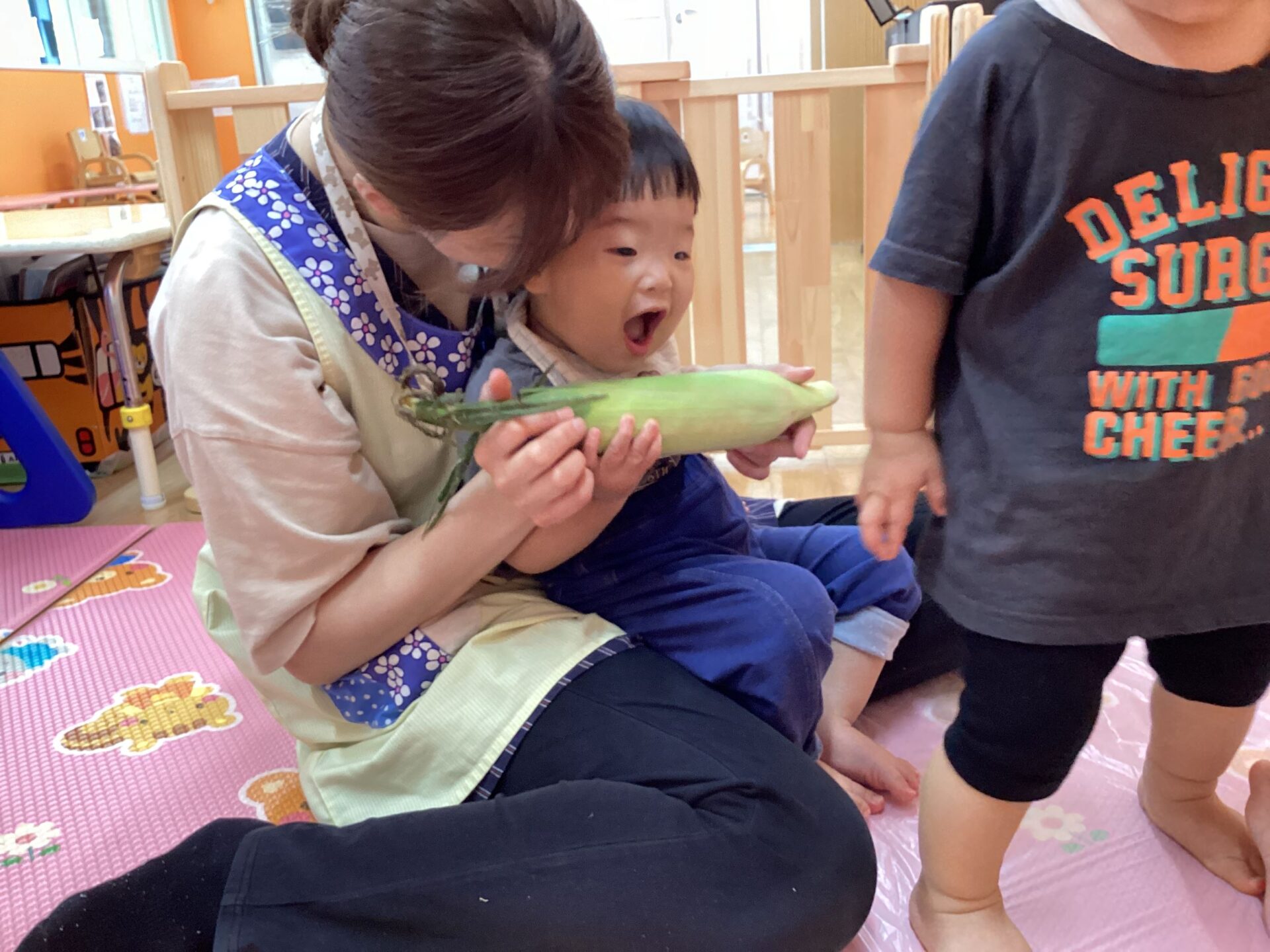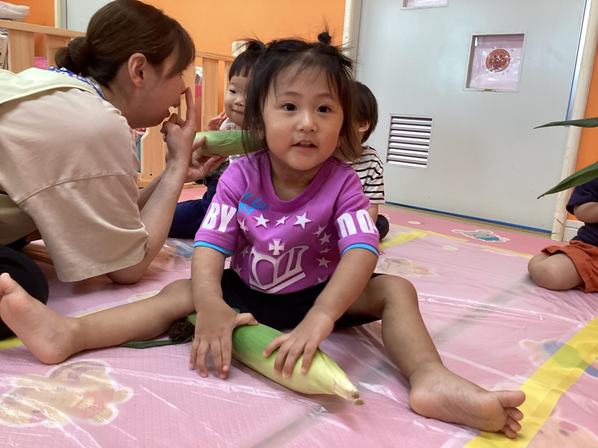 トウモロコシを指先でそっと触ってみたり、優しく抱っこしたり、コロコロ転がしたりと、だんだんトウモロコシに興味が出てきた様子の子どもたちでした🥰