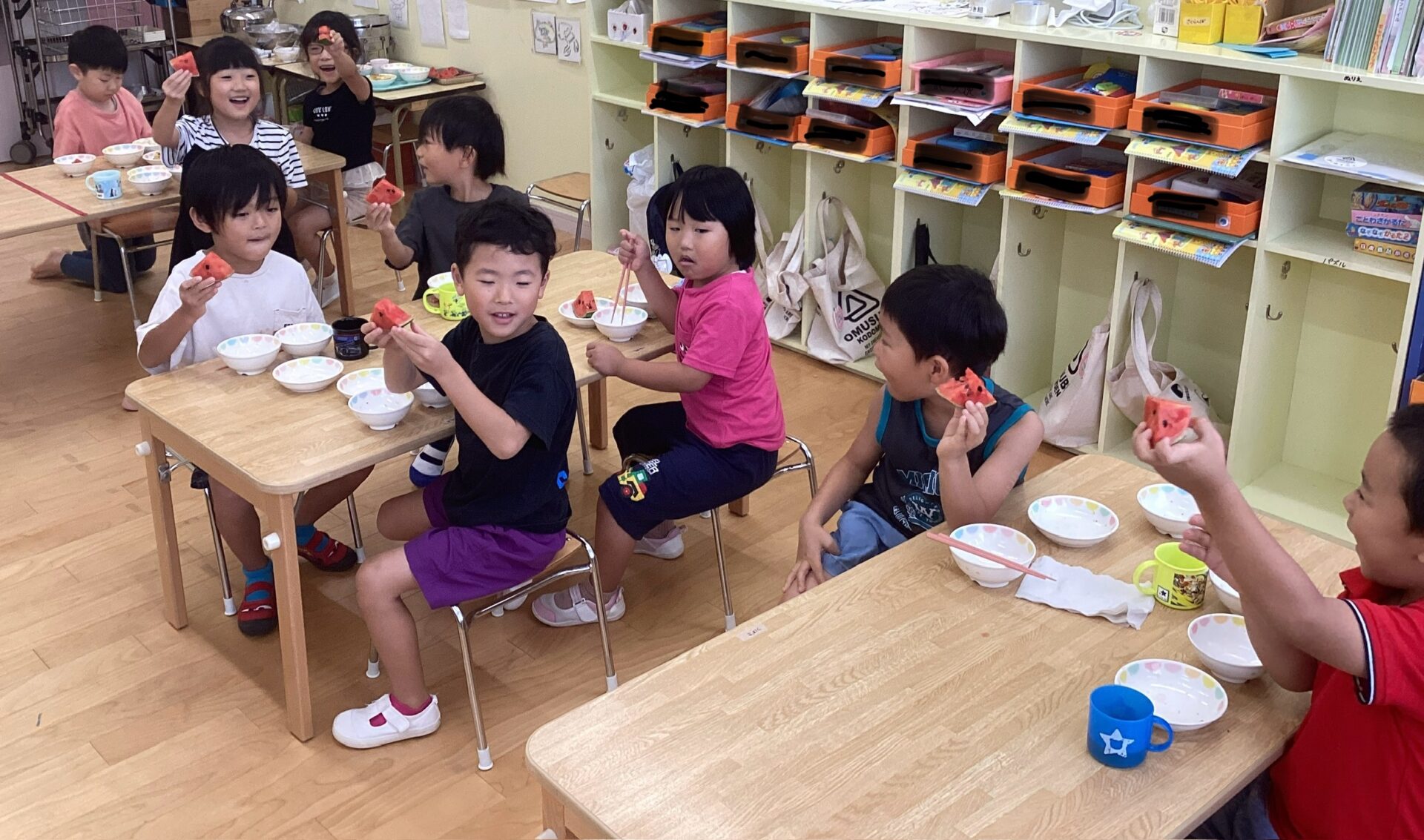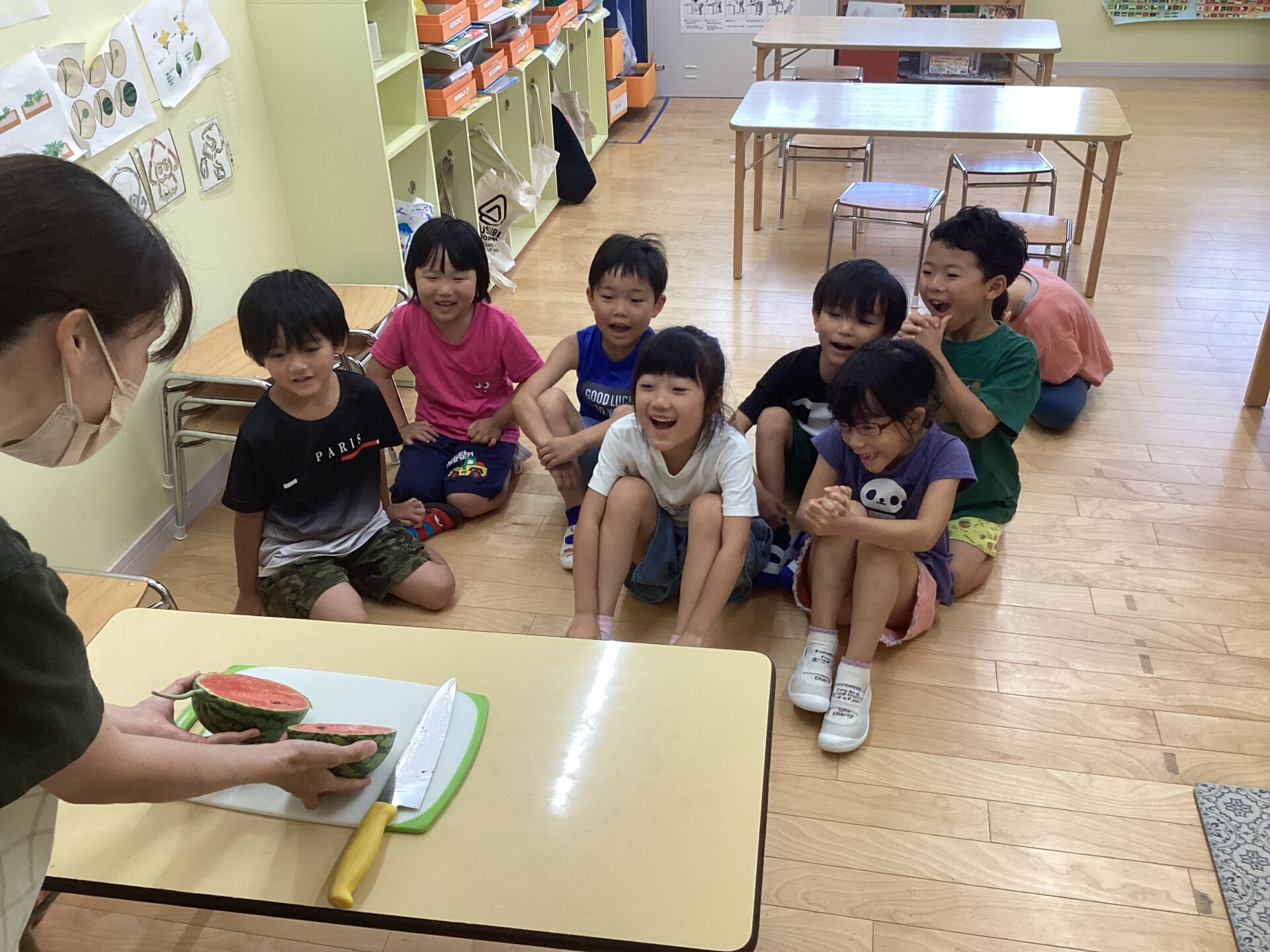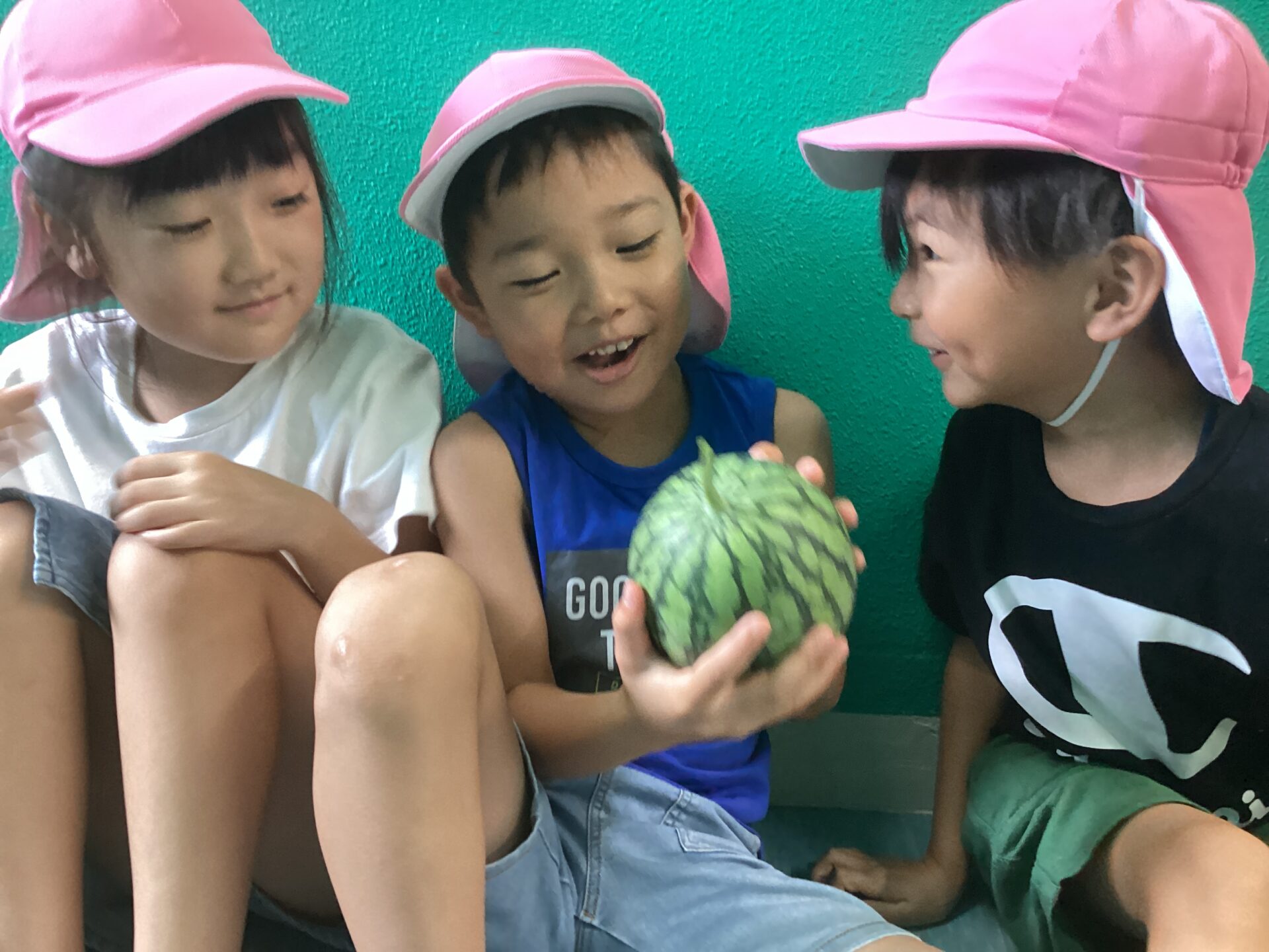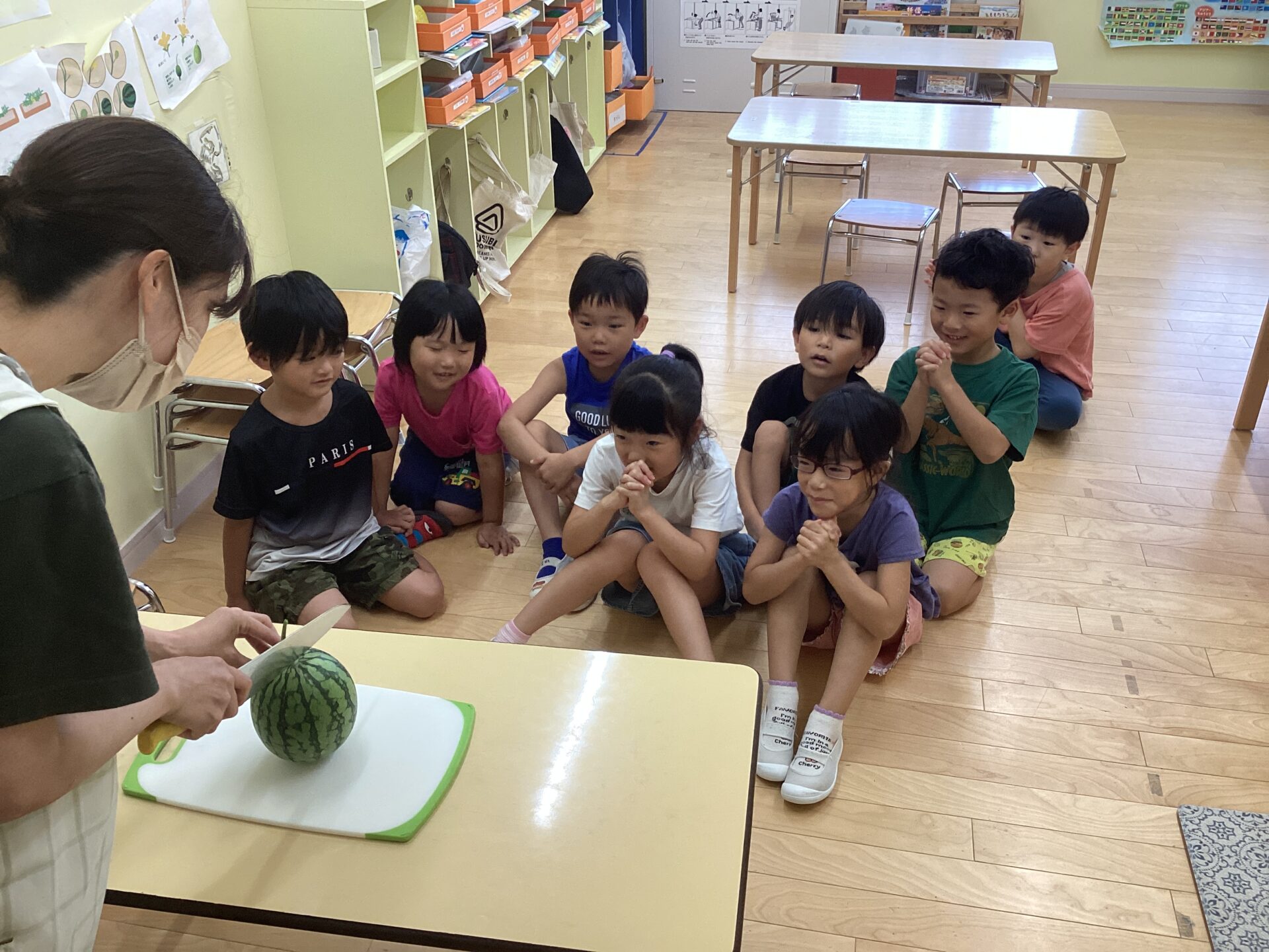 小さいすいかだったので、つきぐみさんしか食べられないことを伝えると「そらぐみさんとゆきぐみさんにも食べさせてあげたいなー」なんて声も聞こえ、すいかの甘さと優しさが沁みるひとときでした❤️