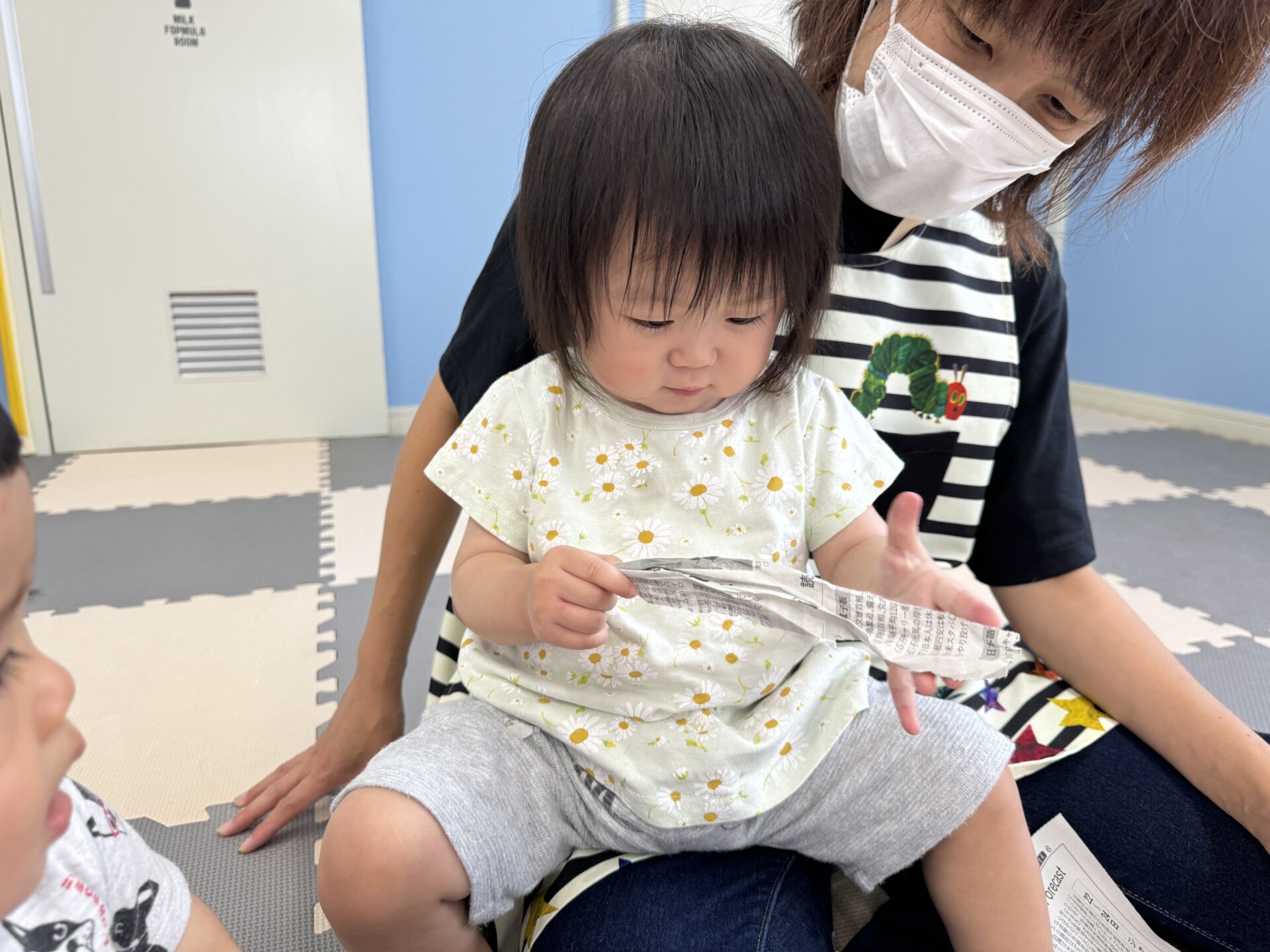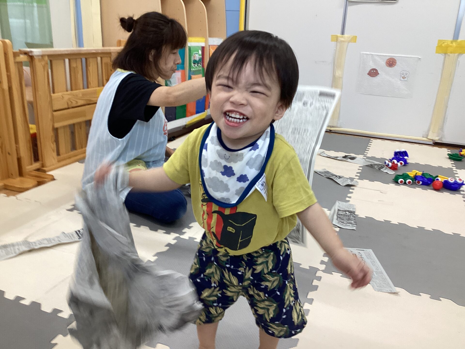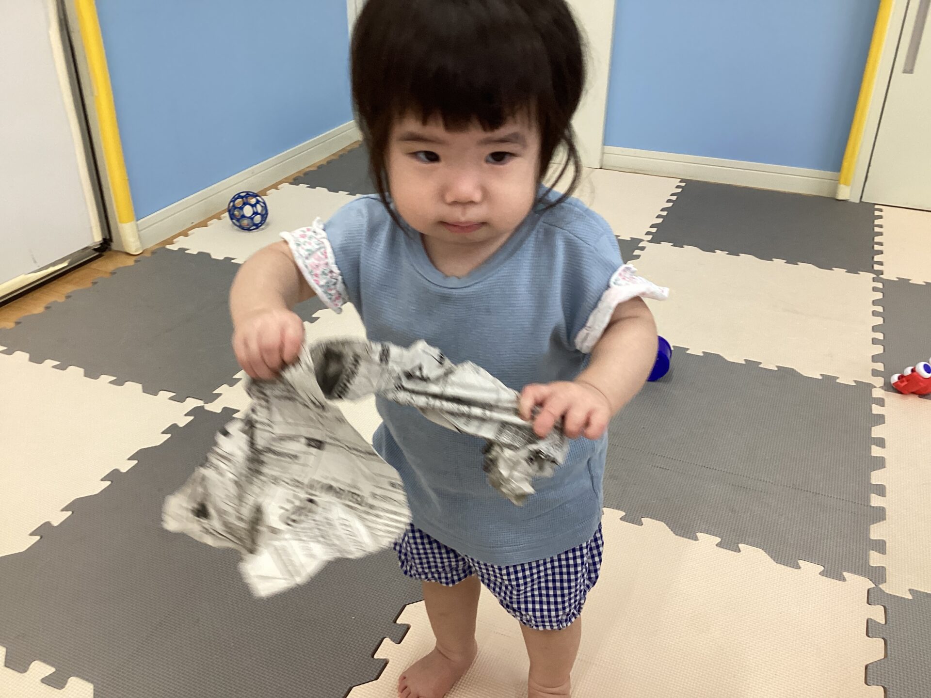 いないいないばあ遊びを楽しんでいると、新聞紙を持って左右に振りだしたお友だち。