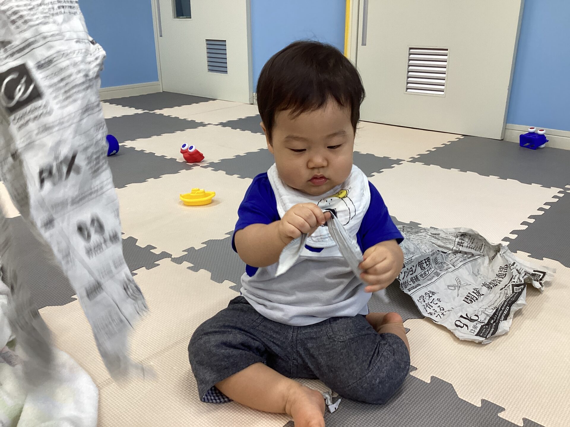 新聞紙遊びをしたよ☺️おむすび組(0歳児)