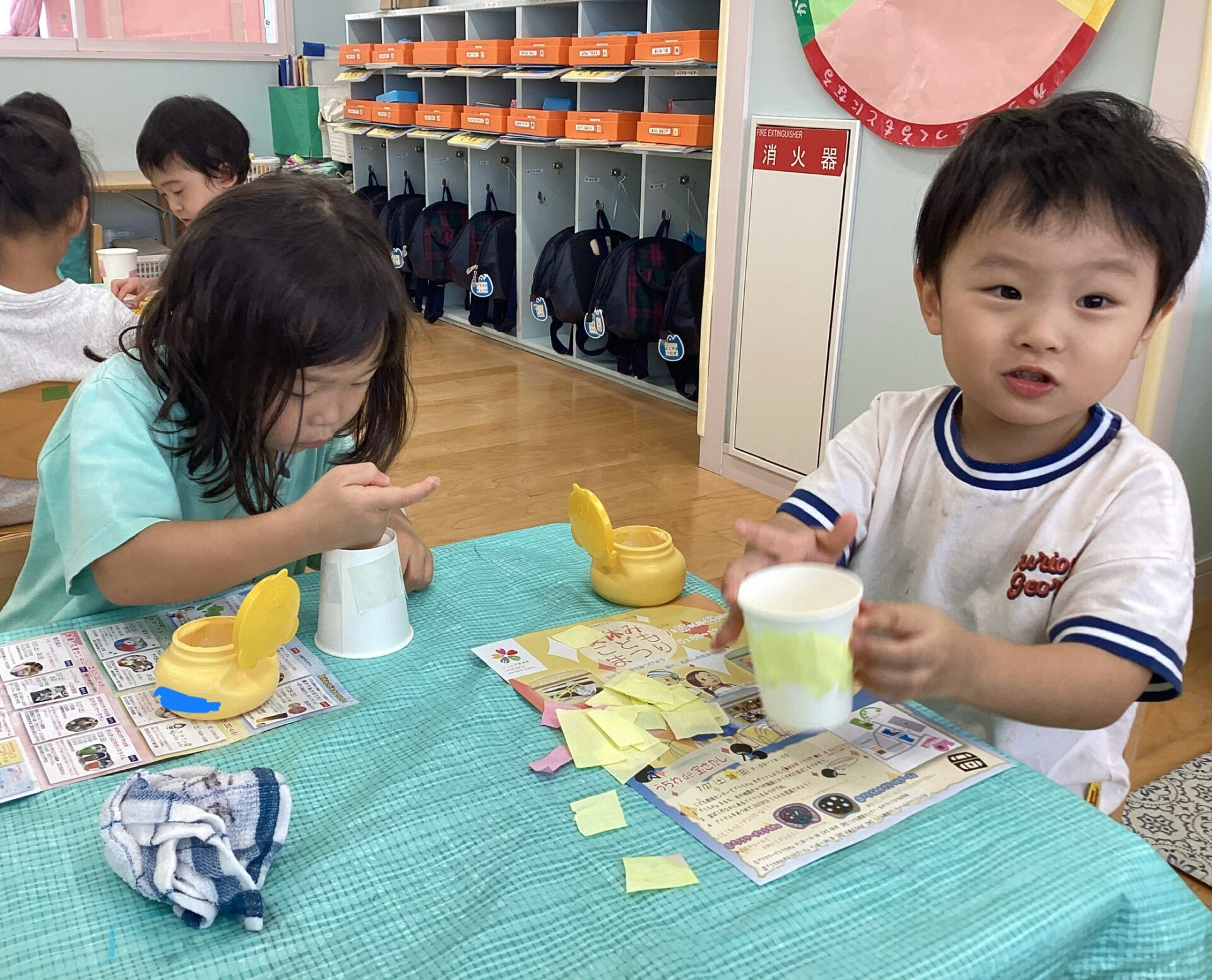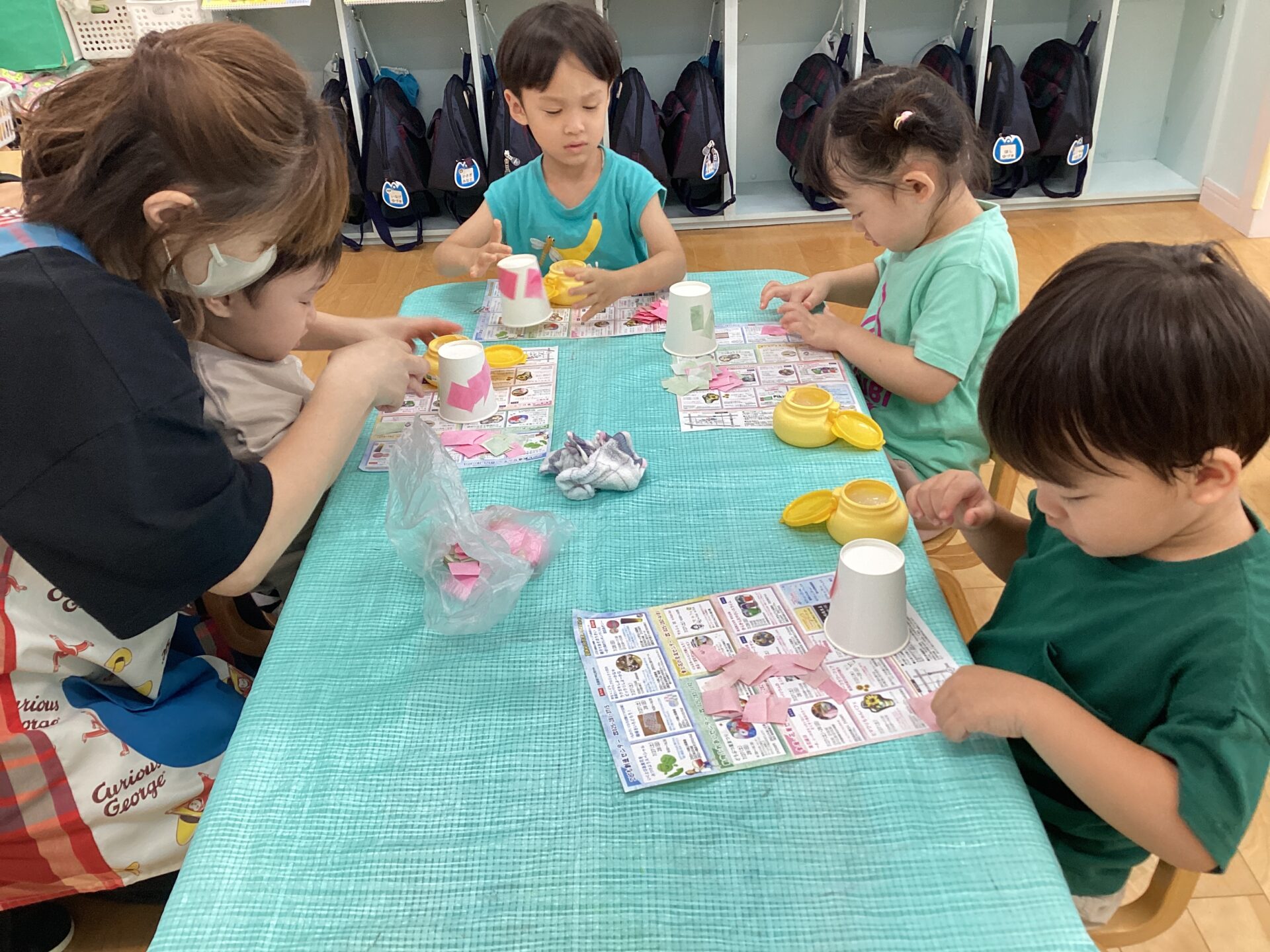 平面ではなく立体の紙コップに貼る作業でしたが、指先を使い慎重に貼り進めていましたよ!