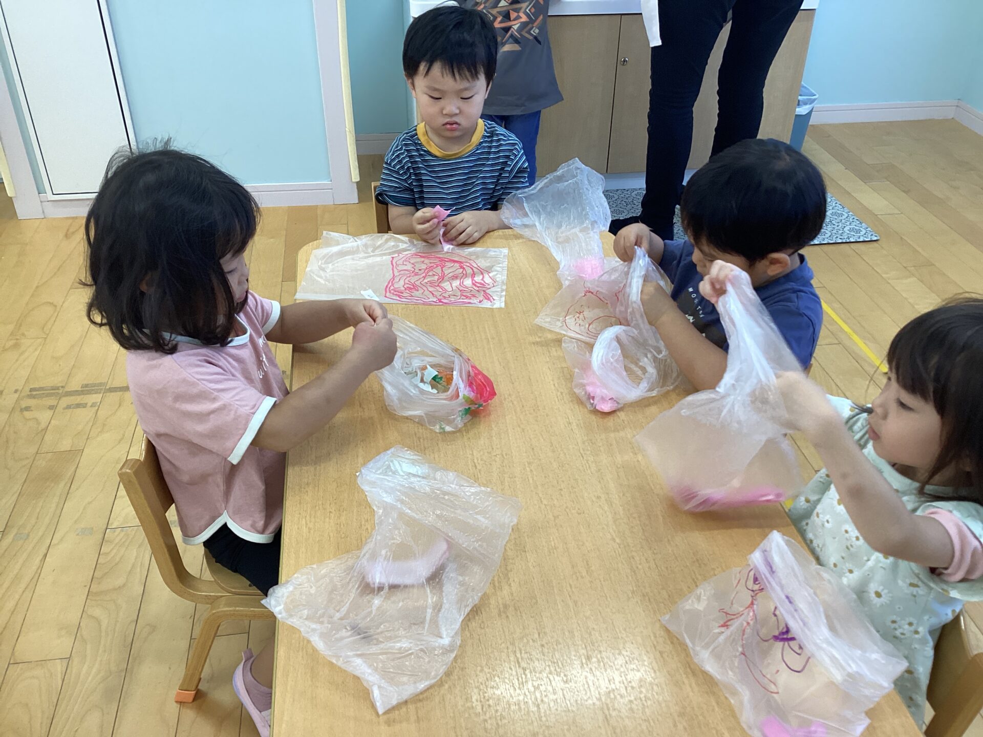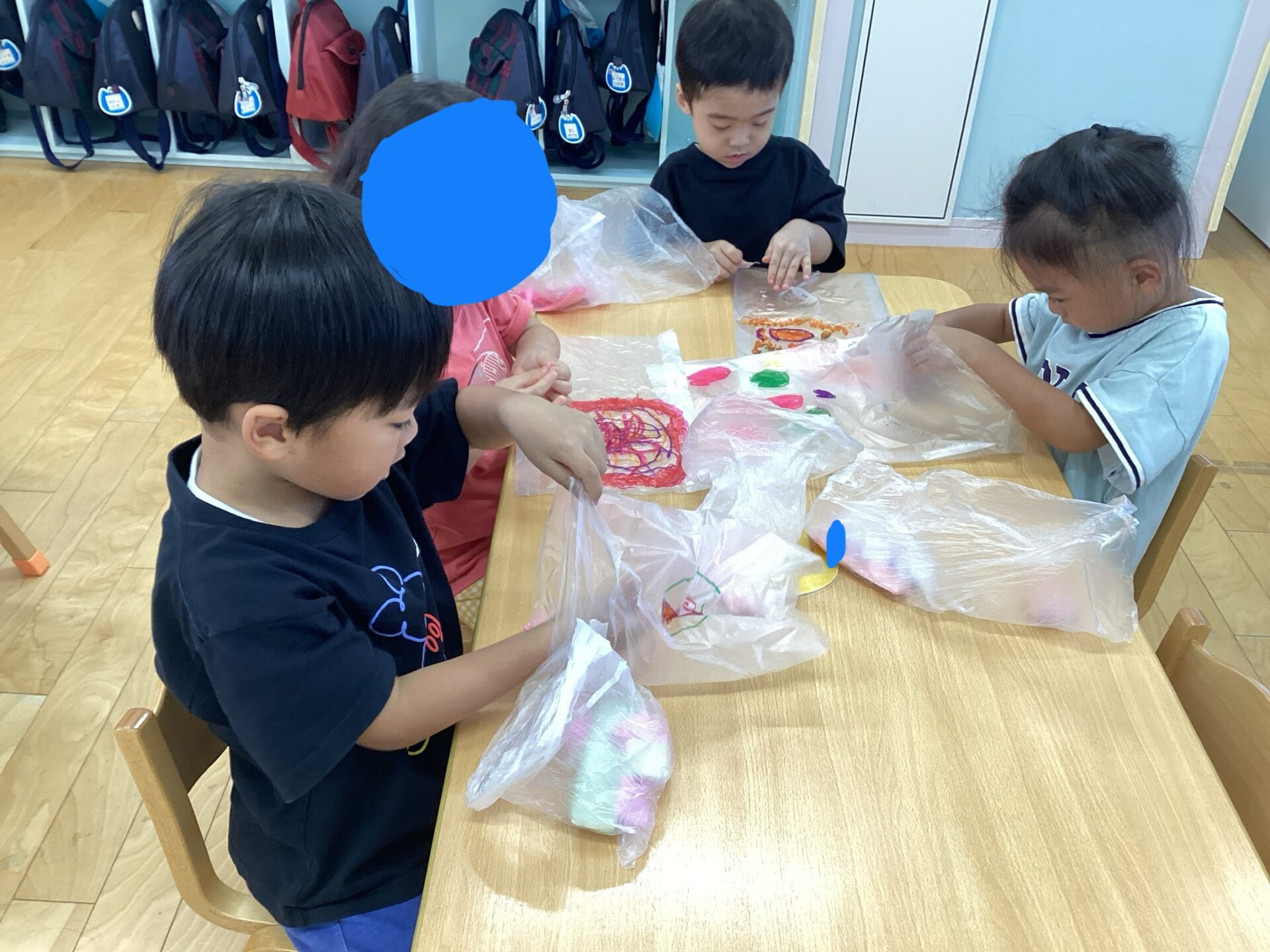 次にビニール袋に油性ペンで自由にお絵描きをしました