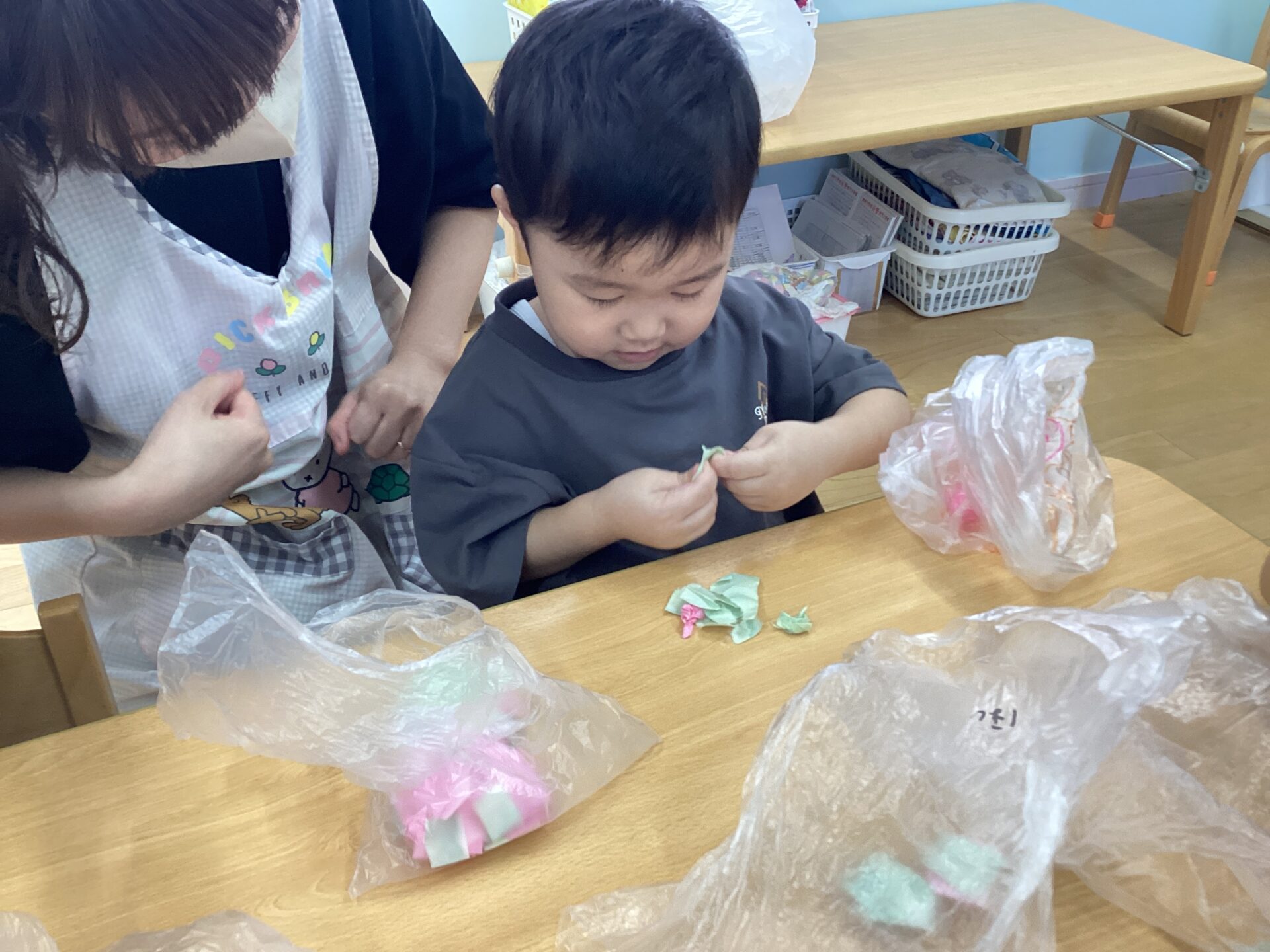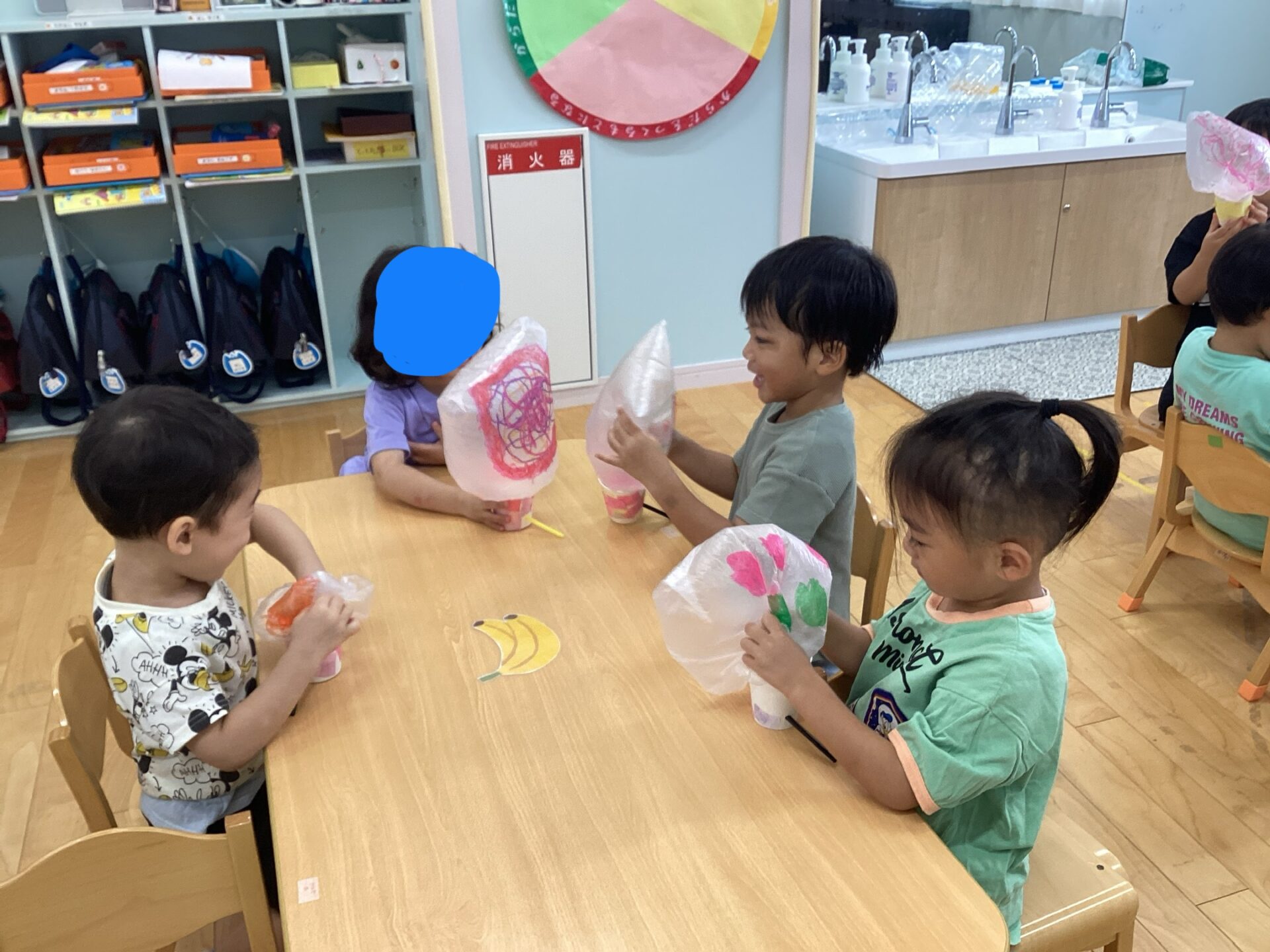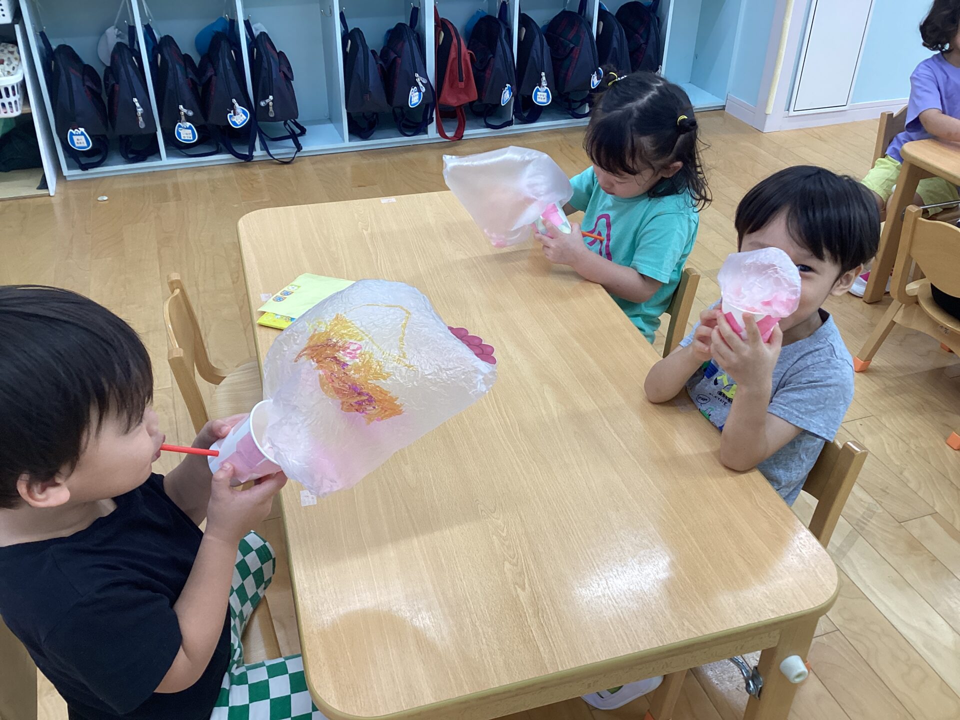 ストローで息を吹き込むと、ビニール袋が膨らみ中に入れた障子紙が舞ったり、描いた絵が出てきたりして大喜びな子どもたち!