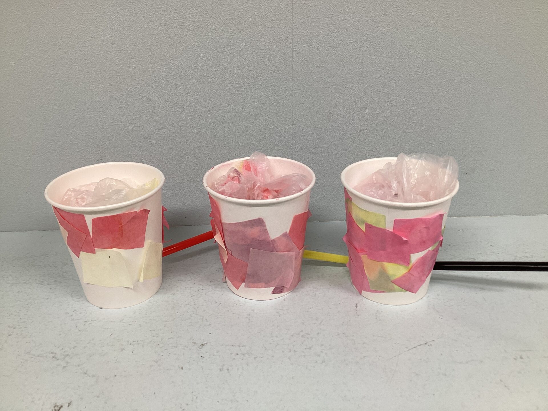 材料は、ストロー、紙コップ、ビニール袋です!