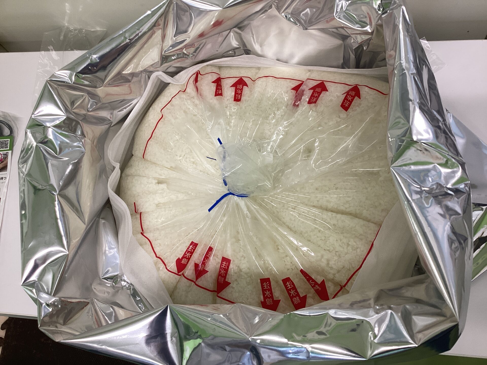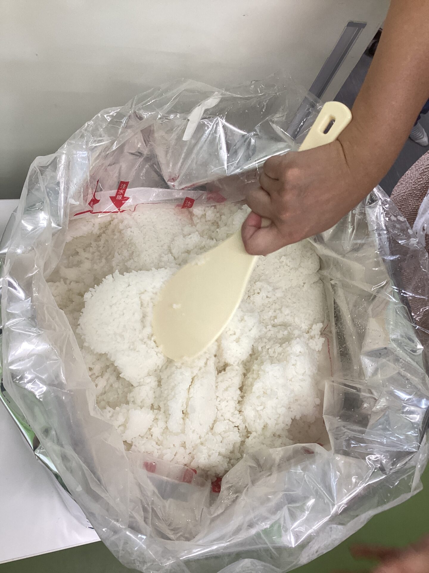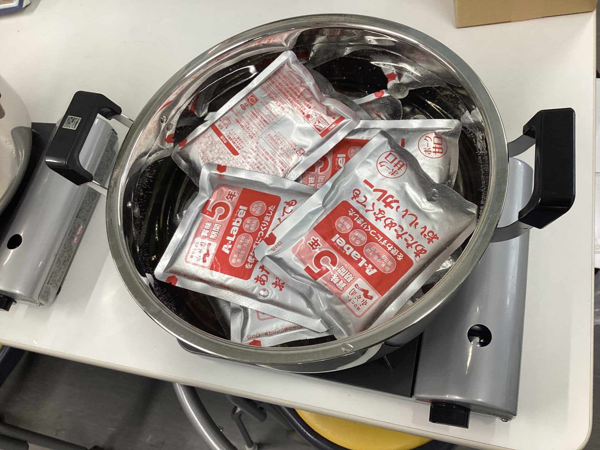 大人50人分の量が出来るアルファー米。熱湯8リットルを入れて、よくまぜます。