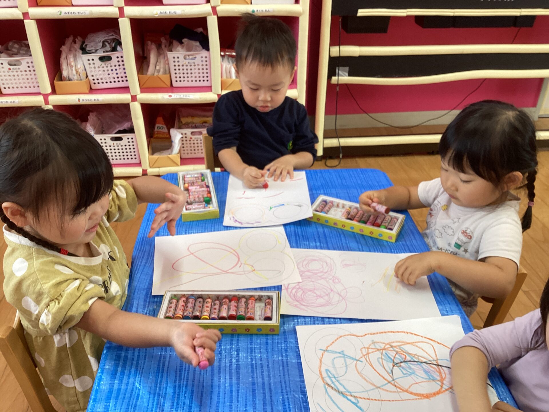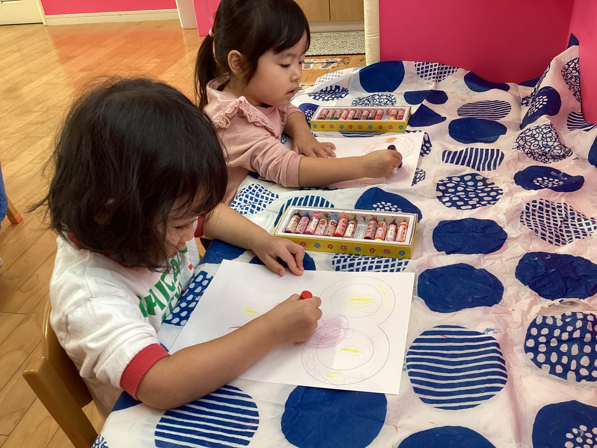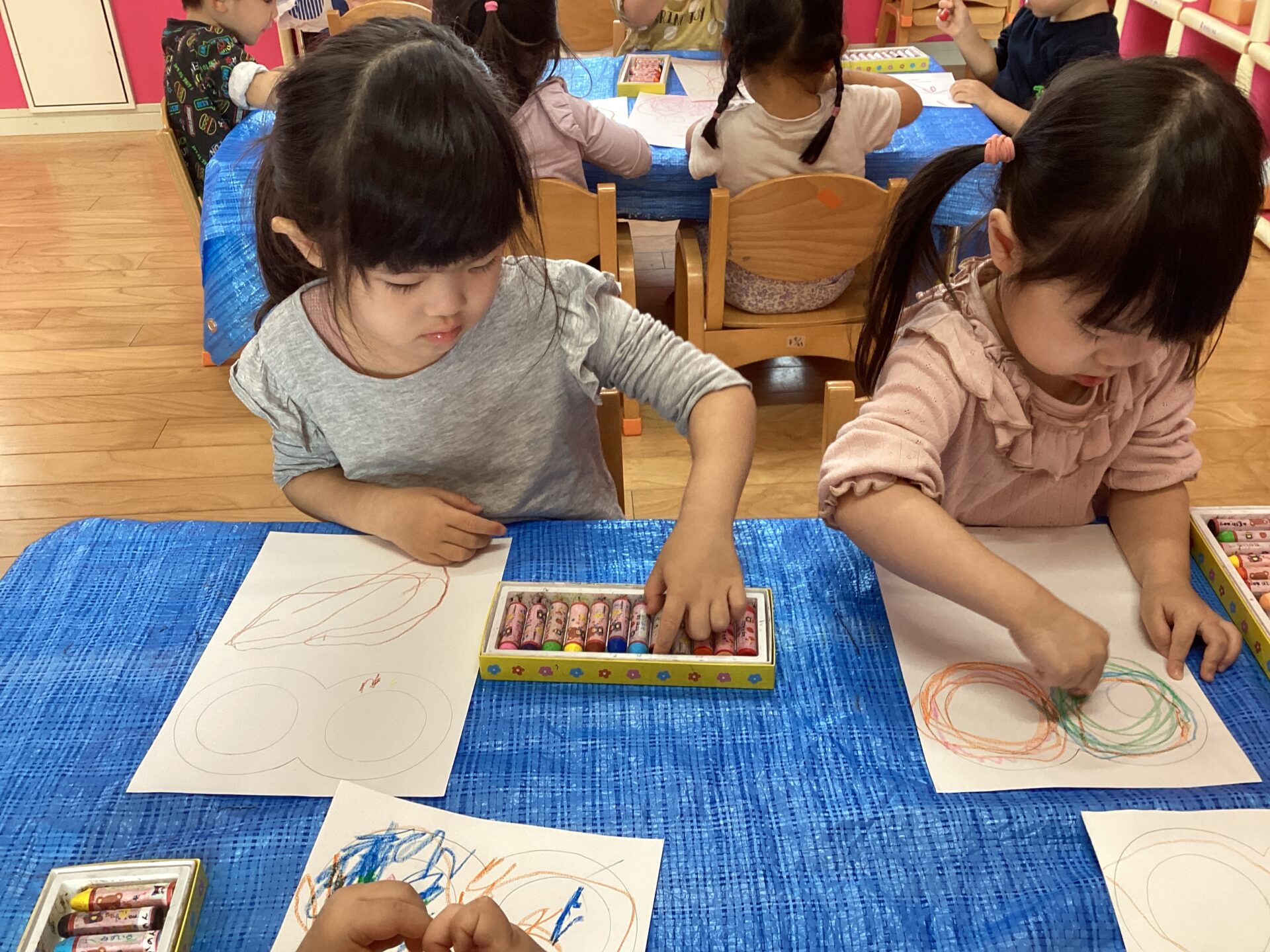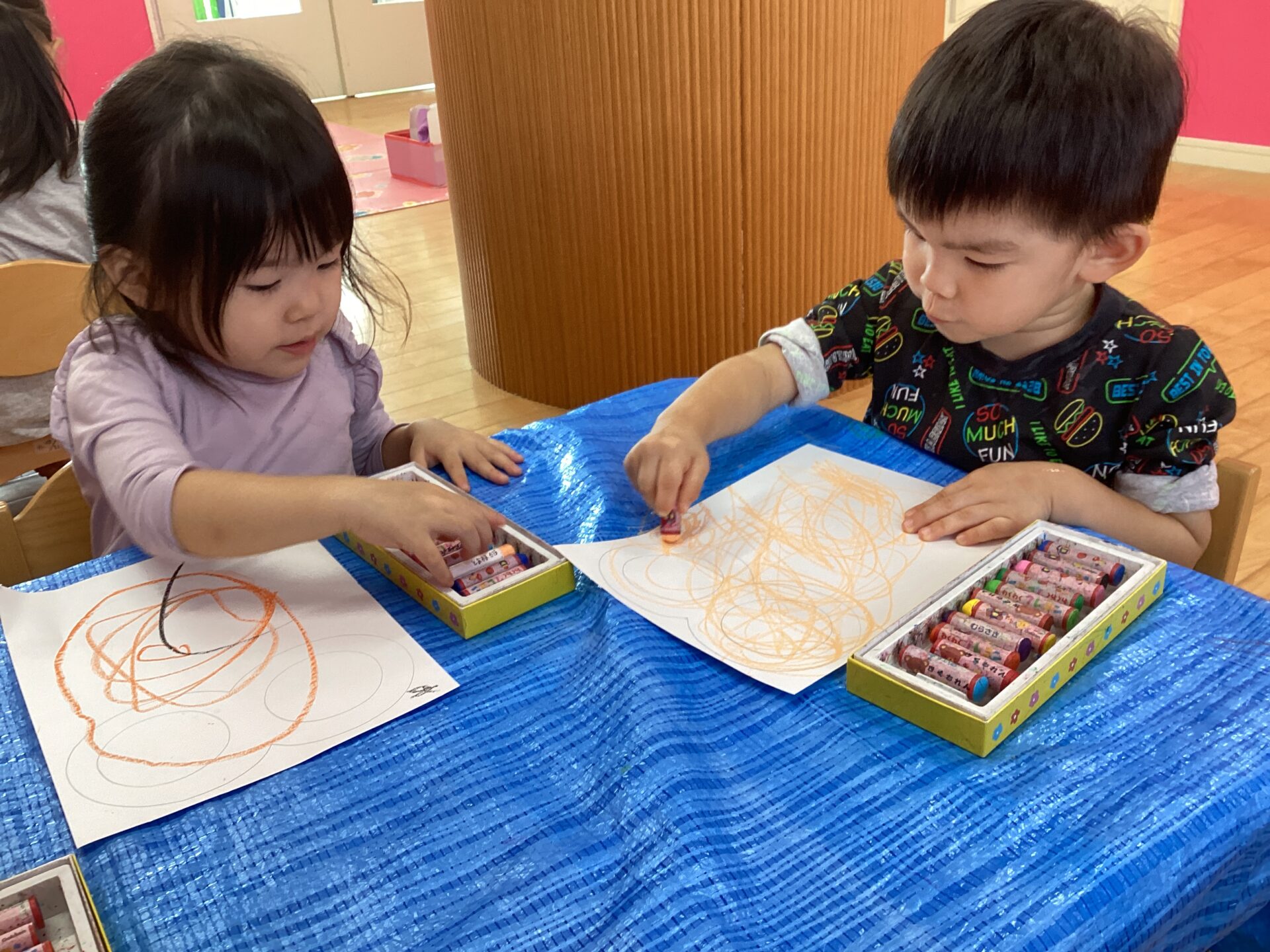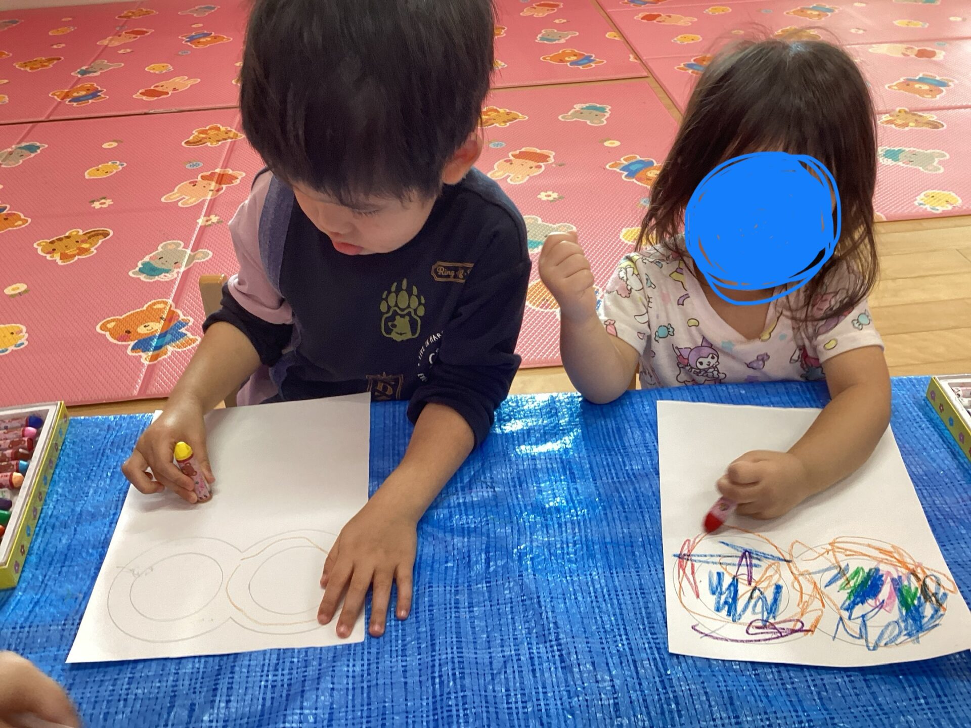 子どもたちはめがねの線の書いてある画用紙にクレヨンでお絵描きをしました😊