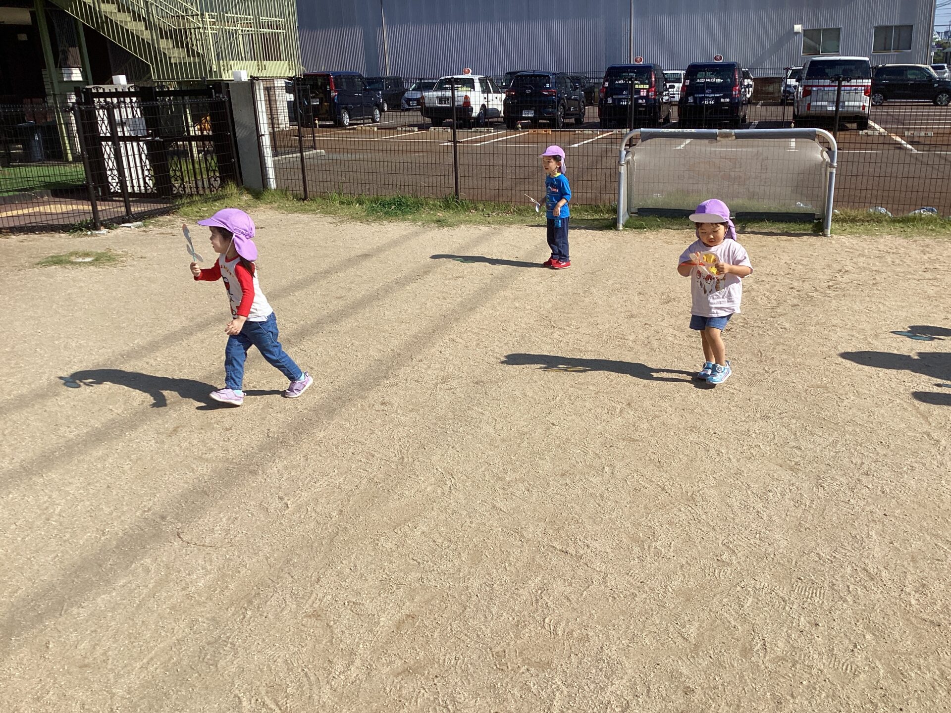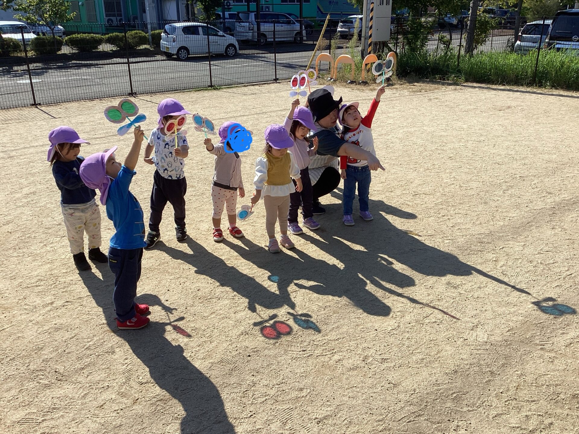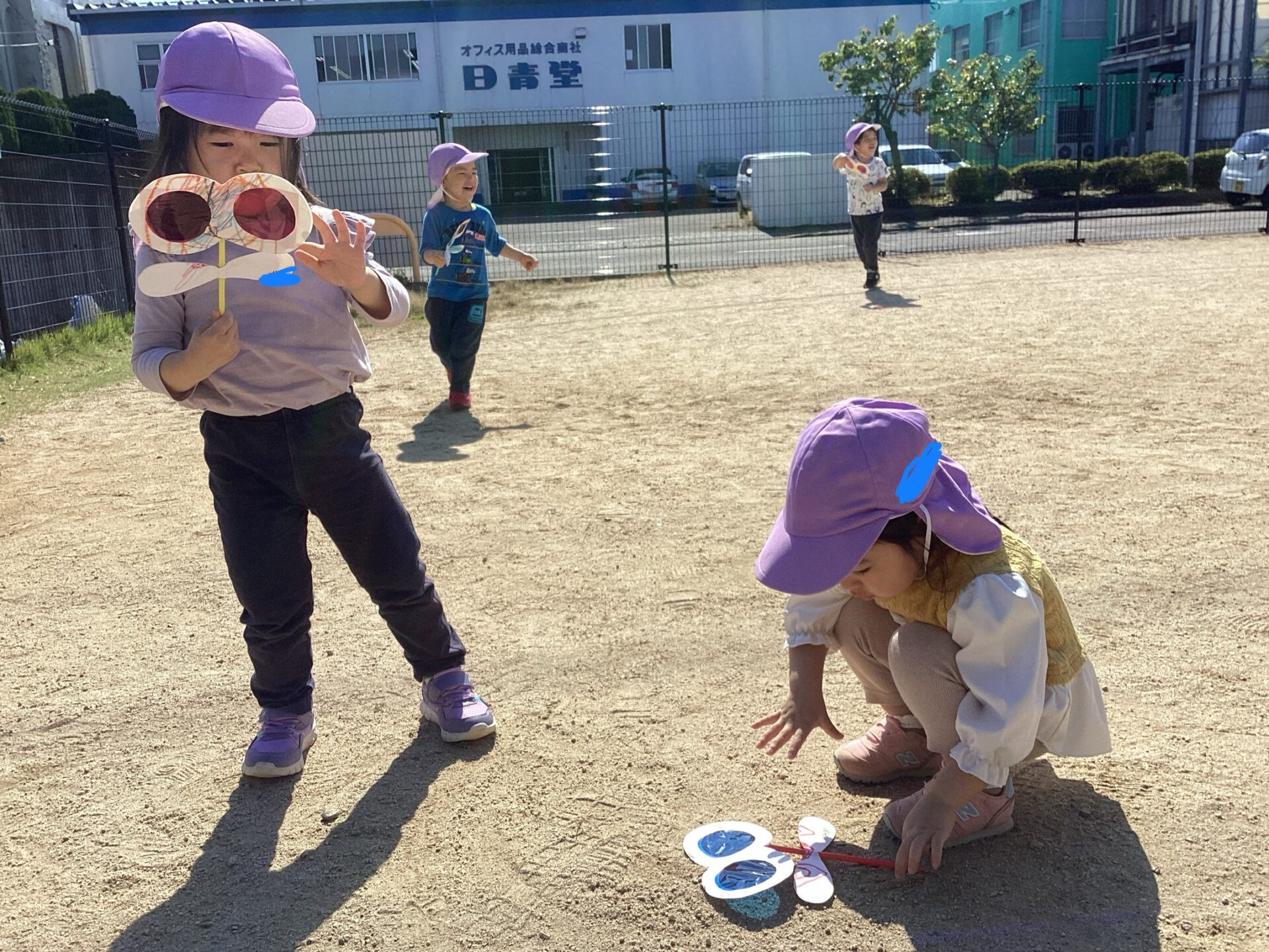 秋晴れの風が心地良い日に、作ったとんぼのめがねを持って園庭に出かけてきました😊