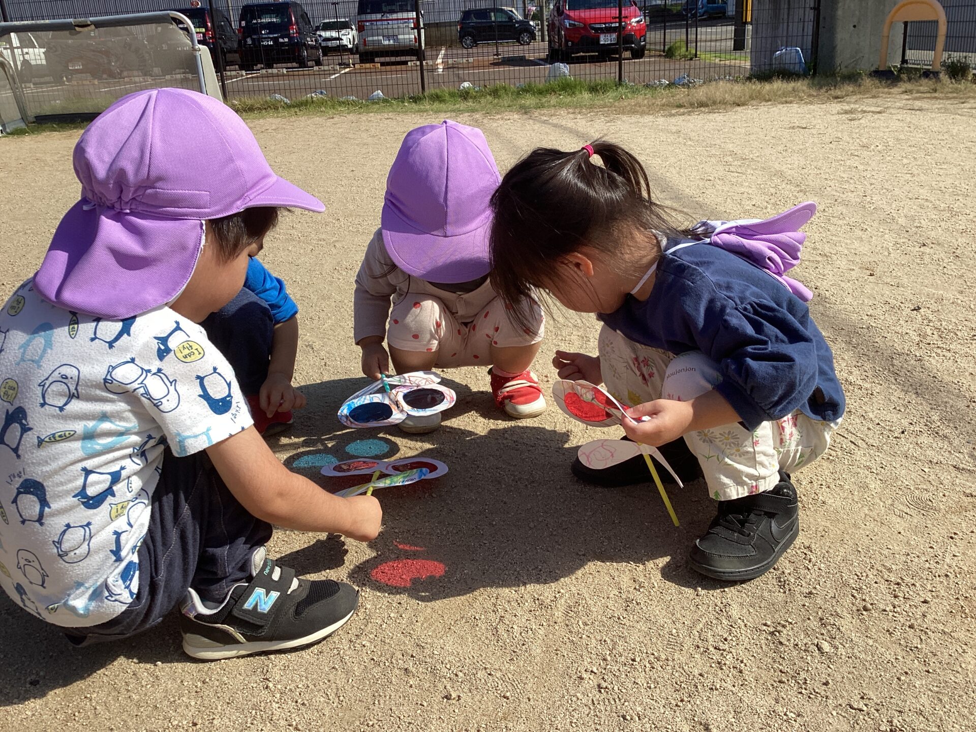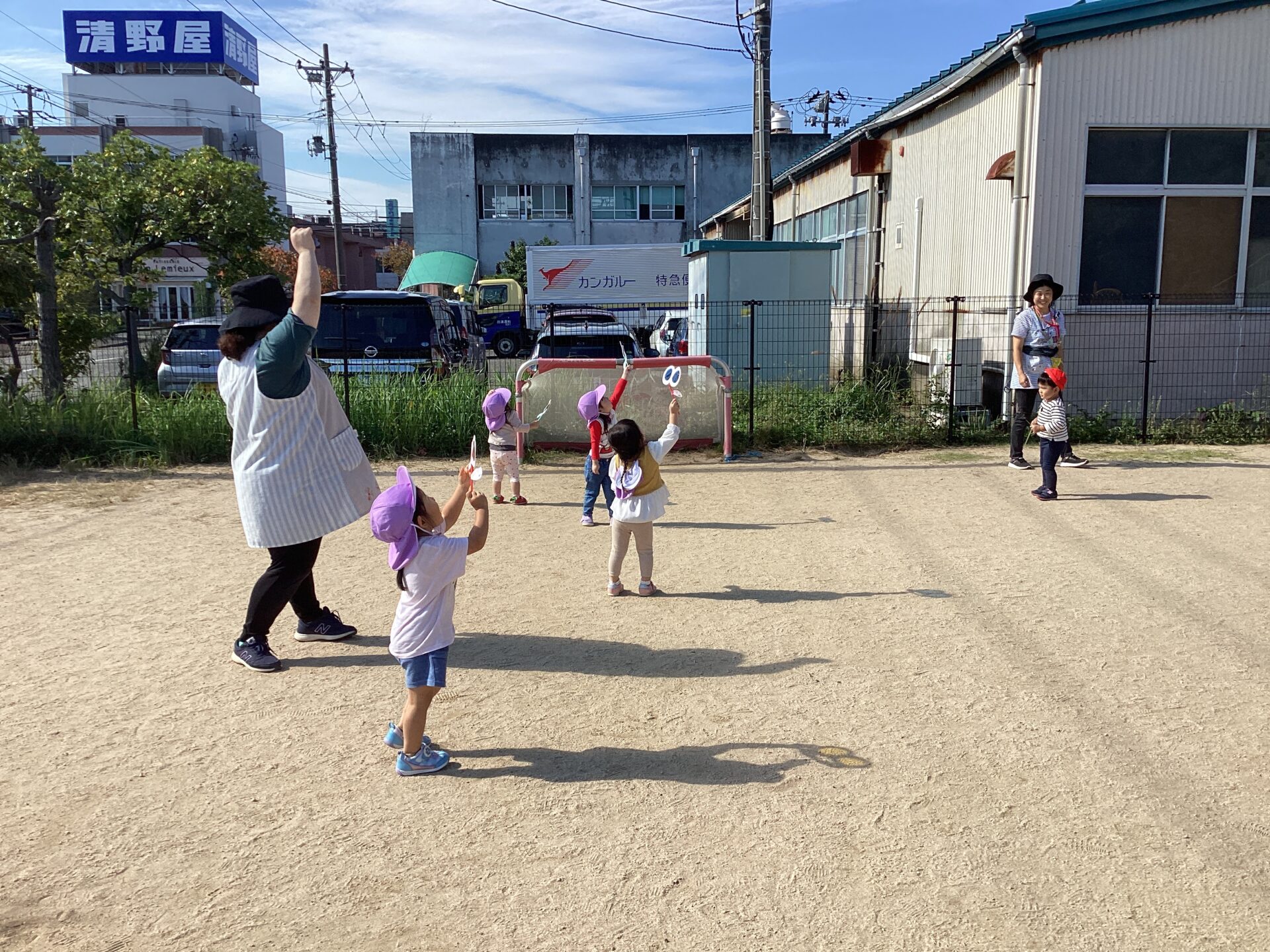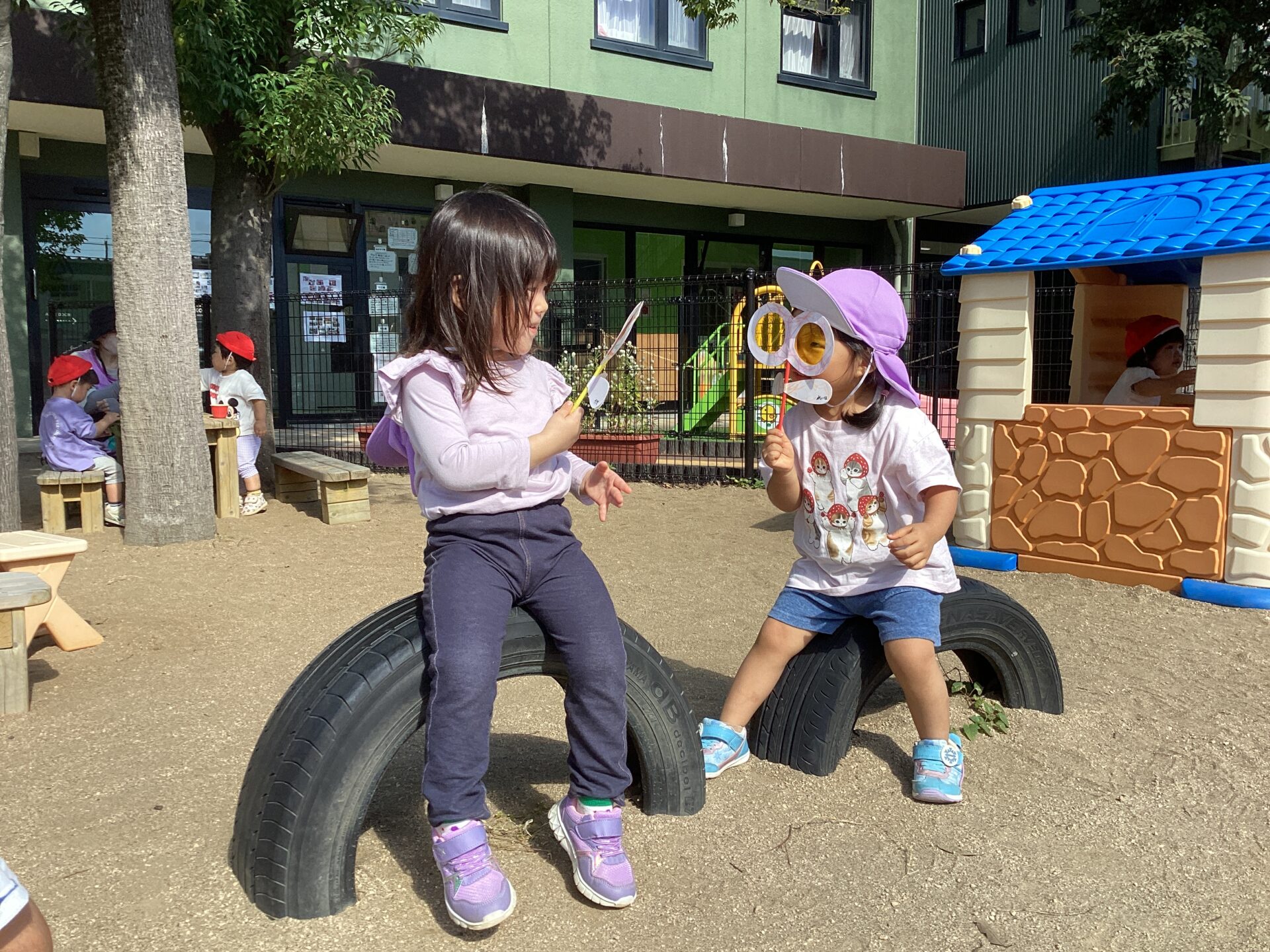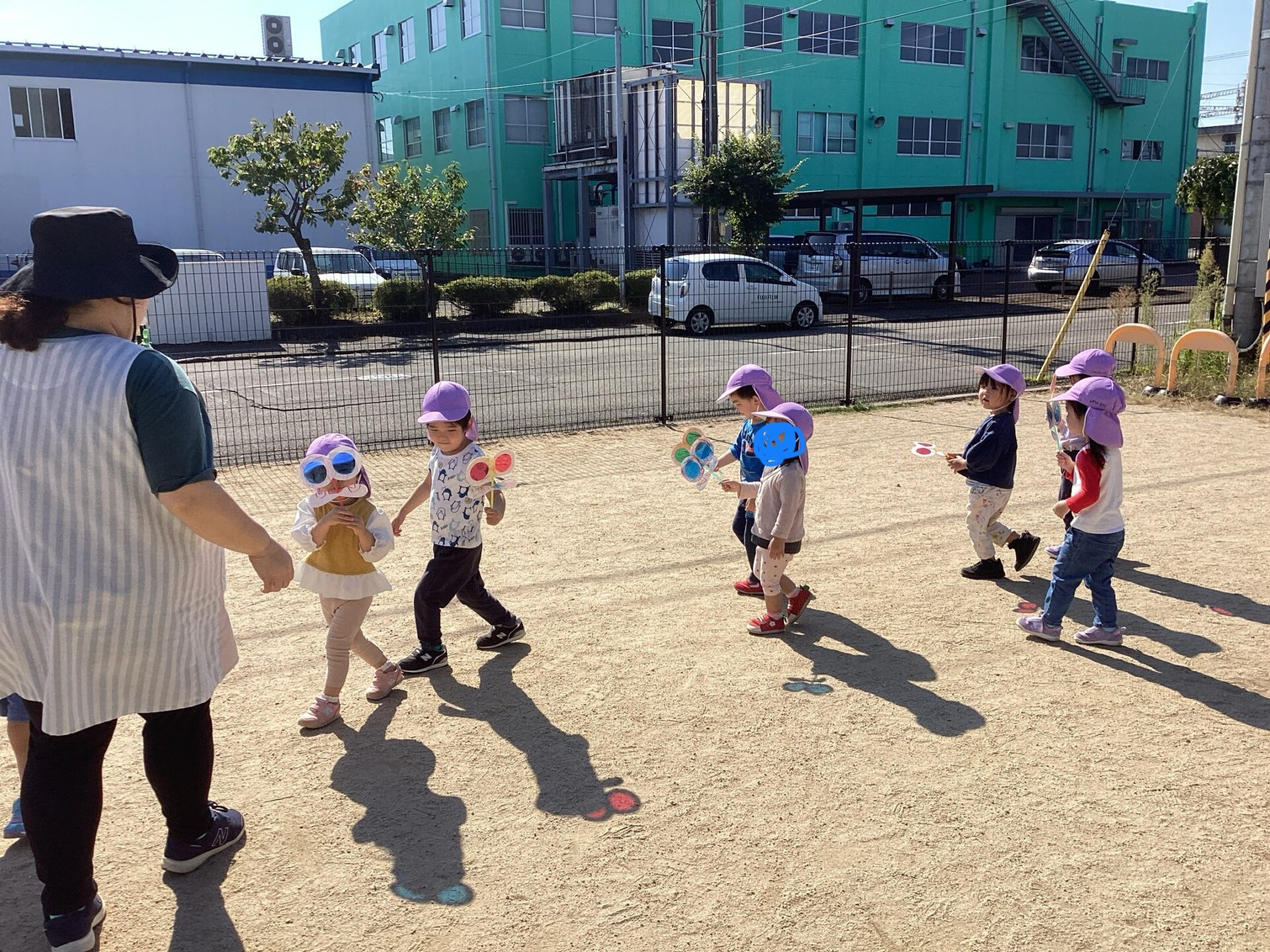 秋晴れの風が心地良い日に、作ったとんぼのめがねを持って園庭に出かけてきました😊