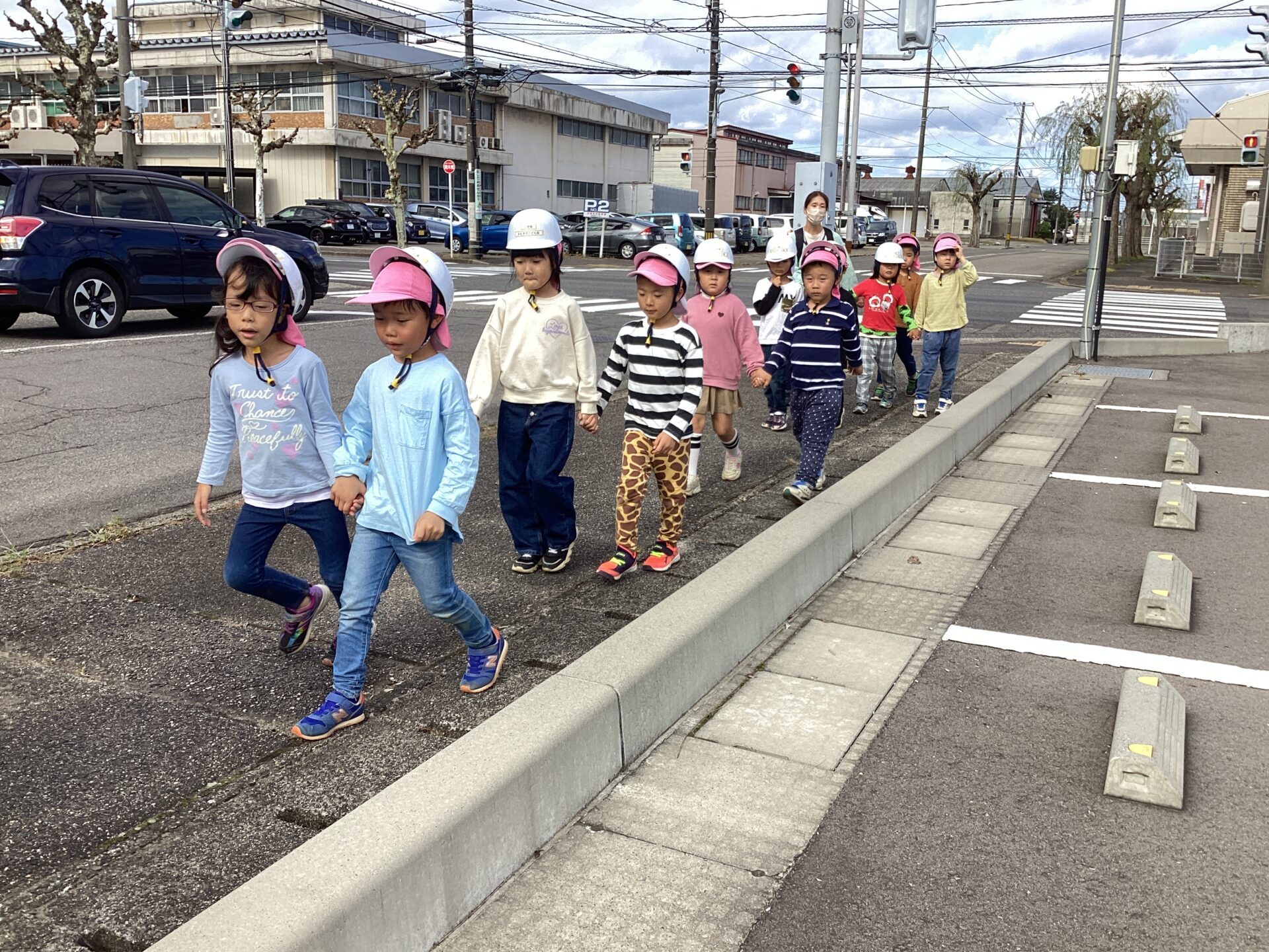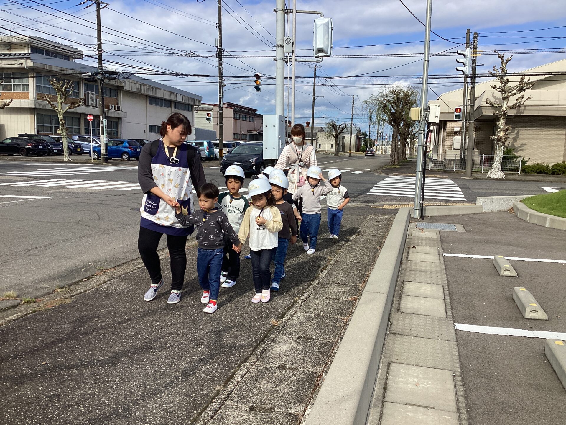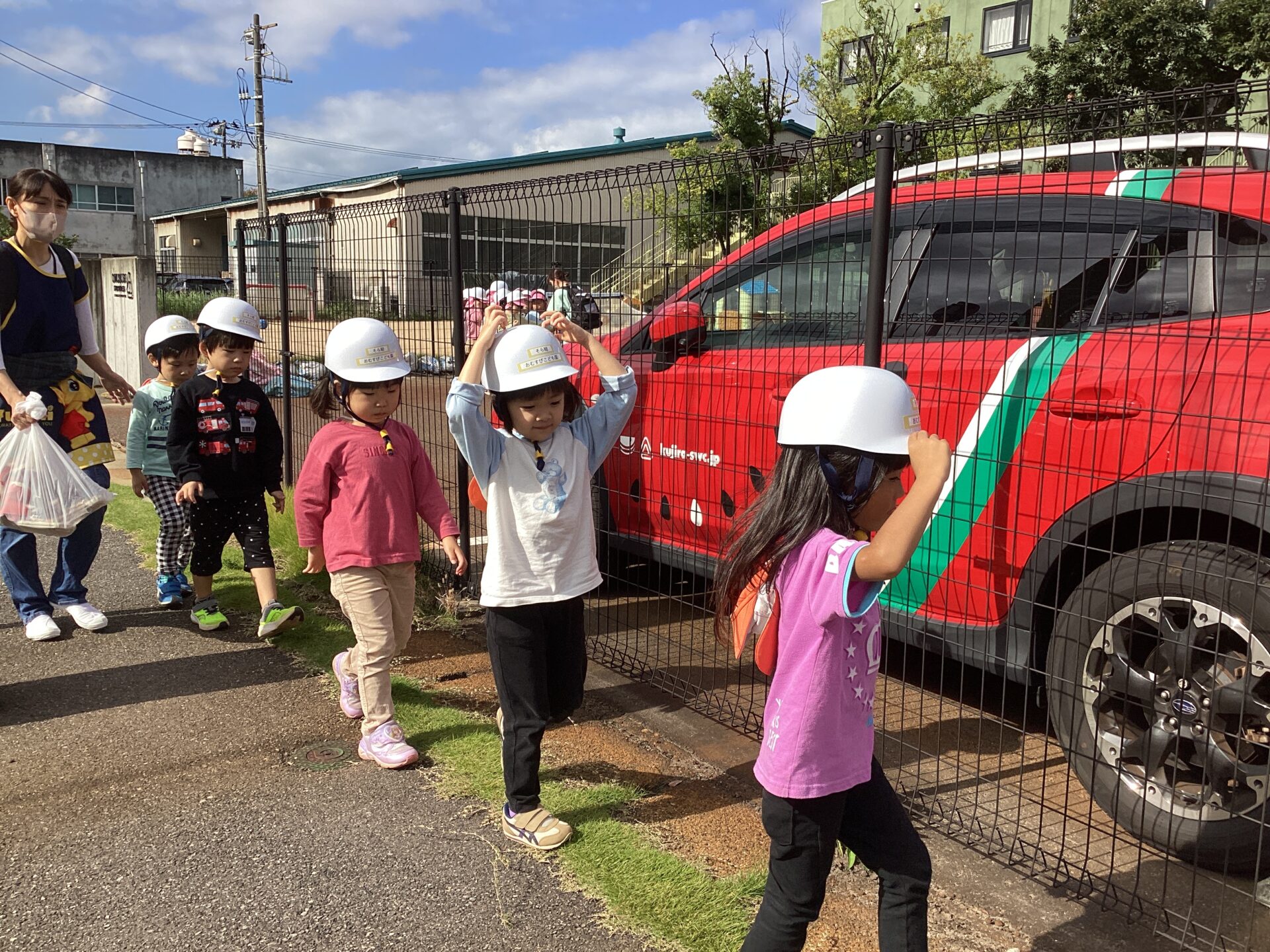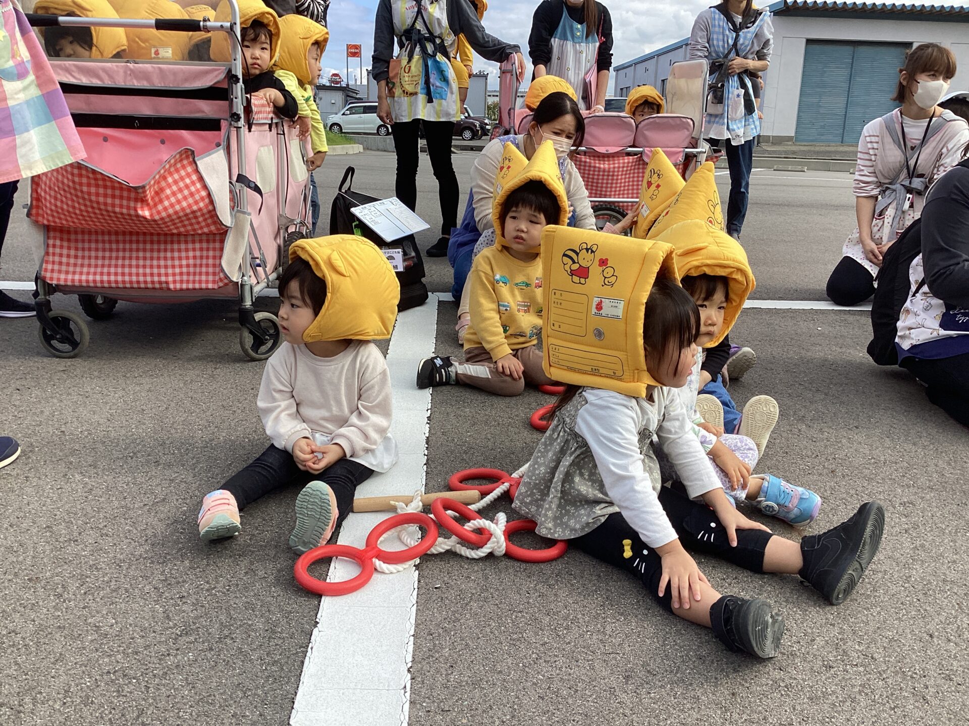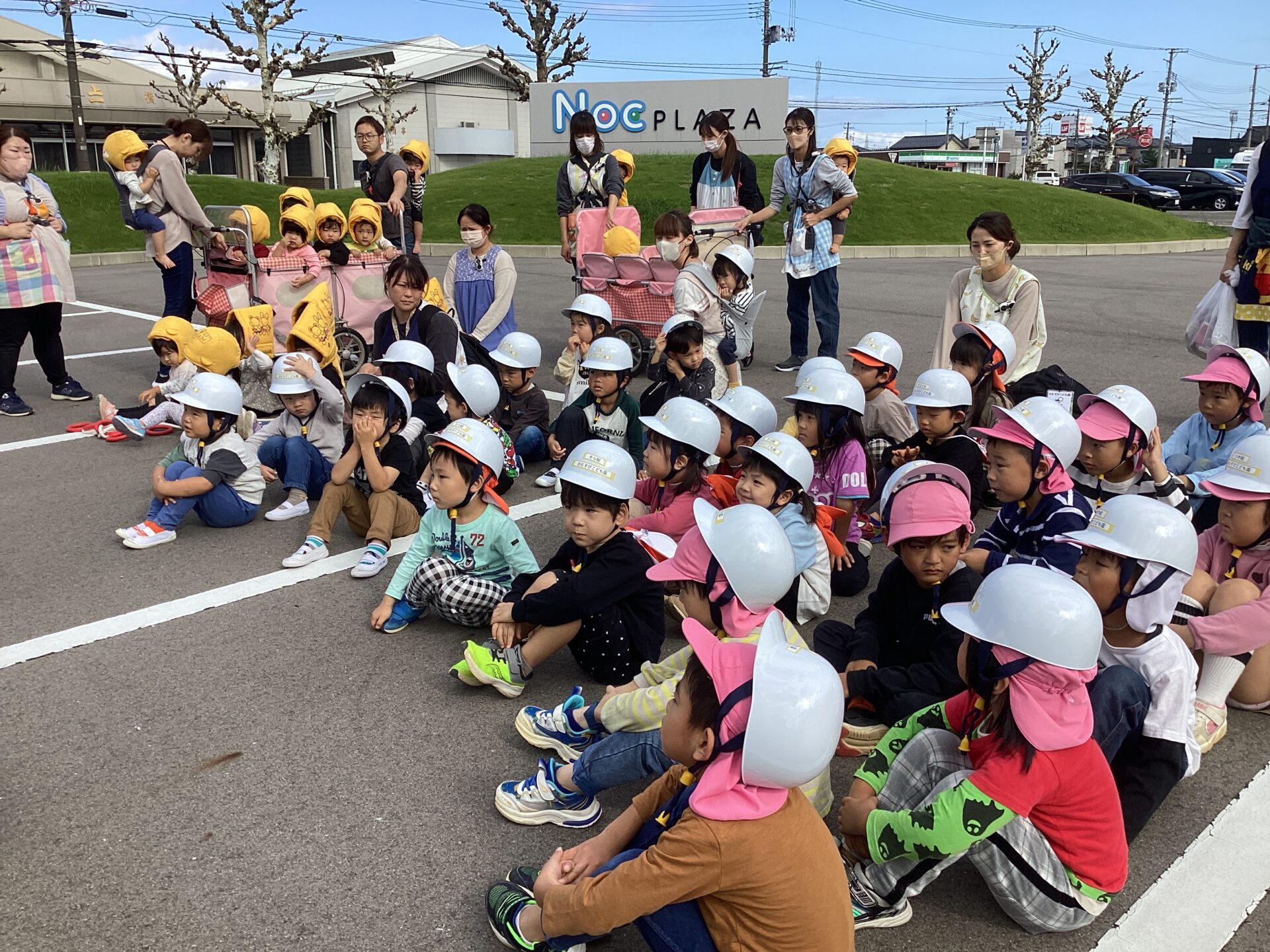 今日は避難訓練がありました😄いつもは駐車場へ避難しますが、今日はN O Cの三角駐車場までの二次避難の練習でした✨全園児での大移動は大変でしたが、以上児の子どもたちはとても真剣に避難の意味を受け止めてくれたようで頑張って歩いていましたよ😃未満児クラスのお友達も防災頭巾をしっかり被りゆっくり歩いたり、避難カートに乗って風を感じたりしながら避難することができました🩷