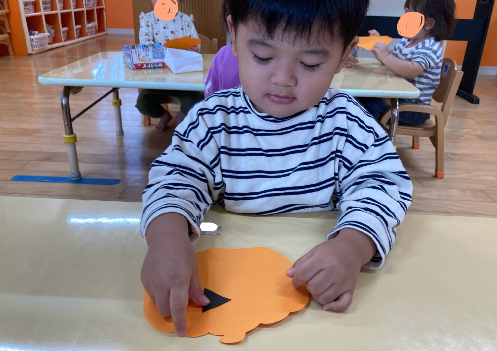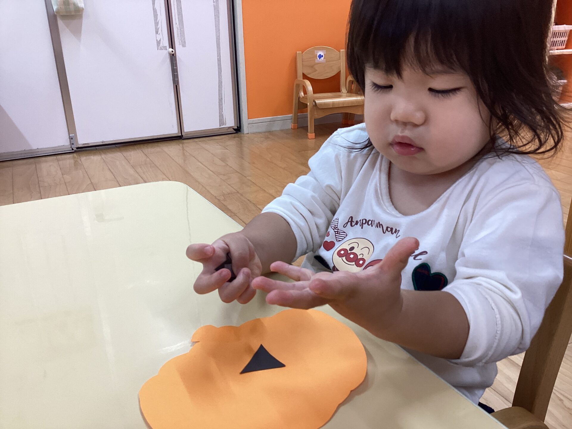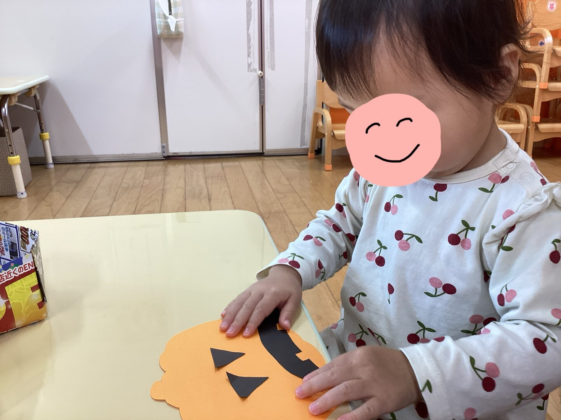 自分の指にかばちゃおばけの目や鼻がくっついてしまい台紙に貼ることがとても難しいようでした。