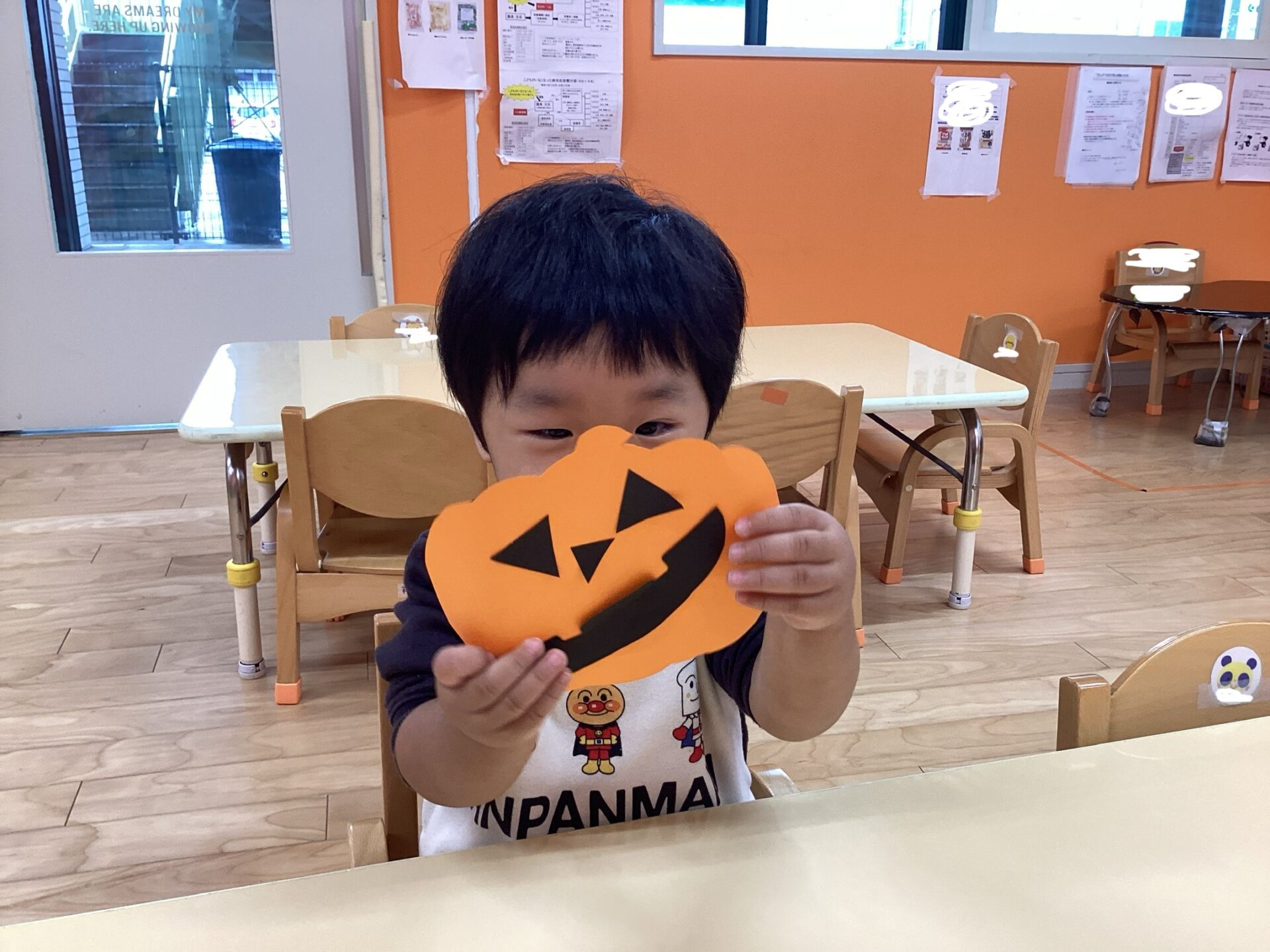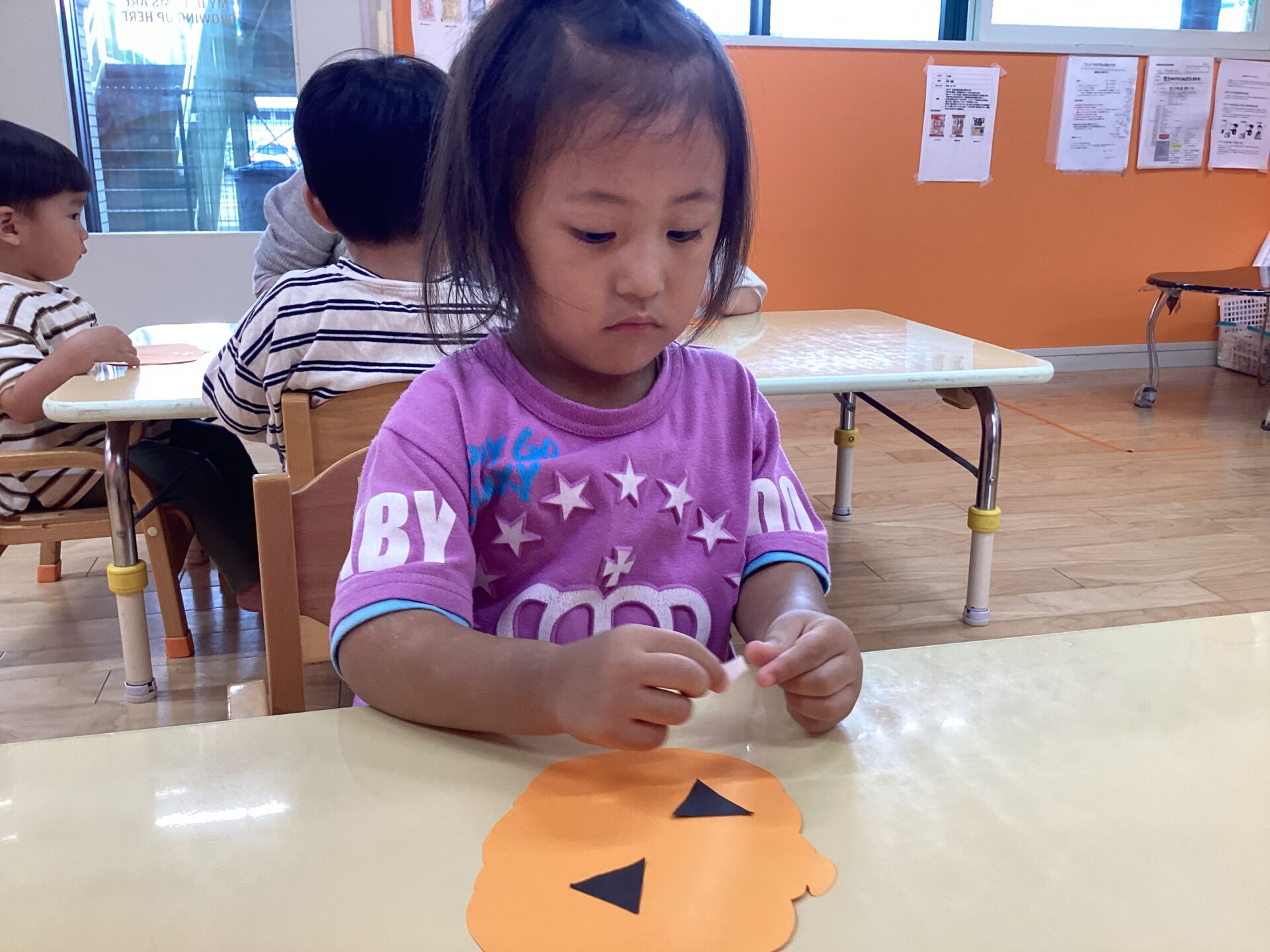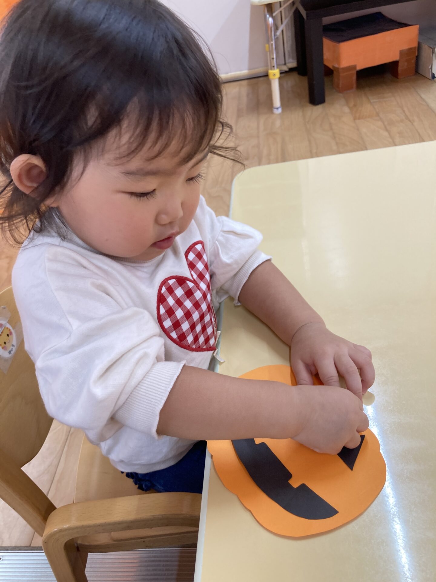 自分の指にかばちゃおばけの目や鼻がくっついてしまい台紙に貼ることがとても難しいようでした。