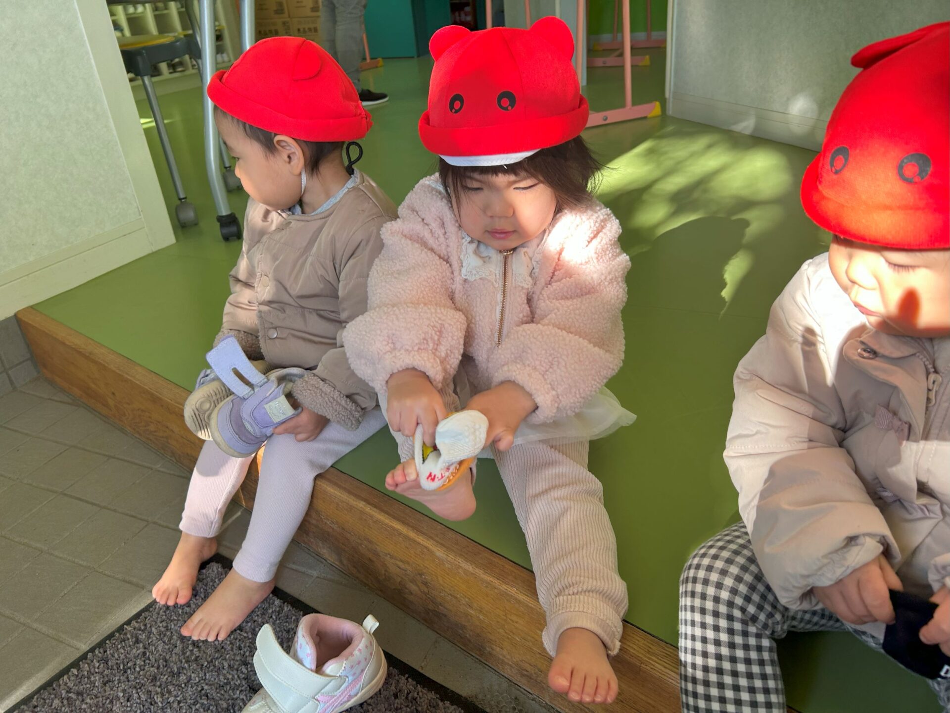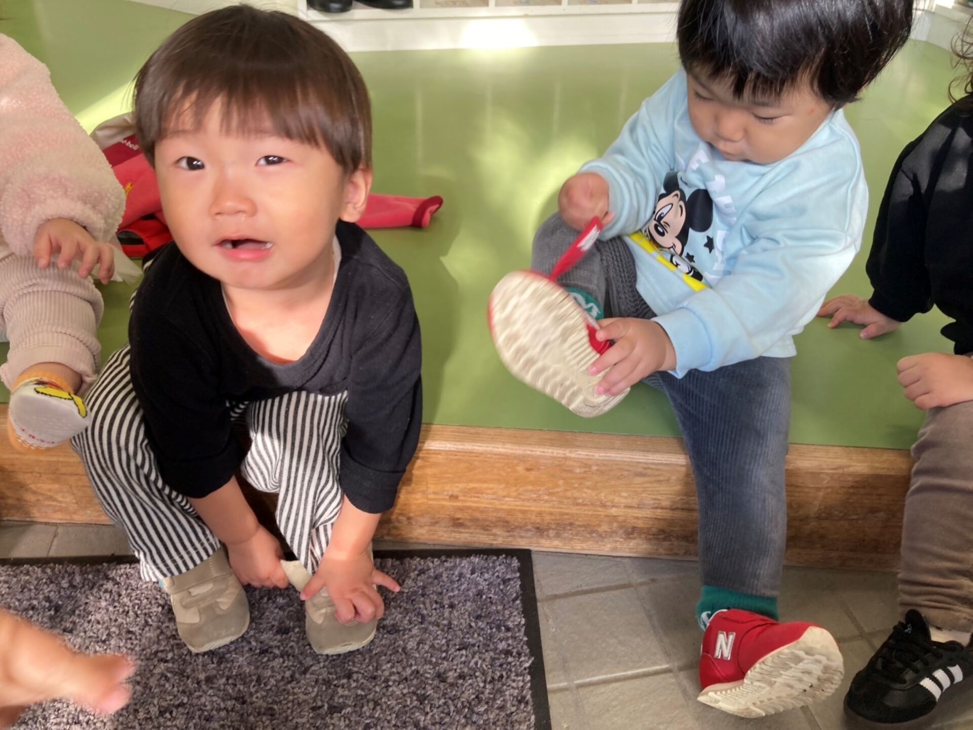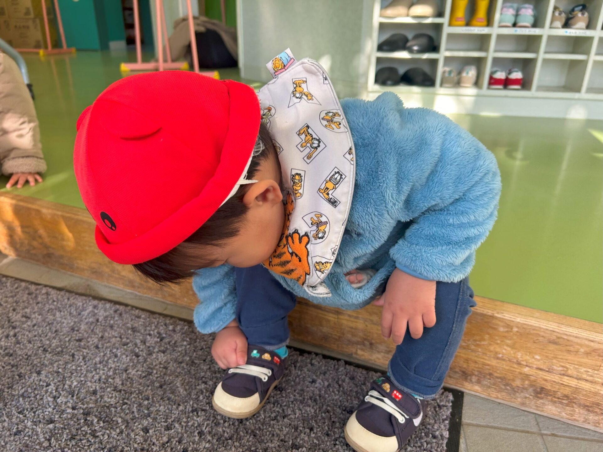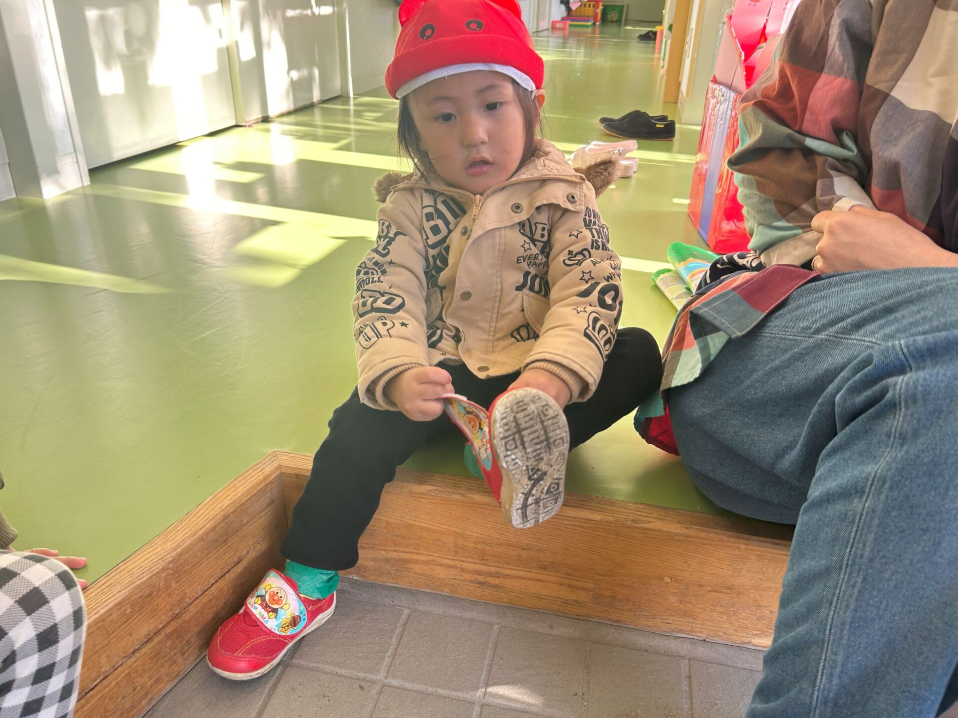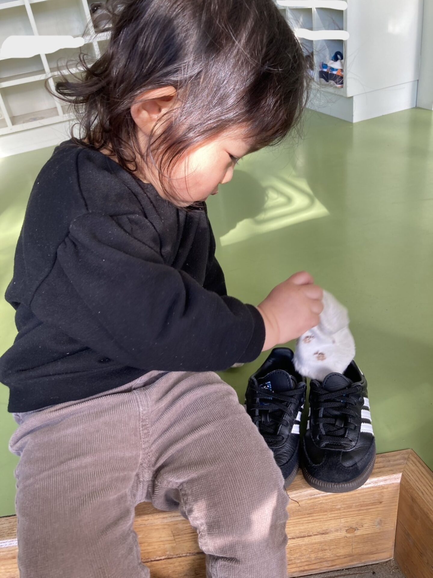 靴は、よ~く狙いを定めて足を入れます!上手く入るときもあれば、そうでないときもありますが、保育者がさりげなく、靴のつま先部分を抑えて、「ぎゅーだよ!」と声を掛けることで、自分でできるようになったお友だちもいます😊