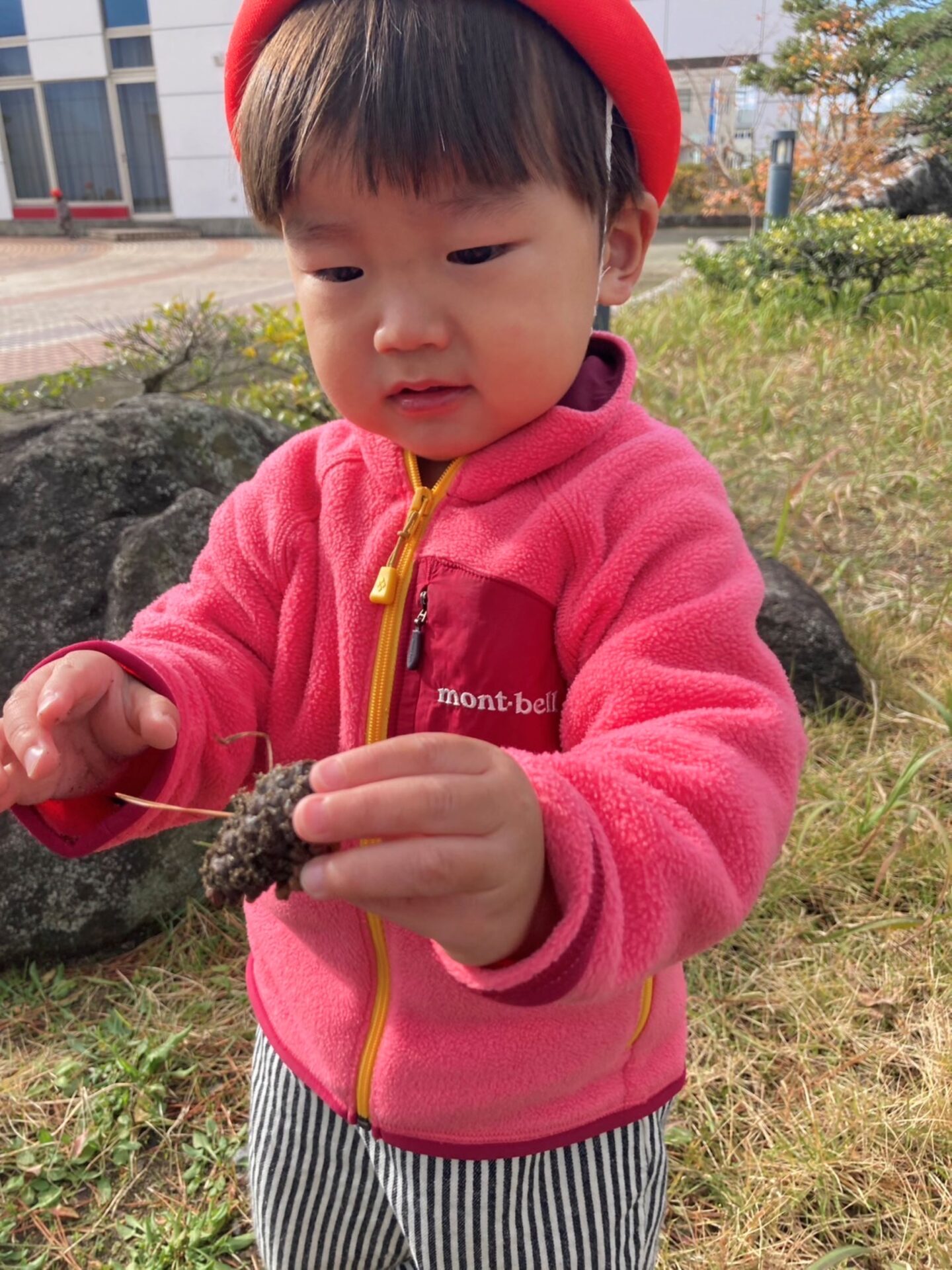 花壇に咲いたお花を見て色を当てたり、落ち葉やどんぐりを見つけたり、まるで宝探しのように目をキラキラ輝かせていた子どもたちでした💕