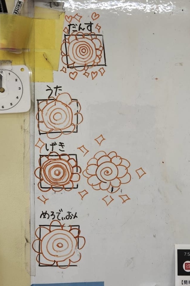 また、練習を振り返るときにつきぐみでは花丸を育てることにしました。毎日「今日は◯増えるかな?!」「花びら何枚になるかな?」と、楽しみながら頑張れたところや次への課題を話し合うことが、練習に参加する喜びにつながっていたようです。前日には全演目に二重丸を超えて、五重丸の花が咲きました。