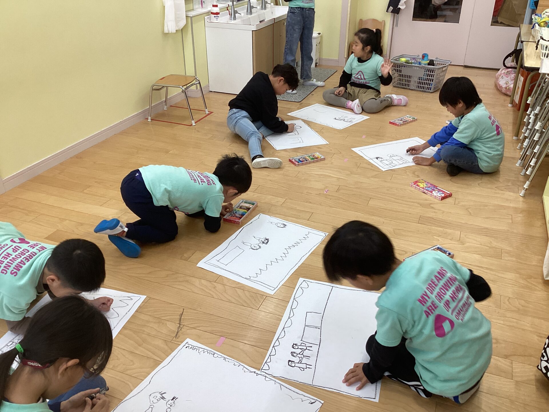 そして今、思い出を形にしようとおむすびコンサートの絵を制作中です。黒のクレヨンで下絵を描き、絵の具で色付けをしています。完成をお楽しみに😊