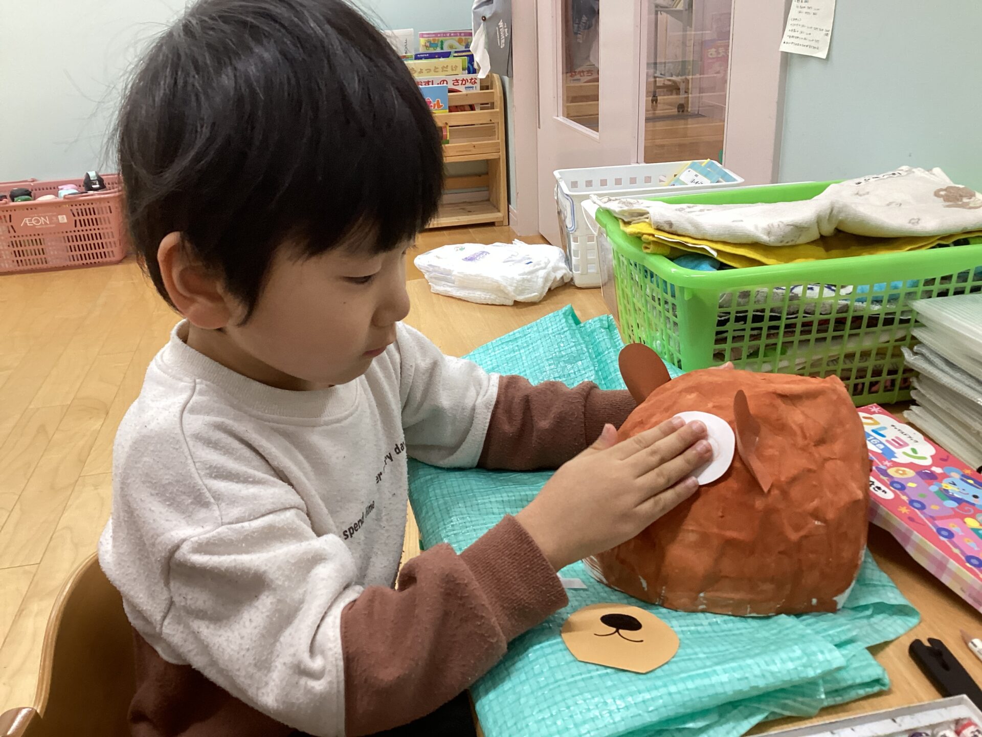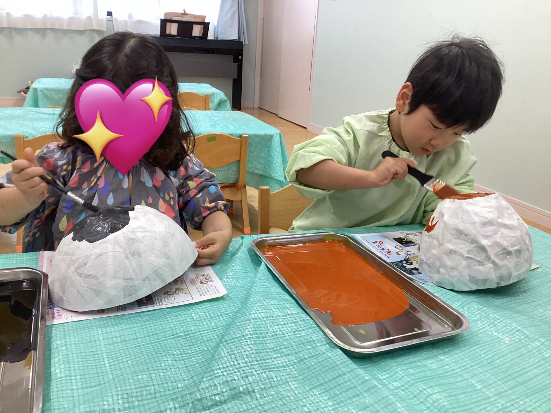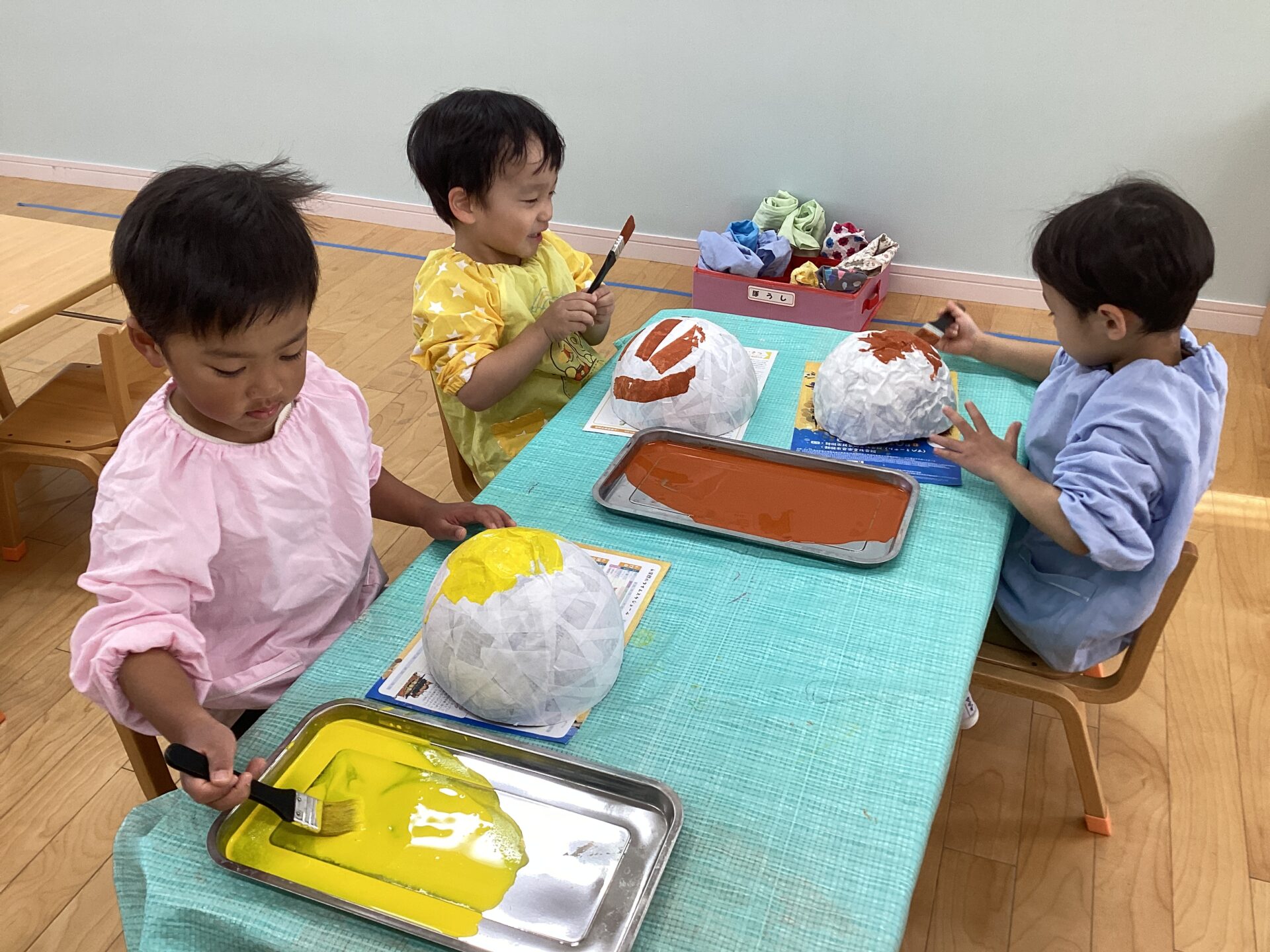帽子の形が出来上がったら、子どもたち一人一人の頭に合わせ形を整えてから絵の具で色を付けました💕