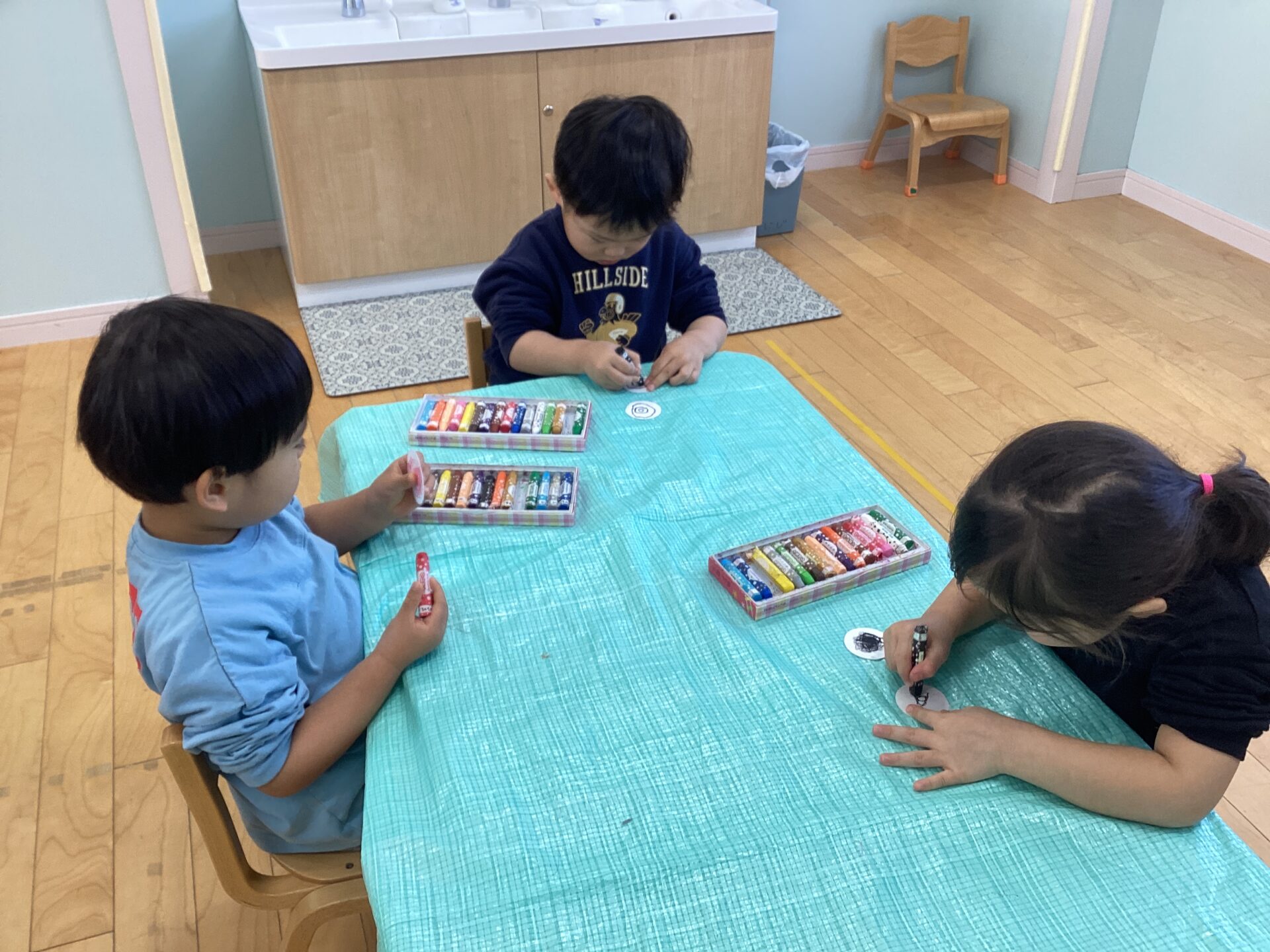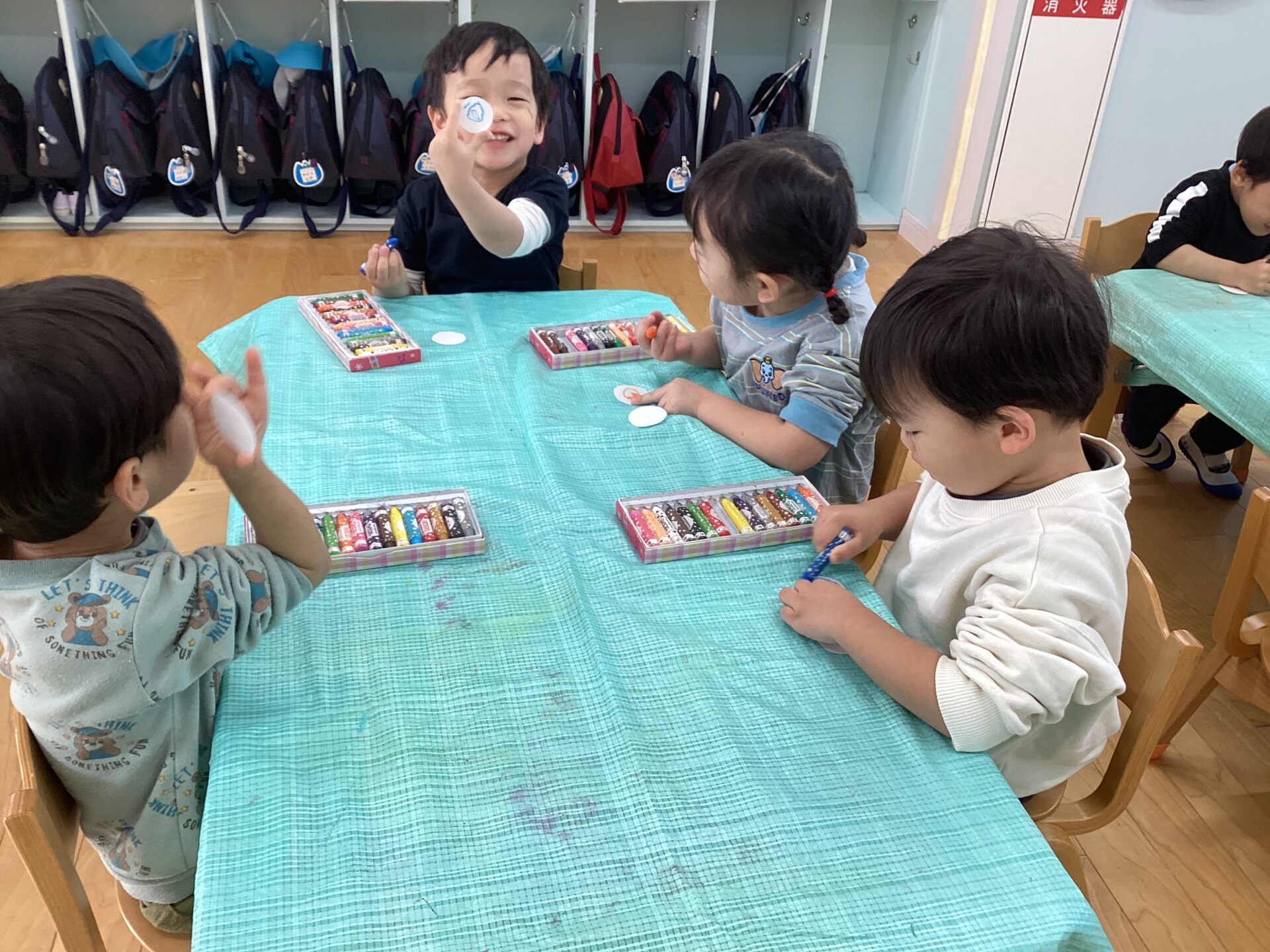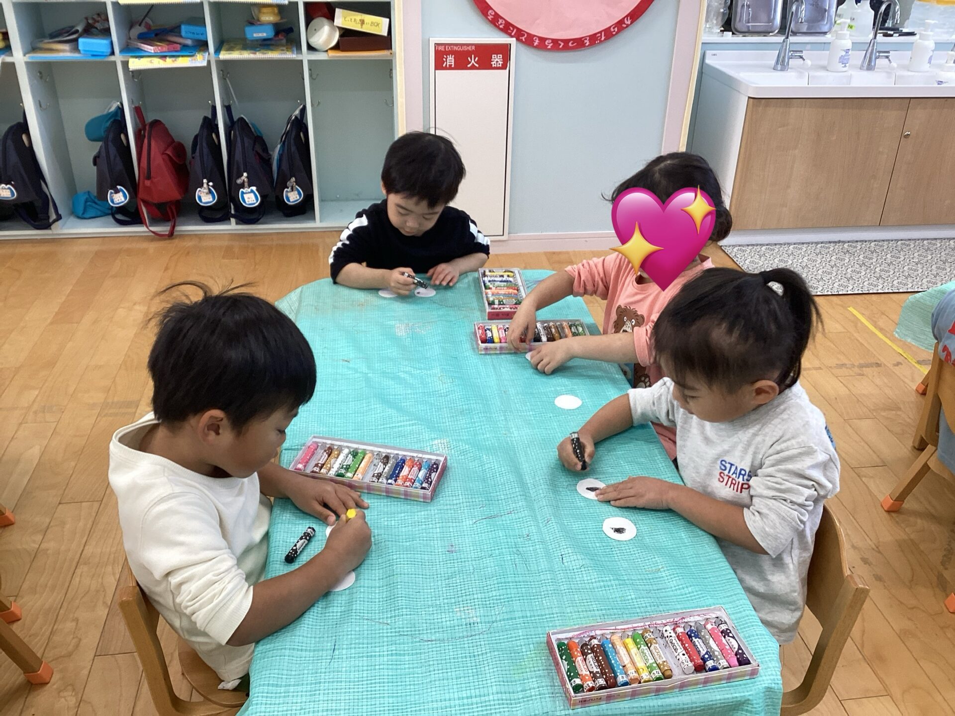 好きな色で描き終わると、同じテーブルのお友だちと見せ合い「可愛いね〜」と楽しそうに話をしていました💖