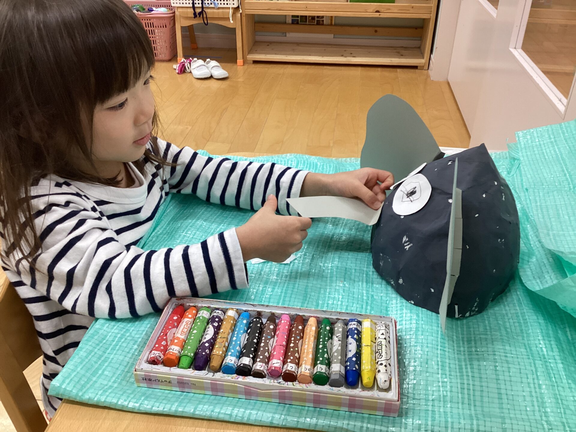 目は子どもたちがクレヨンで自由に描きましたよ🖍️