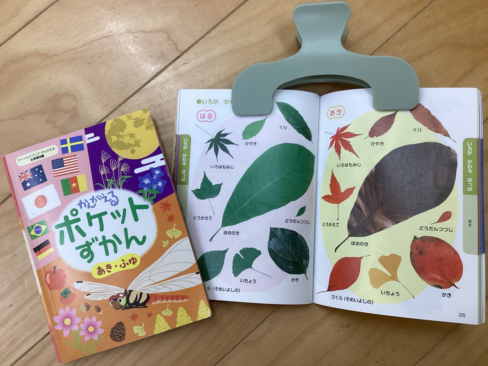 ある日の給食後のまったりタイム中。つきぐみの窓から外を見た子ども達は、お隣のローソンの駐車場に落ち葉がたくさん集まっていることに気づきました。最初は「うわー!いっぱい!」と眺めているだけでしたが、Aくんが「図鑑で探してみる!」と言ったのをきっかけにぼくも!わたしも!とみんなが月刊誌の付録の″ポケットずかん″とにらめっこ☺️