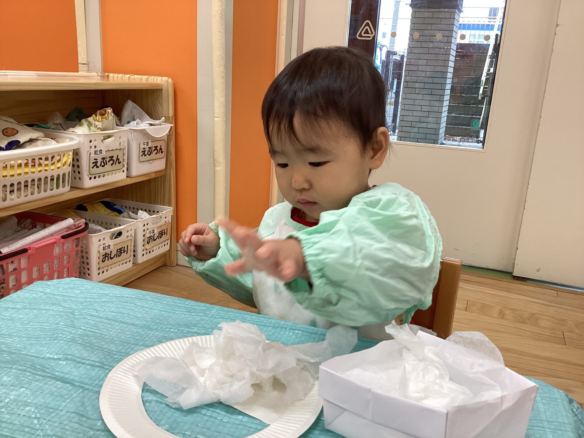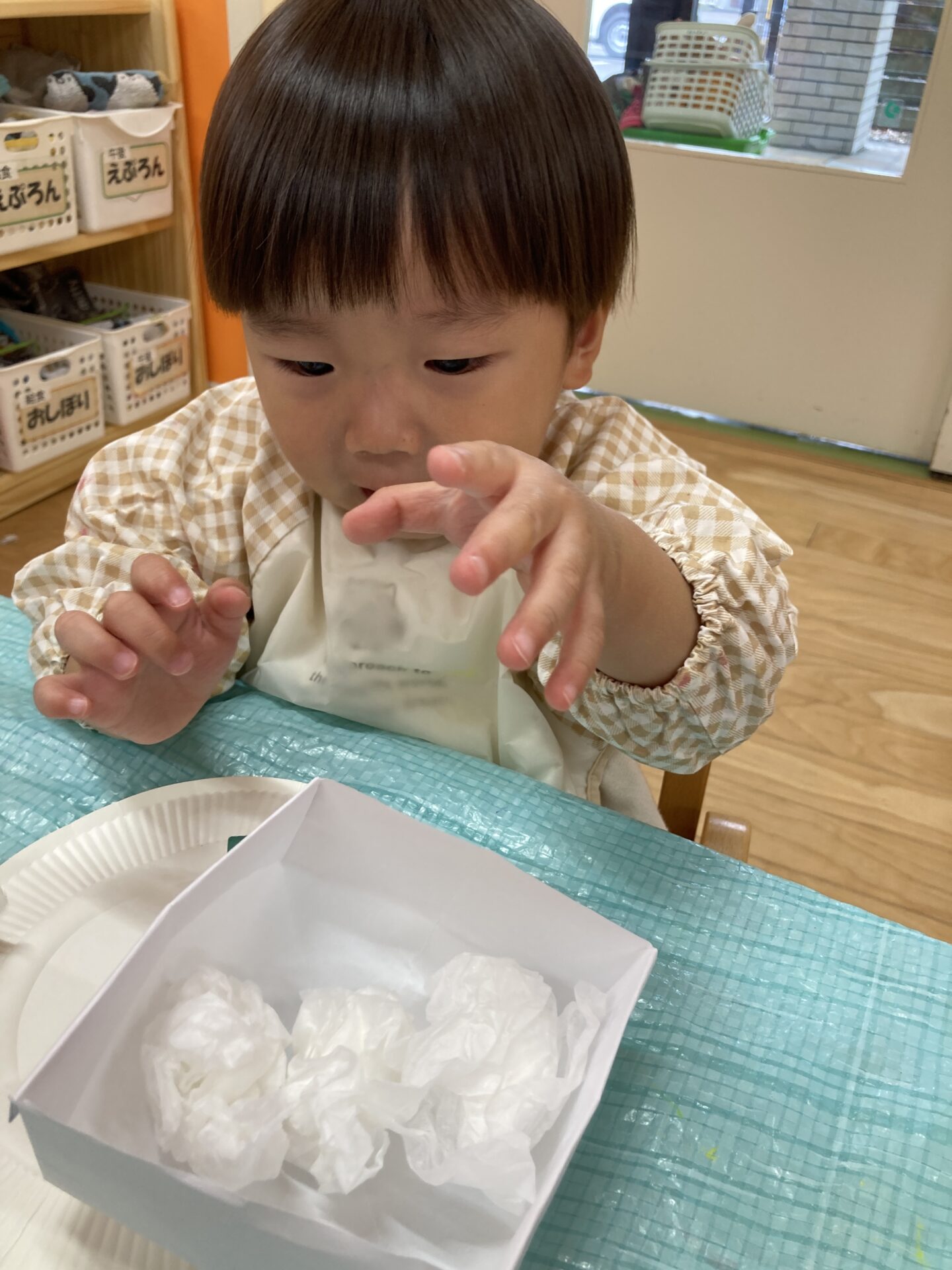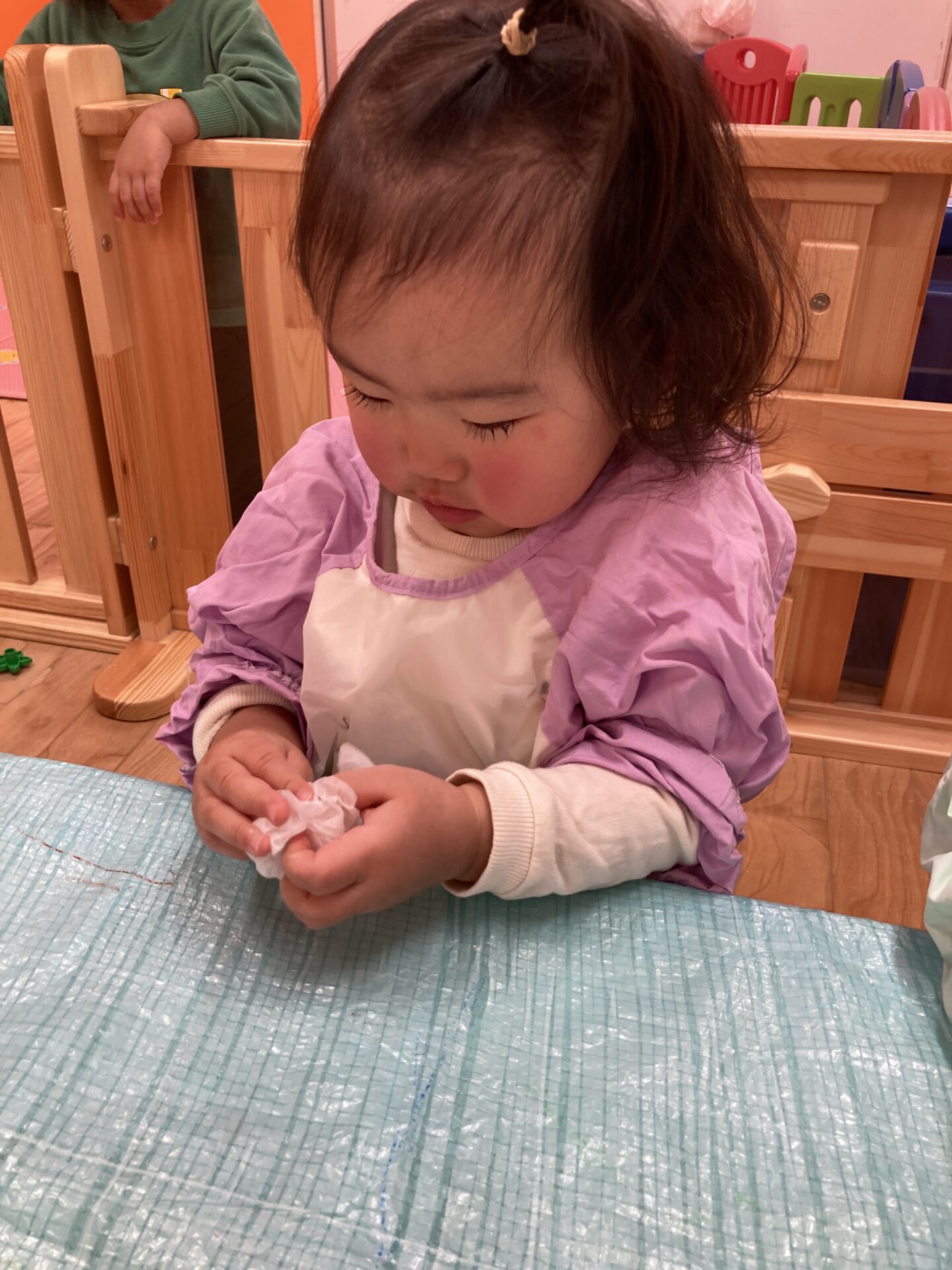 半年後には、保育者の力を借りずともお花紙を丸める姿に成長を感じずにはいられませんでした。