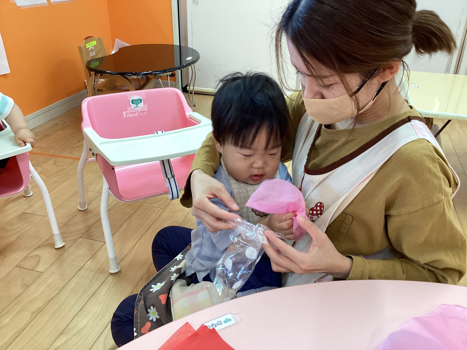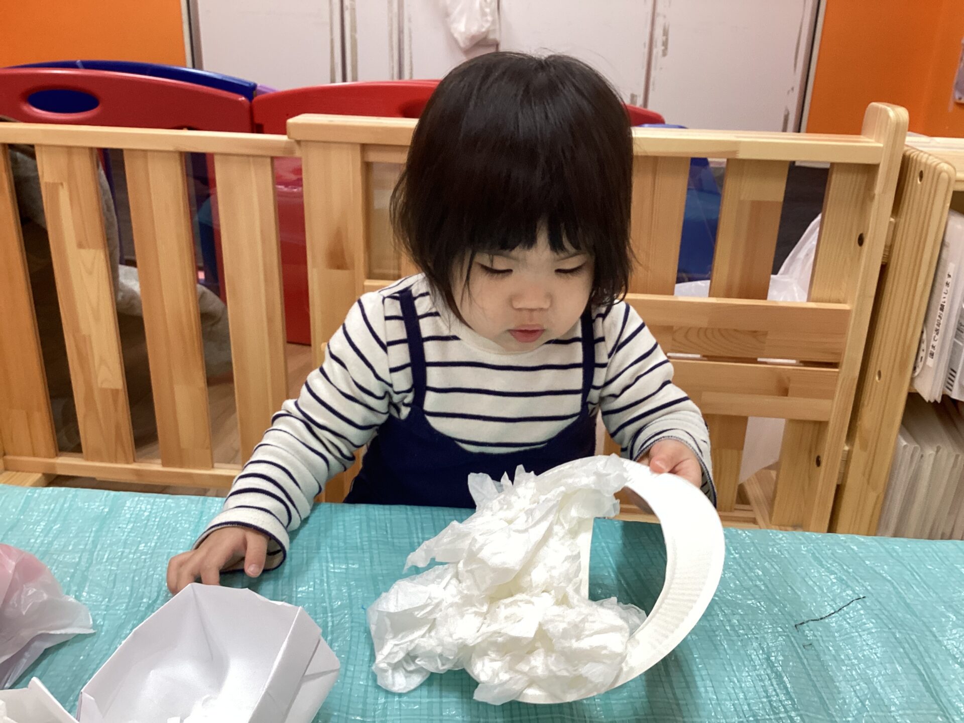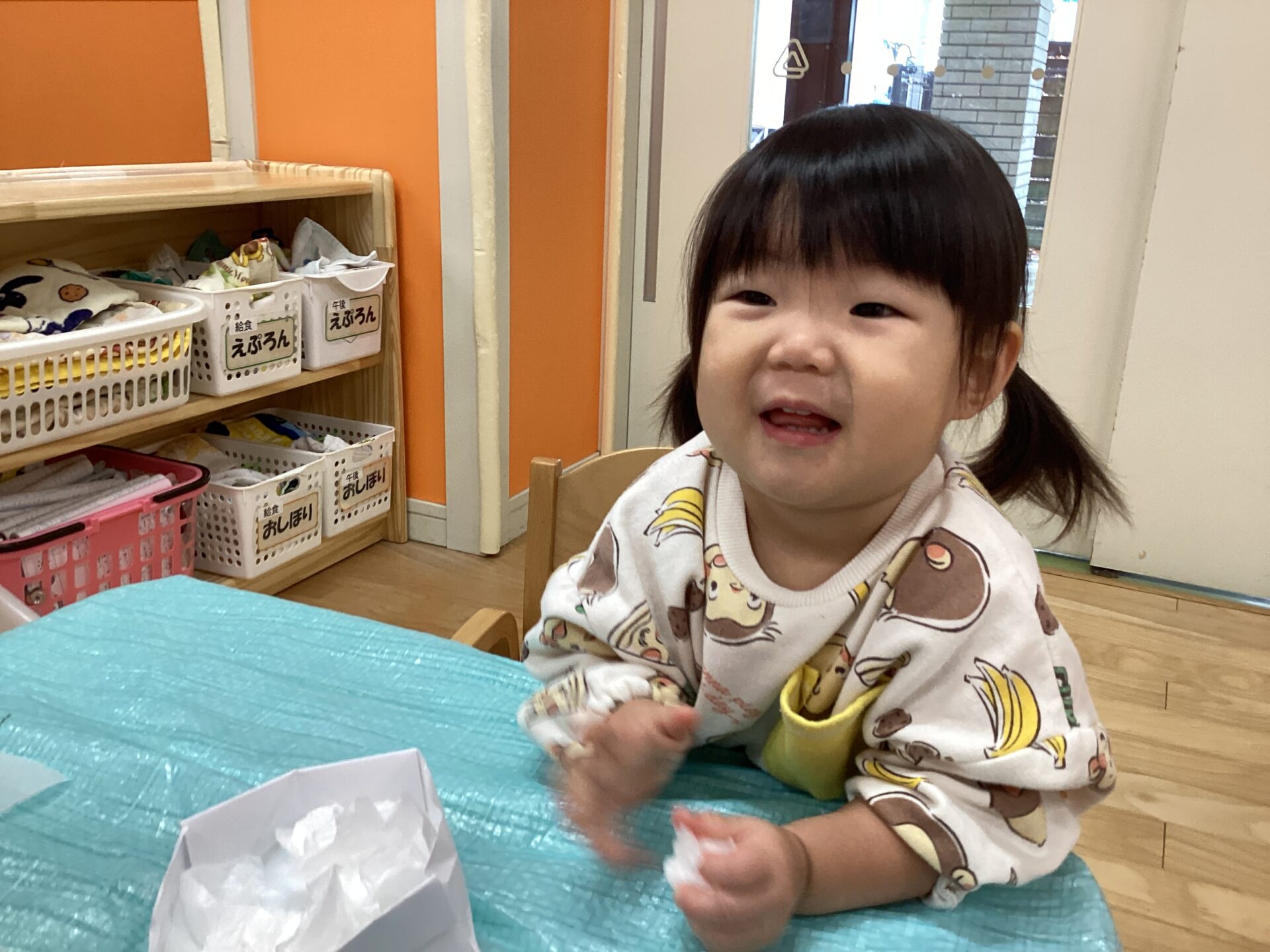 半年後には、保育者の力を借りずともお花紙を丸める姿に成長を感じずにはいられませんでした。