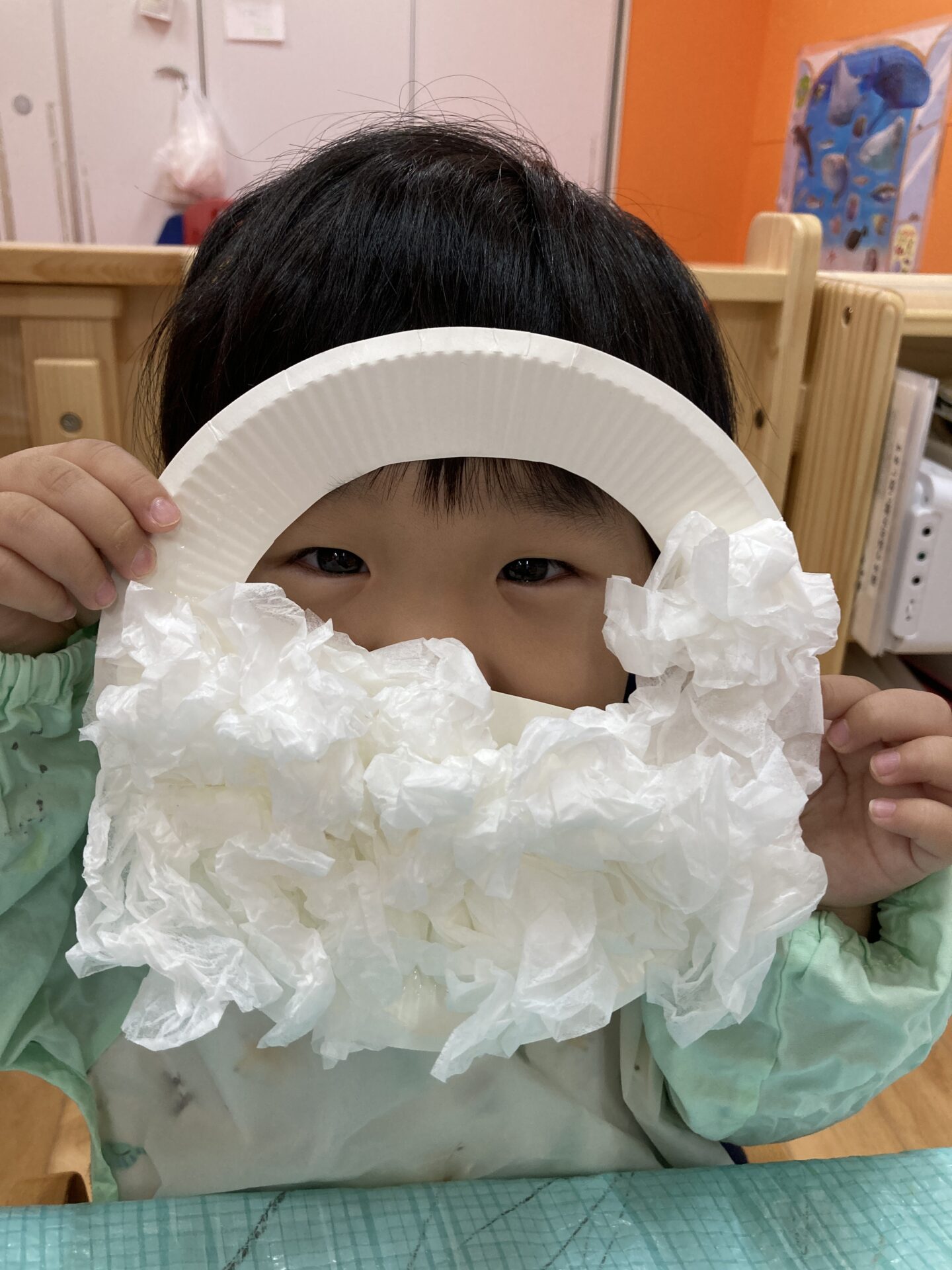 サンタさんのふわふわのおひげは、真っ白なお花紙!