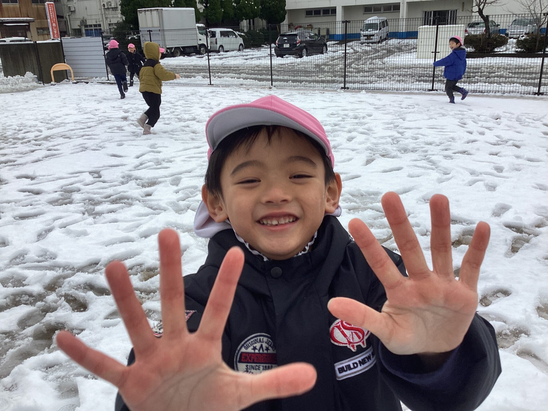 急な雪の到来に、雪遊びのお支度(手袋やスノーウエア)はまだお願いしていない為、手のひらは