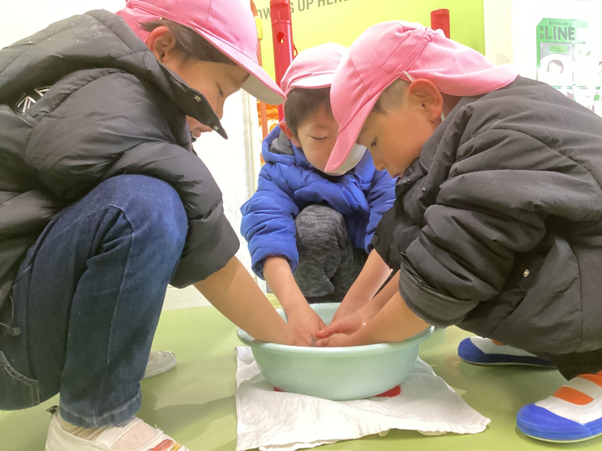 「気持ちいい~」「手の温泉だね!」としばらく子どもたちはバケツのお湯から離れられず