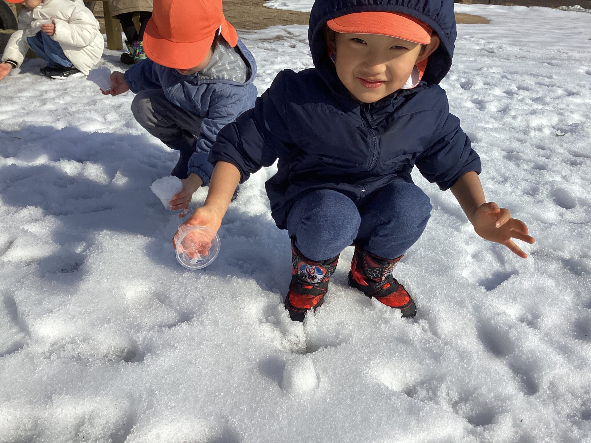 うっすら雪が残るある日。久々の晴れ間に子ども達から「今晴れているから、お外で遊べるよ✨」と嬉しそうな声で報告がありました。以前から雪が積もる度に「雪遊びしたーい!」とリクエストがあったので、子ども達念願の雪遊びをすることにしました😊