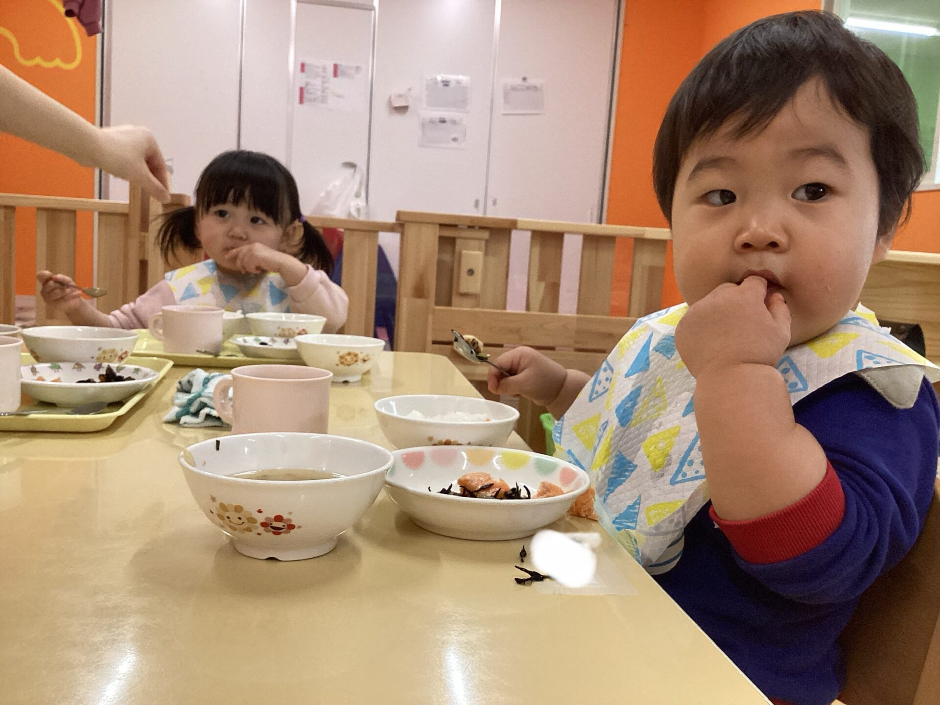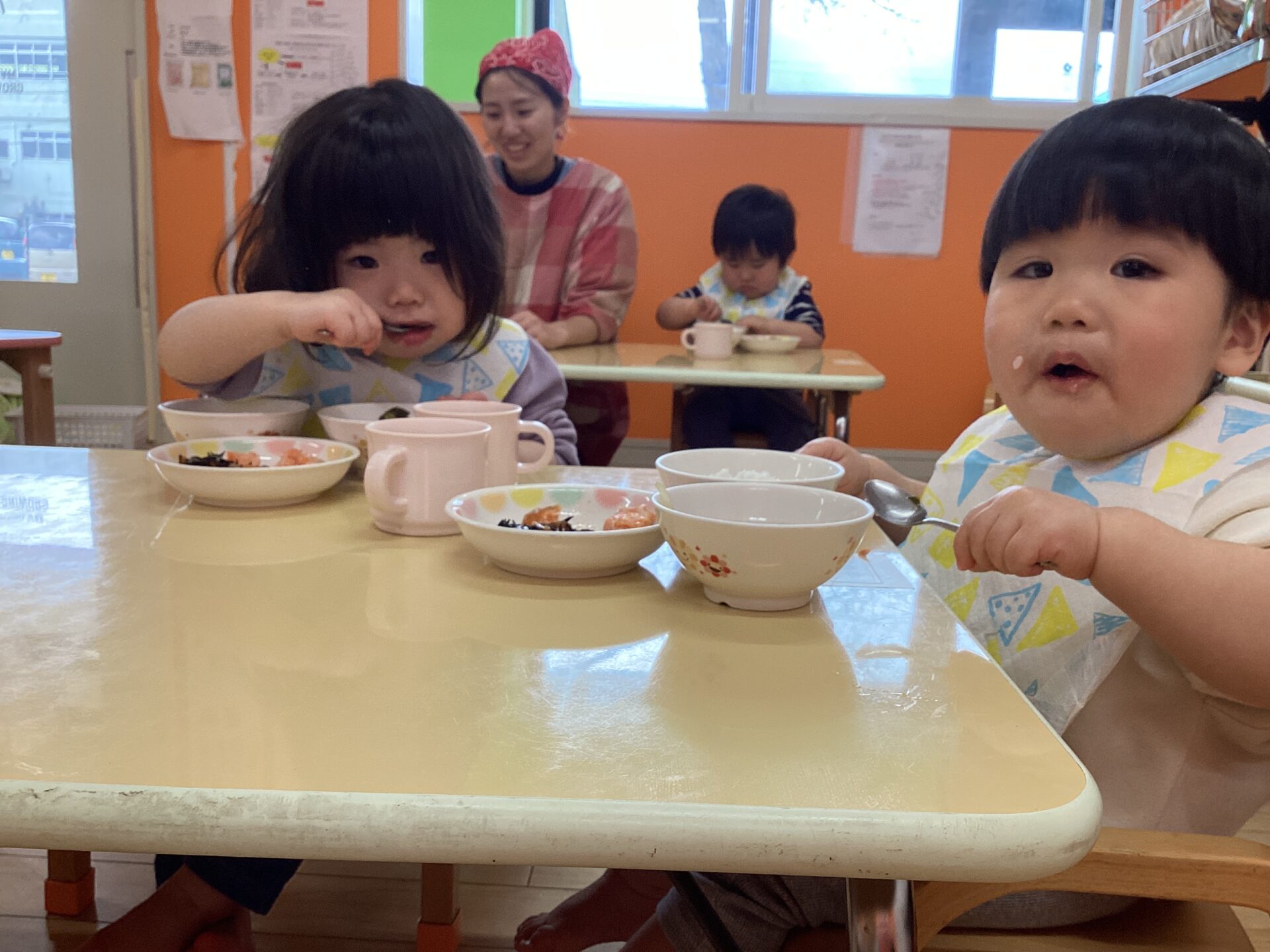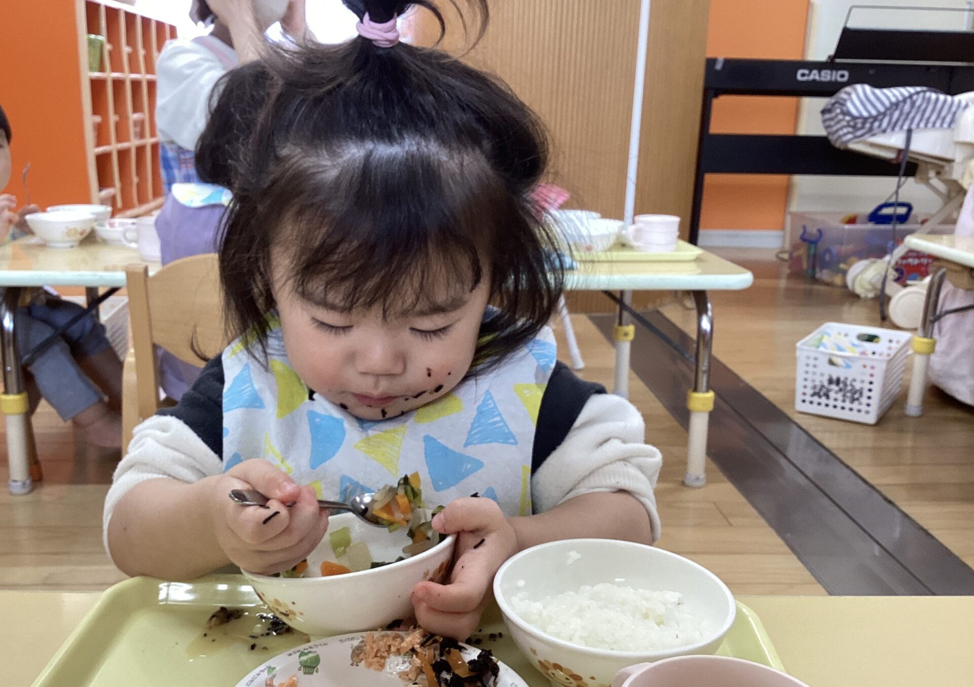 大好きな給食の時間では、一生懸命自分で食べようとしていました。