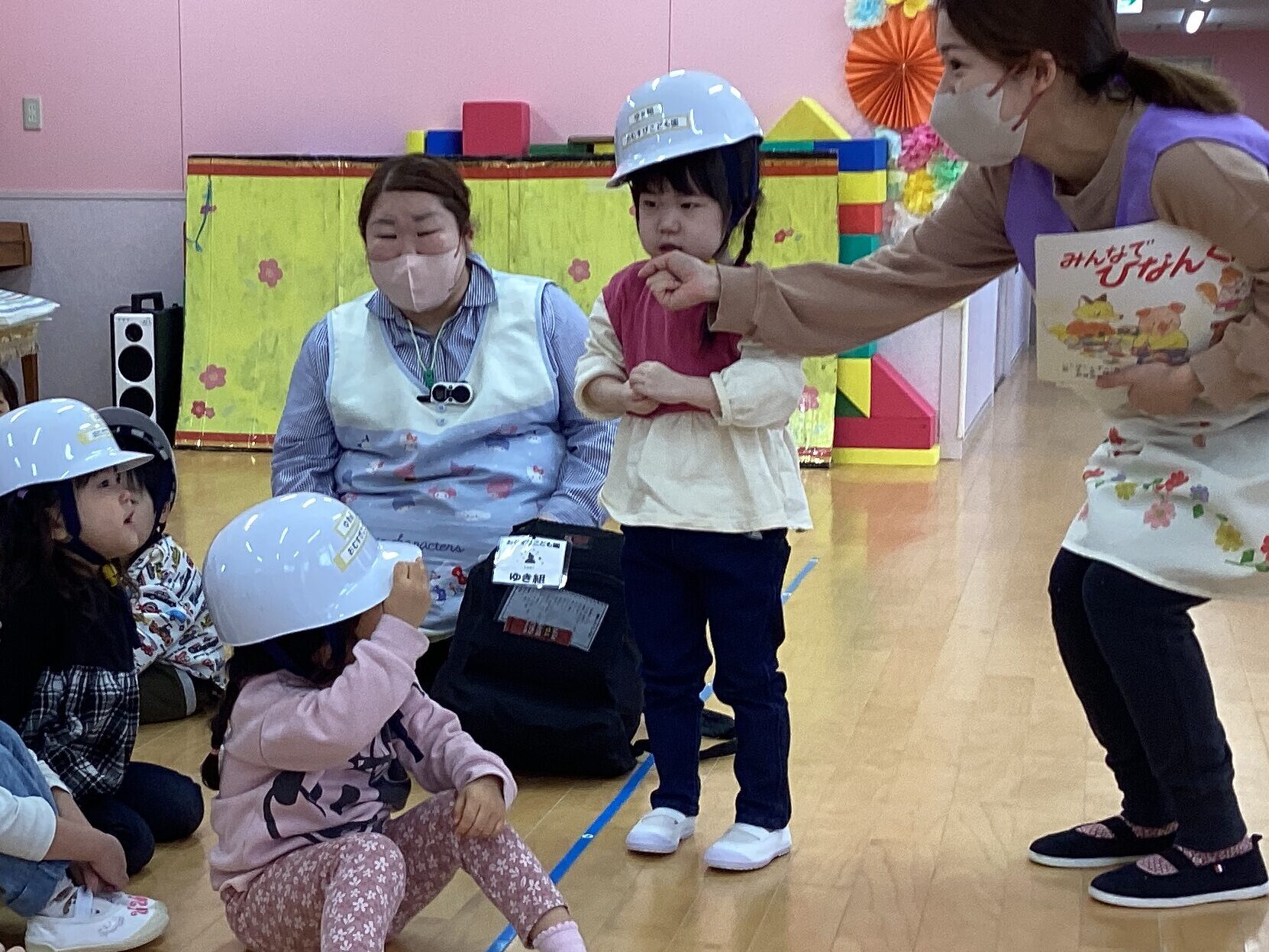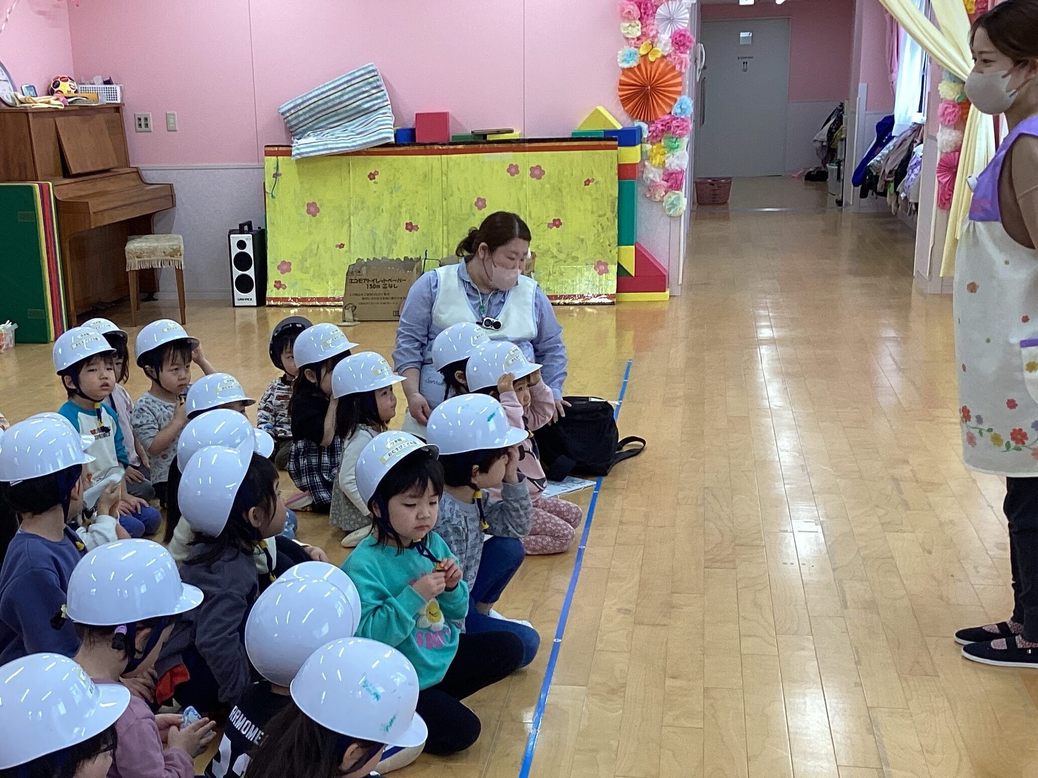 紙芝居『みんなでひなんくんれん』を見て、避難の際の約束事を確認しました。紙芝居を真剣な表情で見ていた子どもたちは、紙芝居に出てきた『約束事』を手を挙げて発表してくれました😊