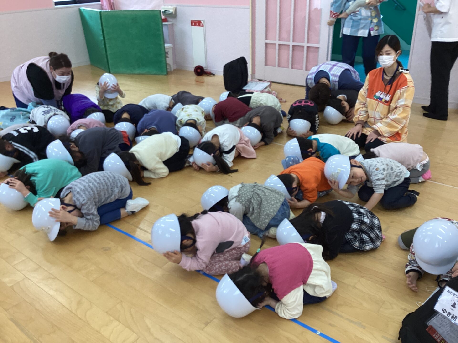 最後は、『地震』の際の『だんごむしポーズ』の練習をしました。訓練の想定内容によって、避難の仕方が変わることをよく聞いて取り組むことができました😌