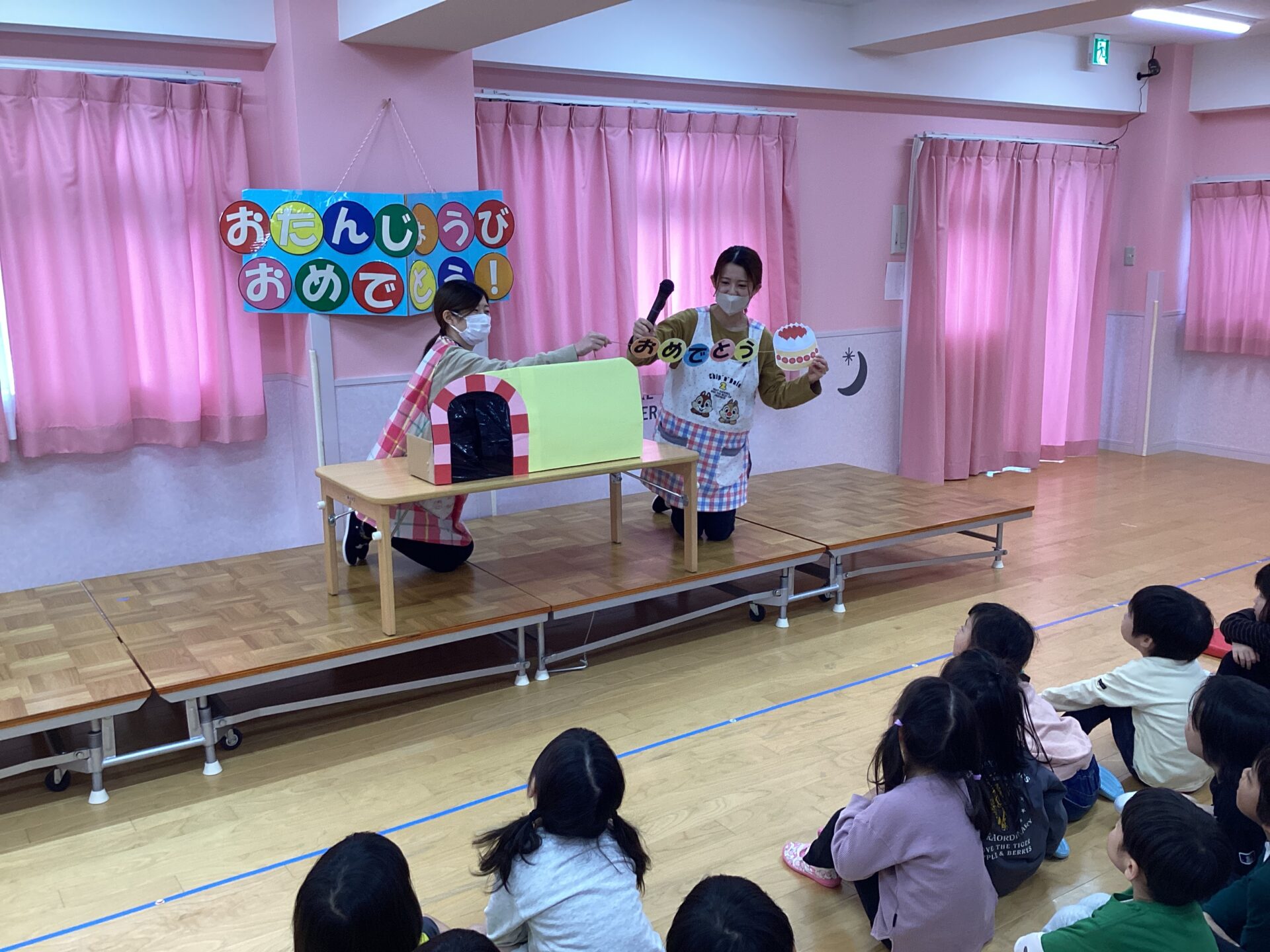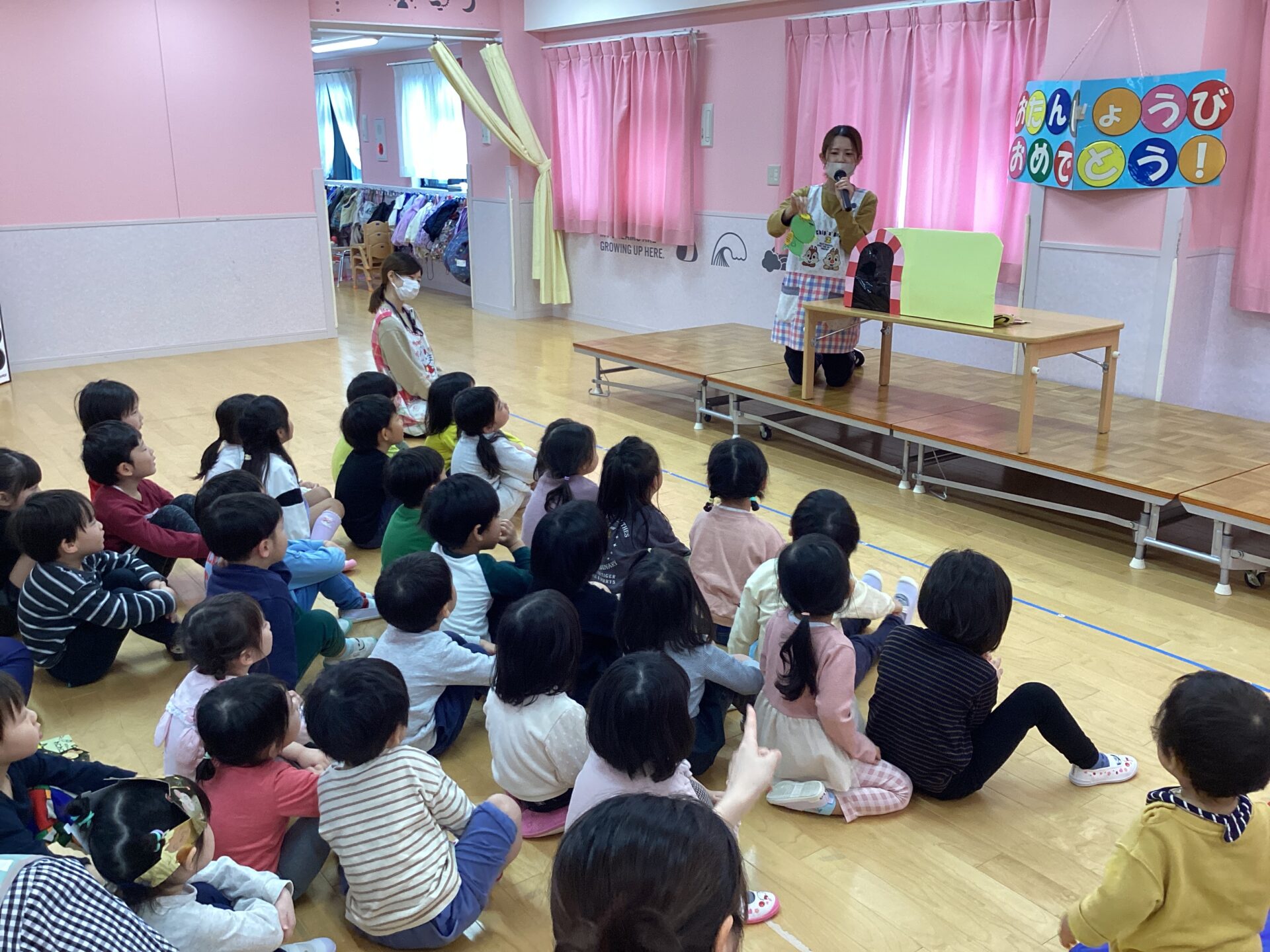 0、1、2歳児さんの部はお誕生児さんがお休みだったので、今回はセレモニーは行わず、お楽しみ コーナーの大型絵本の読み聞かせを行いました。 (お休みの誕生児さんは来月のお誕生会に参加します☺️)