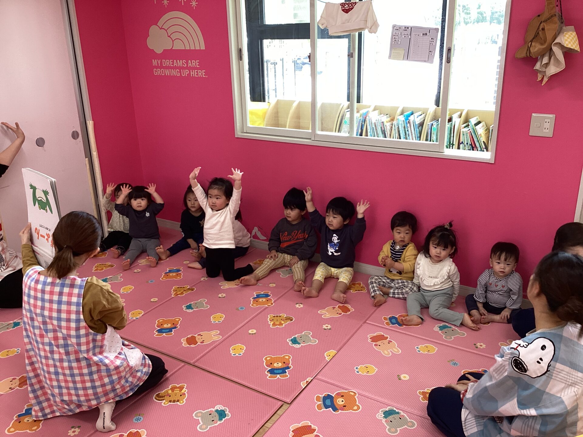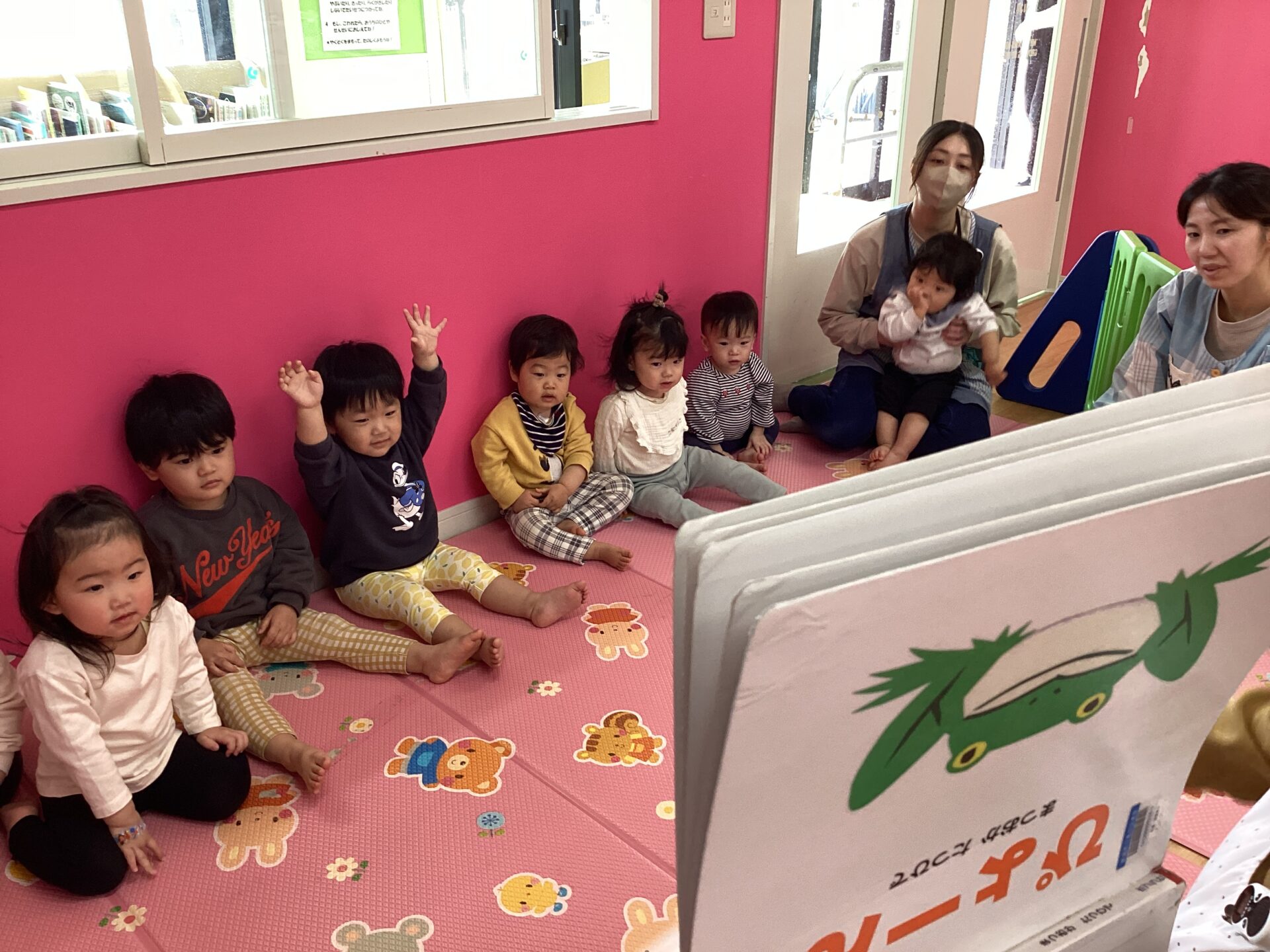 絵本に出てくる「ぴょ〜ん」合わせて、両手を挙げる子ども達がかわいらしかったです♡