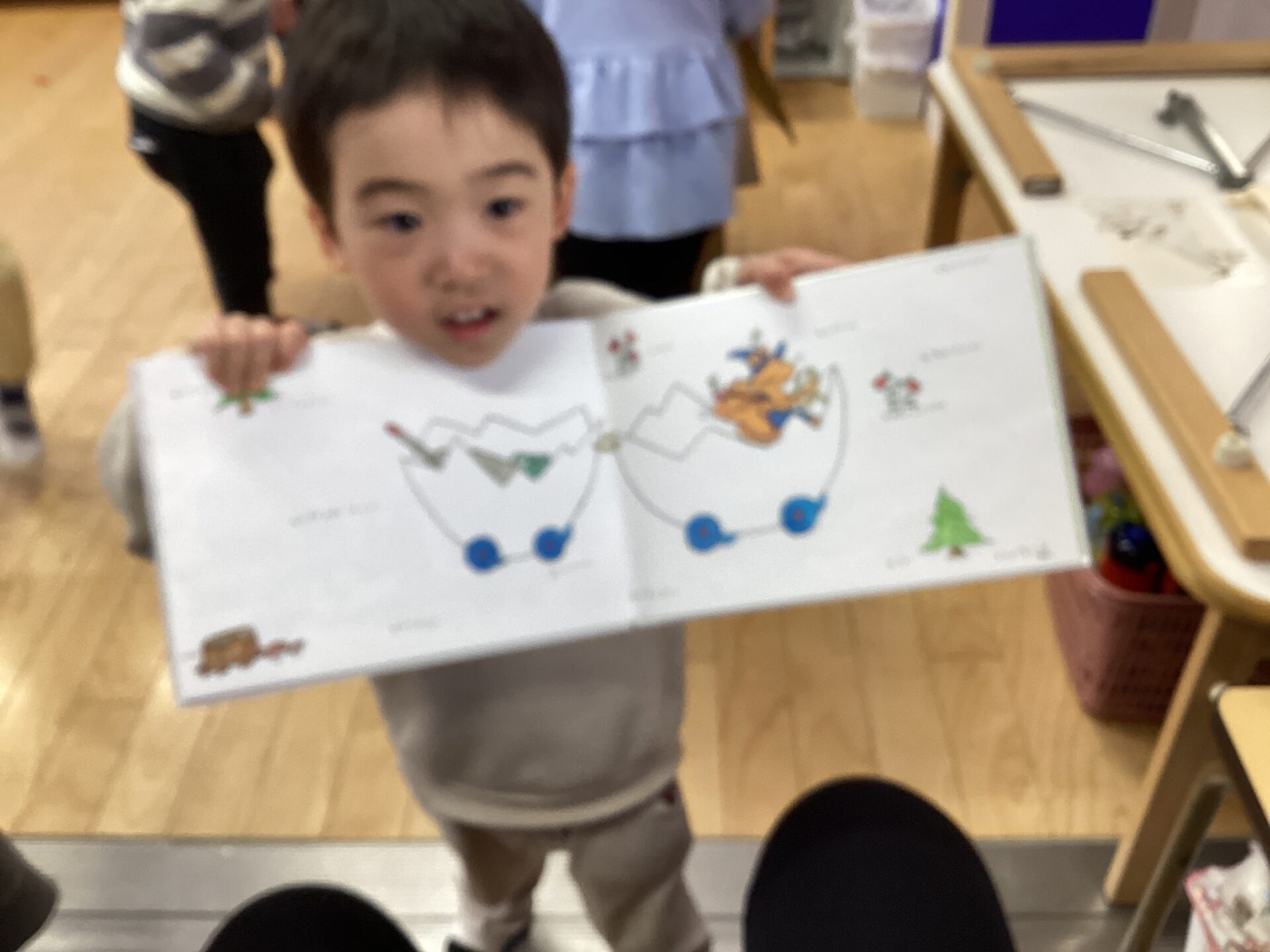 「これ見れば良いんだよ👀」と、ぐりとぐらの絵本の車のページを「じゃーん😋」