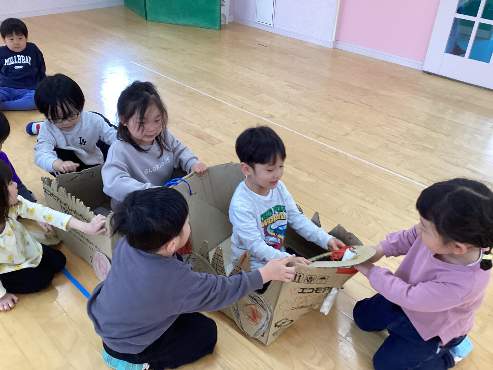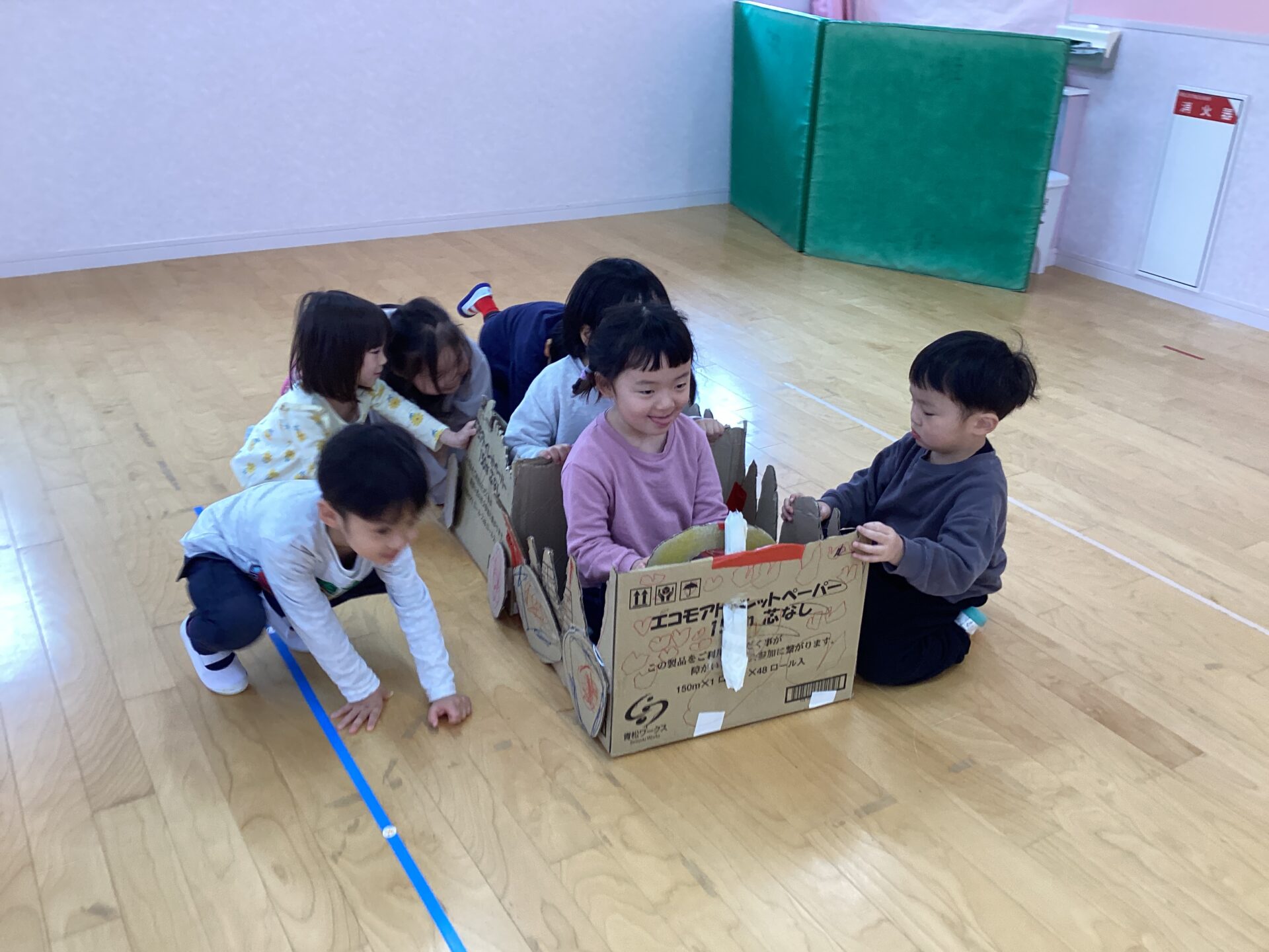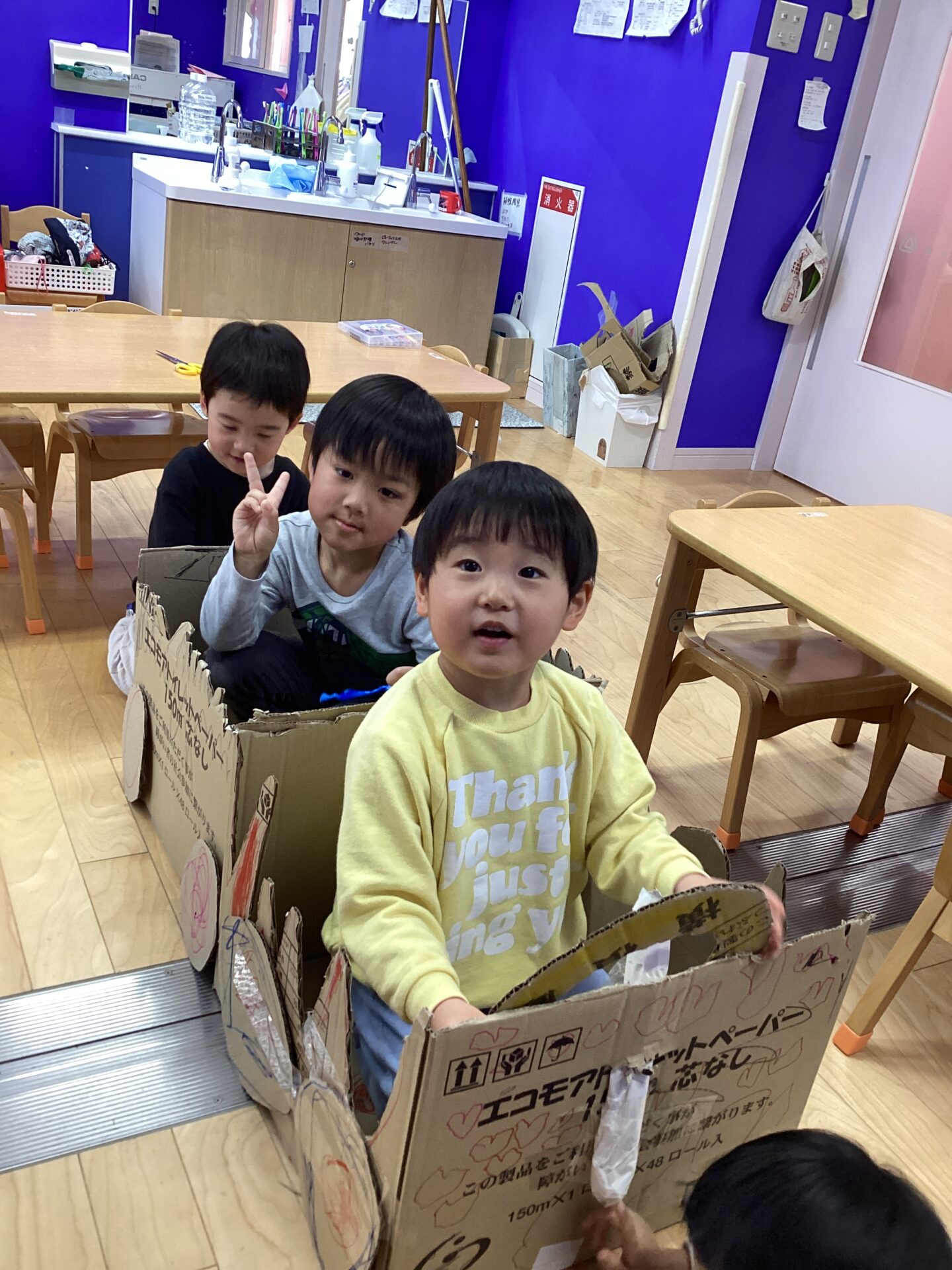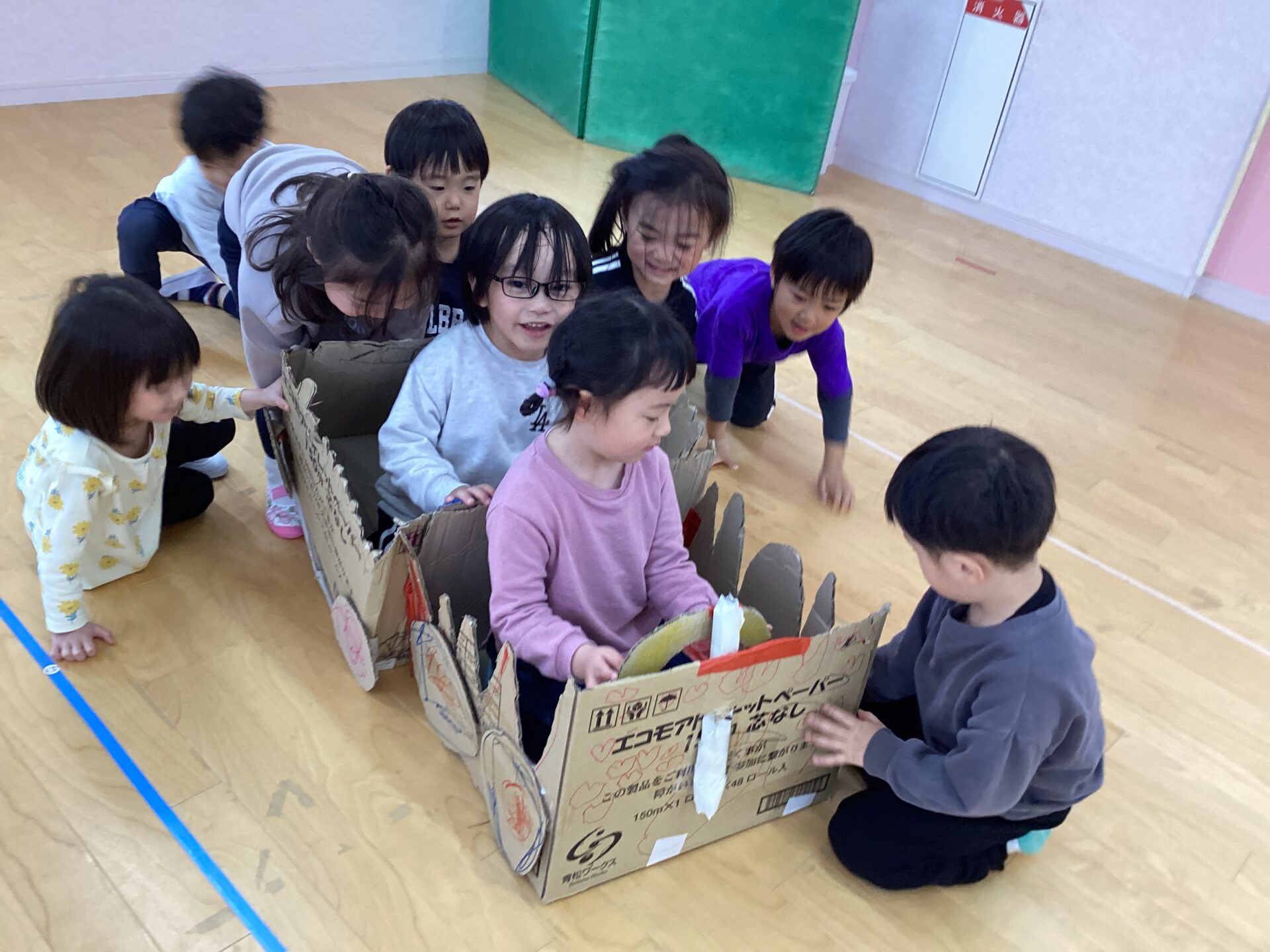 車作りを始めてからずっと側にいて完成まで頑張った子。途中で辞めて違う遊びをして、また戻ってきて参加する子等それぞれの参加の仕方がありました。最初に作りたかった車の大きさではなかったかもしれないけど、みんなが大満足な仕上がりでした✨