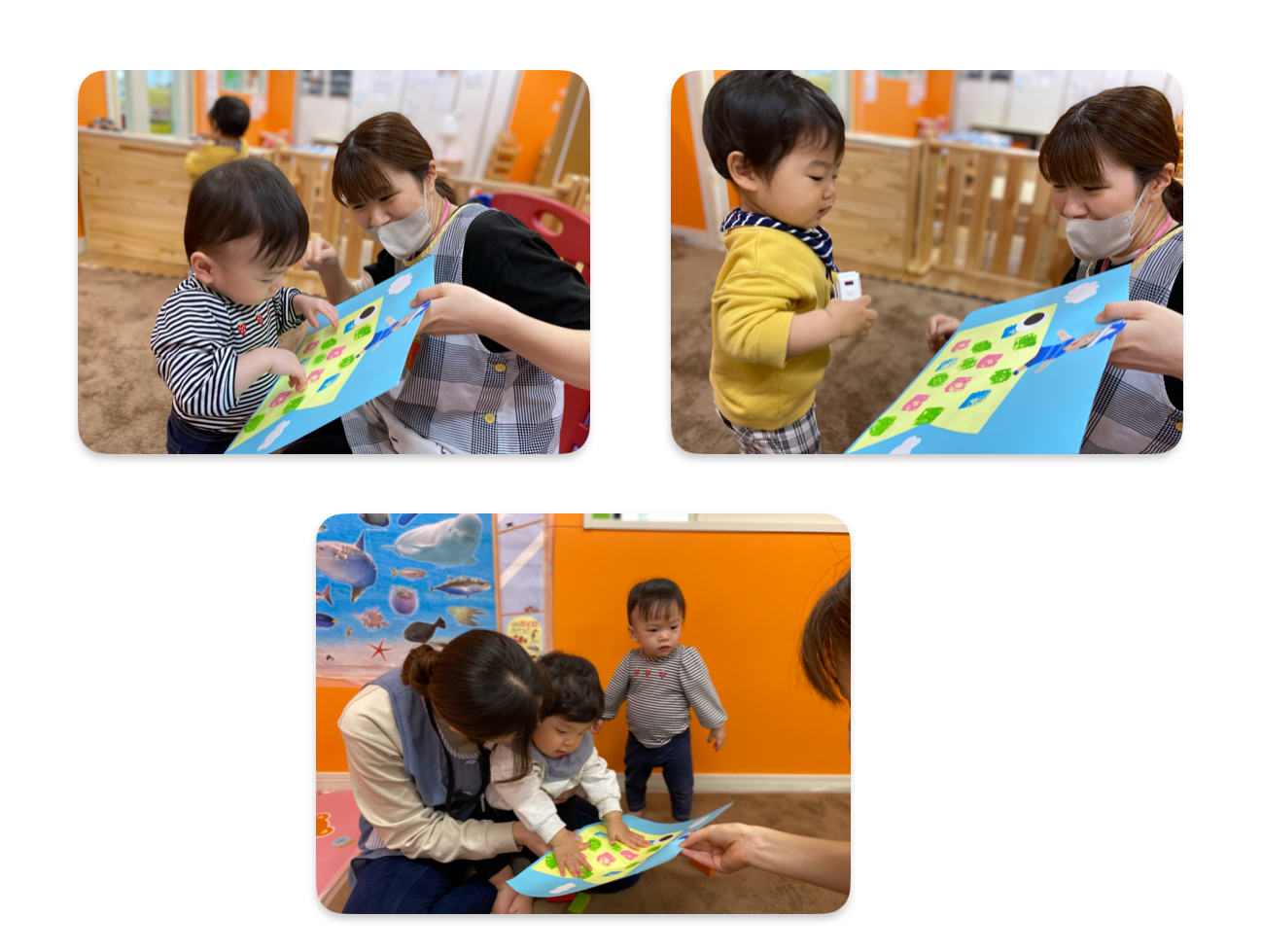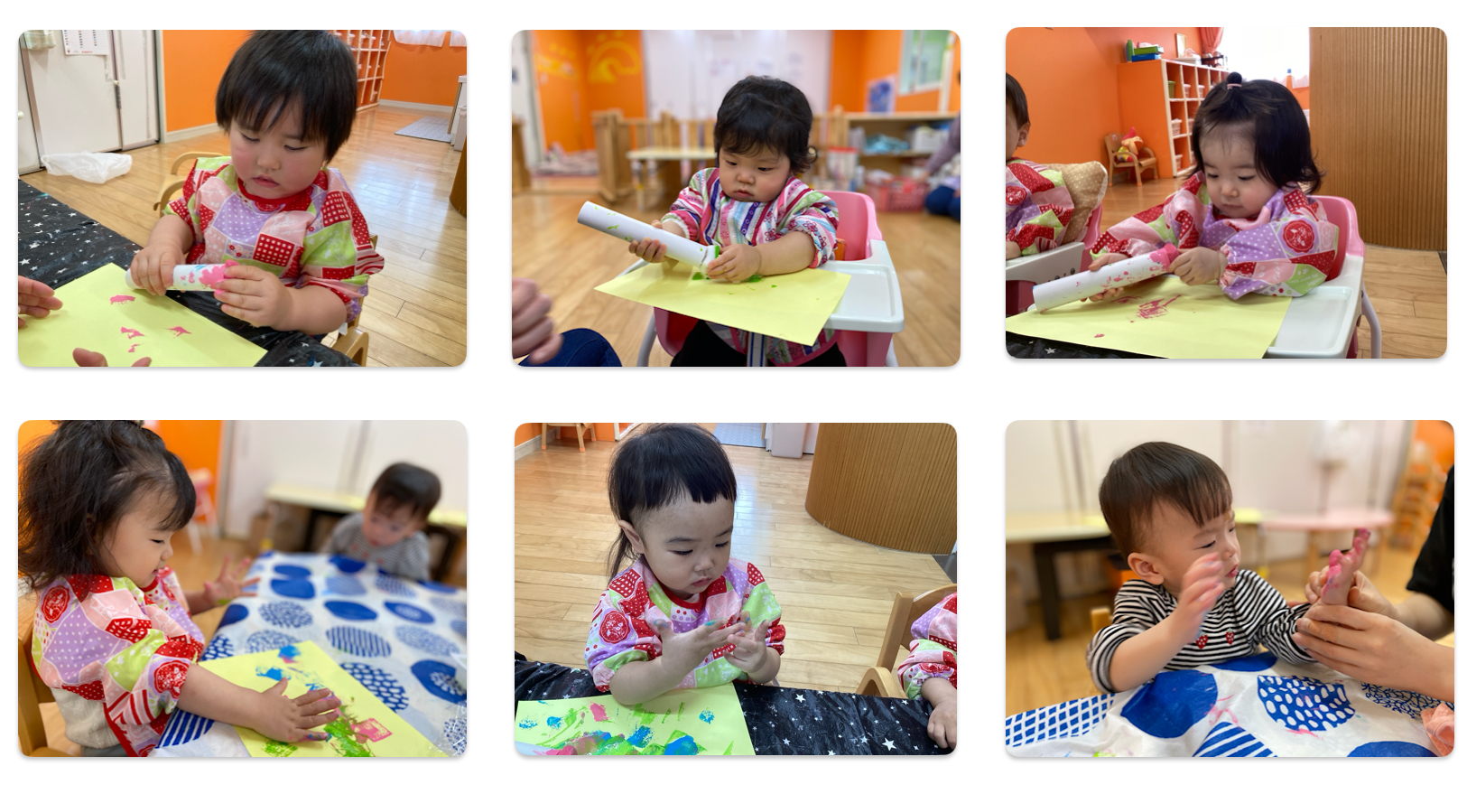 「どの色にする?」と声をかけると、子どもたちなりに“これにしようかな”と手を伸ばし自分の思うものを選んでスタンプしてくれました。