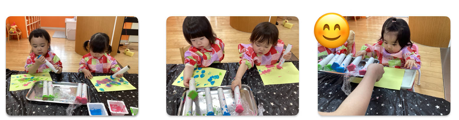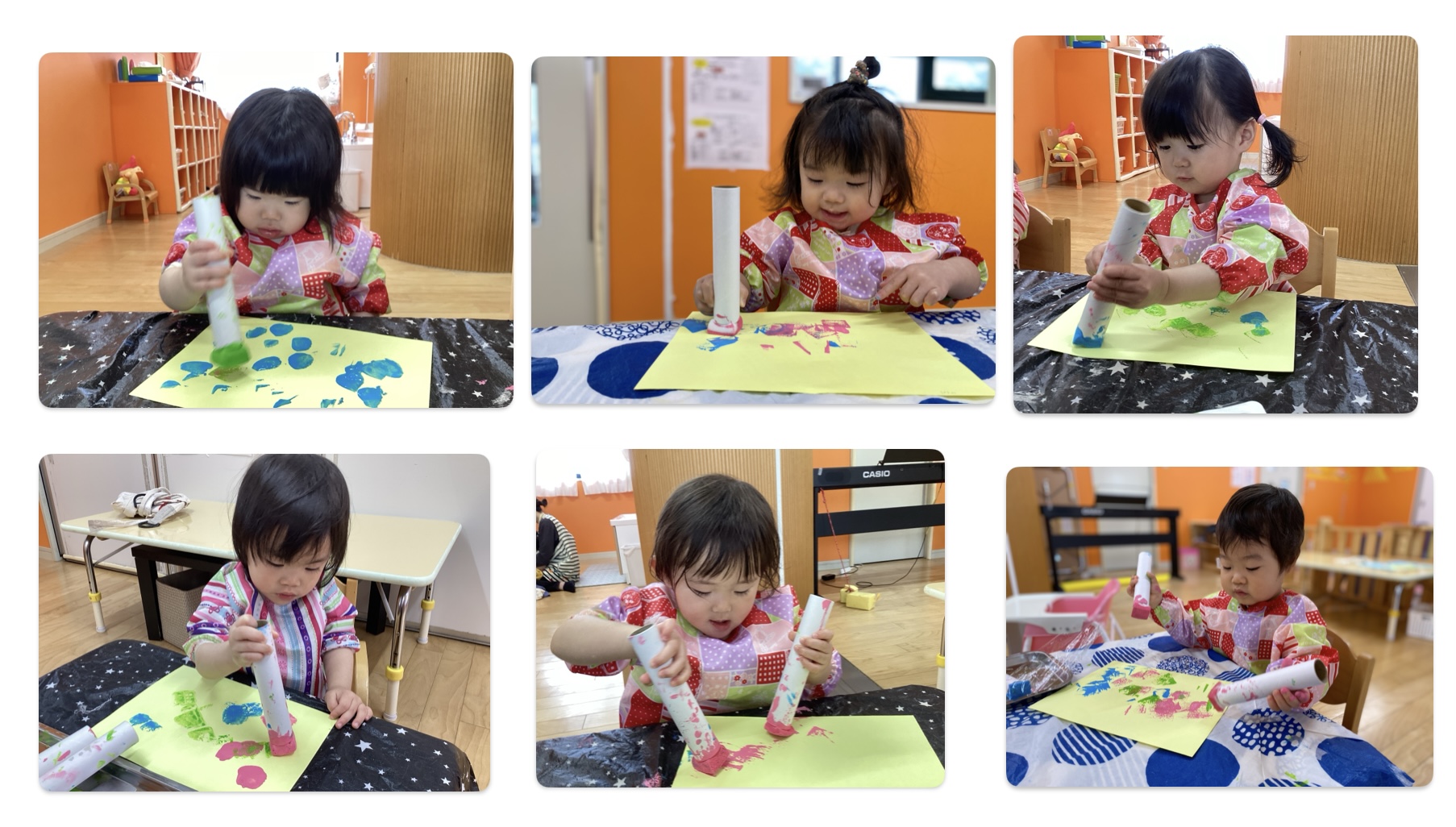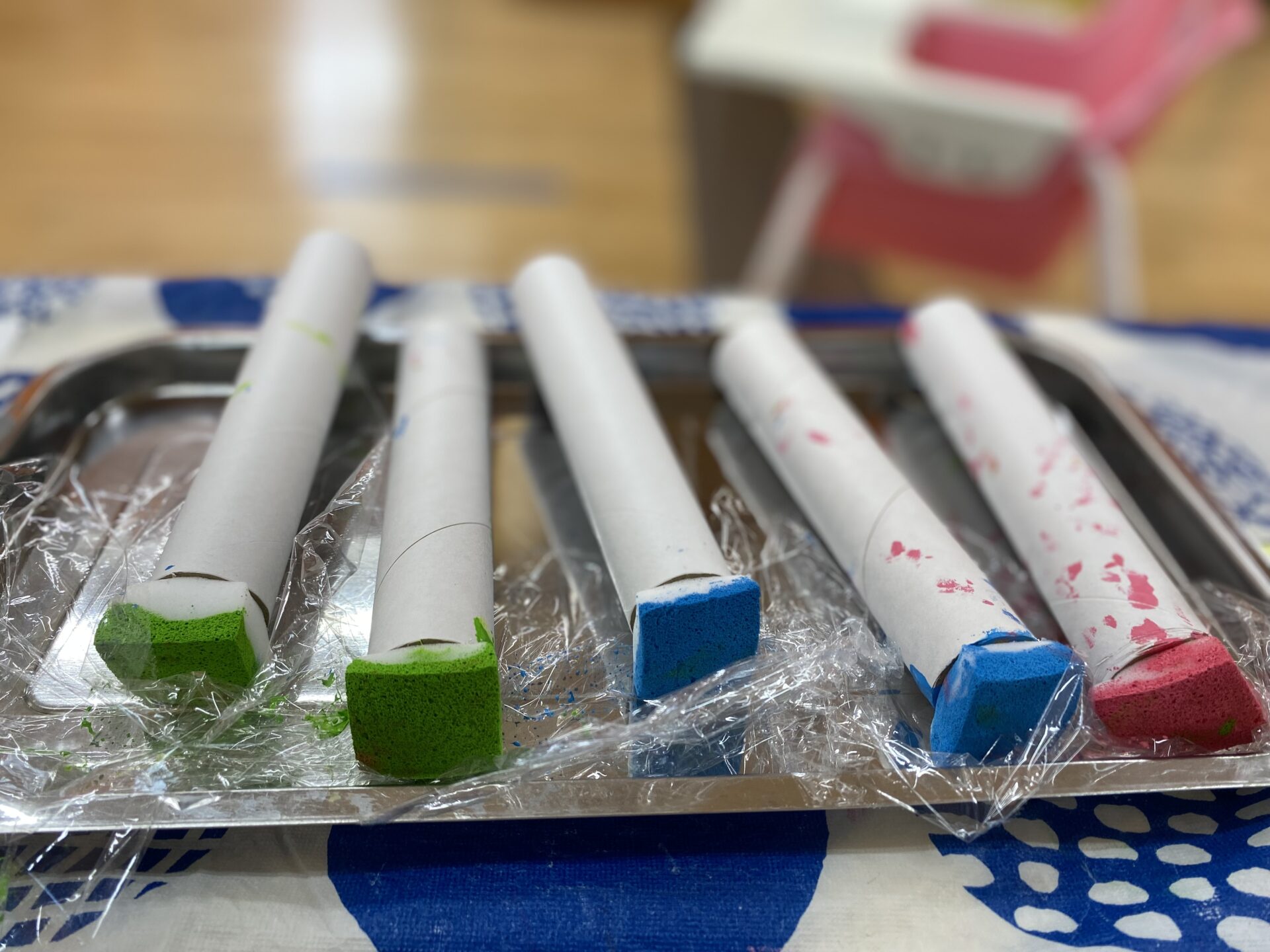 今回の製作では、手作りスタンプを半分に切ったラップの芯とお掃除で使うメラミンスポンジでスタンプを作り、ピンク・水色・黄緑の3色用意し、子どもたちが好きな色を選び取れる様にしました。