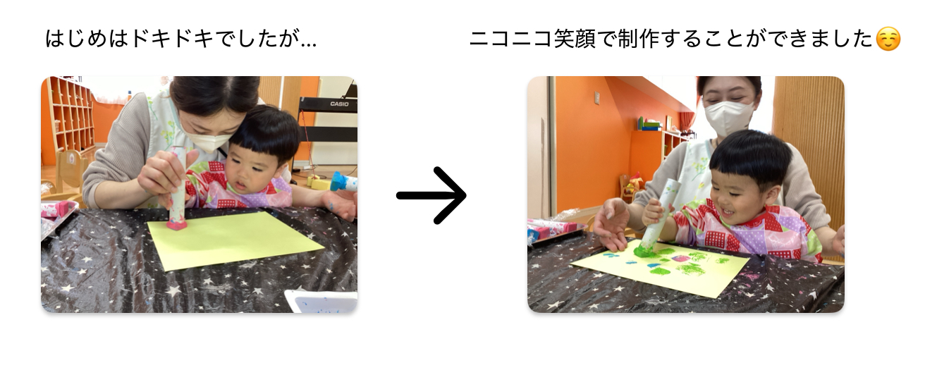 中には、はじめての経験にちょっぴりドキドキする子もいましたが、大好きな先生と一緒にやってみることで楽しさに気づき“自分で”と1人で意欲的に行えるようになった瞬間はとても嬉しかったです😊
