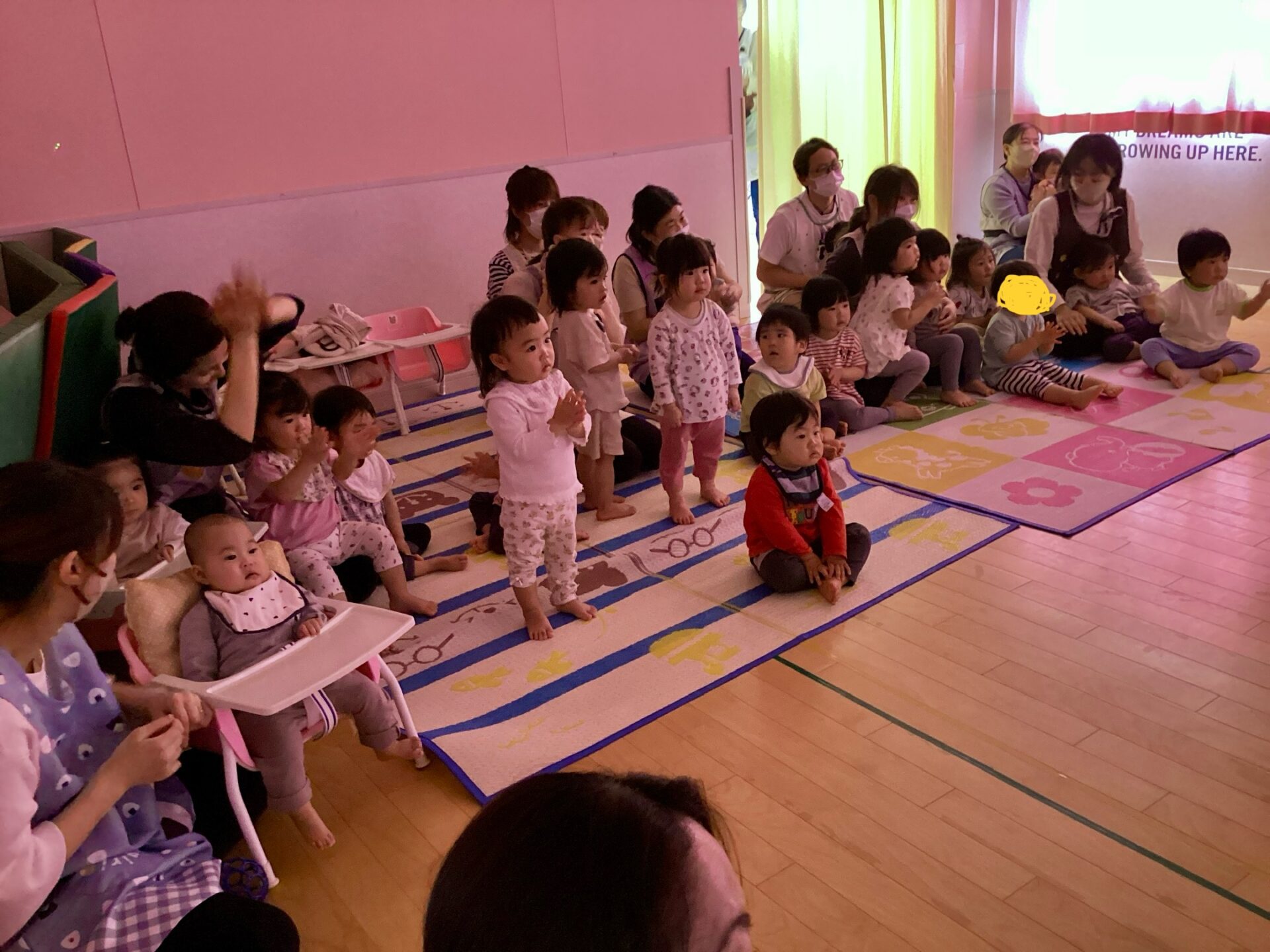 おむすびぐみ、うみぐみ、にじぐみの子ども達は、最初はドキドキしていた様子も見受けられましたが、楽しい歌や音が聴こえてくるにつれ、自然と体を揺らしたり、保育者のお膝から降りて踊り始めたり、釘付けになり、集中して見入っていたりと、様々に楽しんでいました。