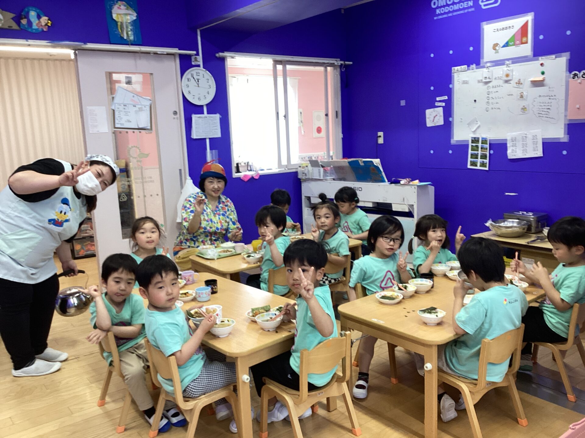 せっかくおむすびこども園に来てくださったので、オマチマンとツマチマンに給食を食べていただきました☺️