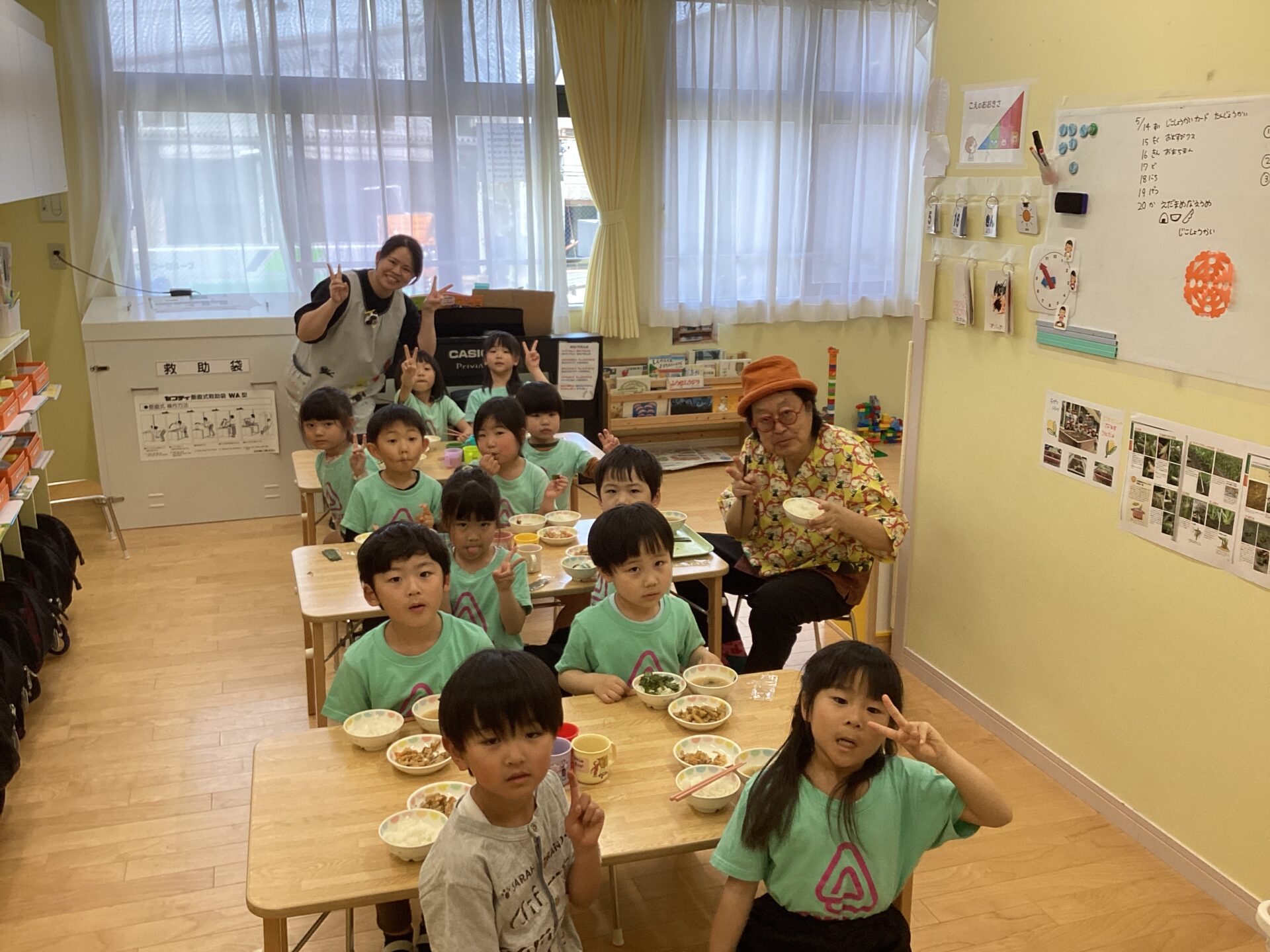オマチマンはつきぐみ(5歳児)、ツマチマンはそらぐみと一緒に食べました。