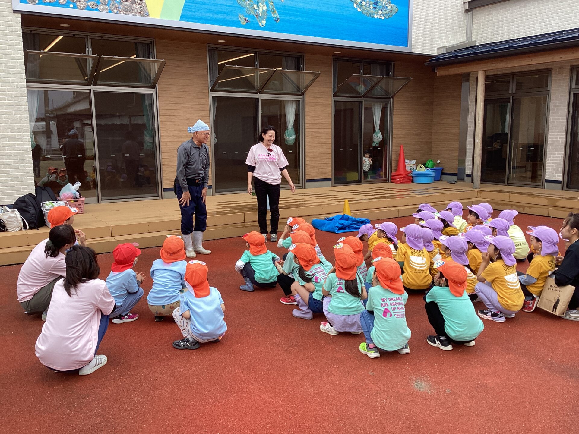 みんなで朝の挨拶をして、園長先生からのお話を聞いて・・・(普段より背筋がピンとしている後姿にほっこり)そして、畑の管理人的存在の”にたみさん”の登場に子どもたちから「わぁ」と歓声が上がりました。