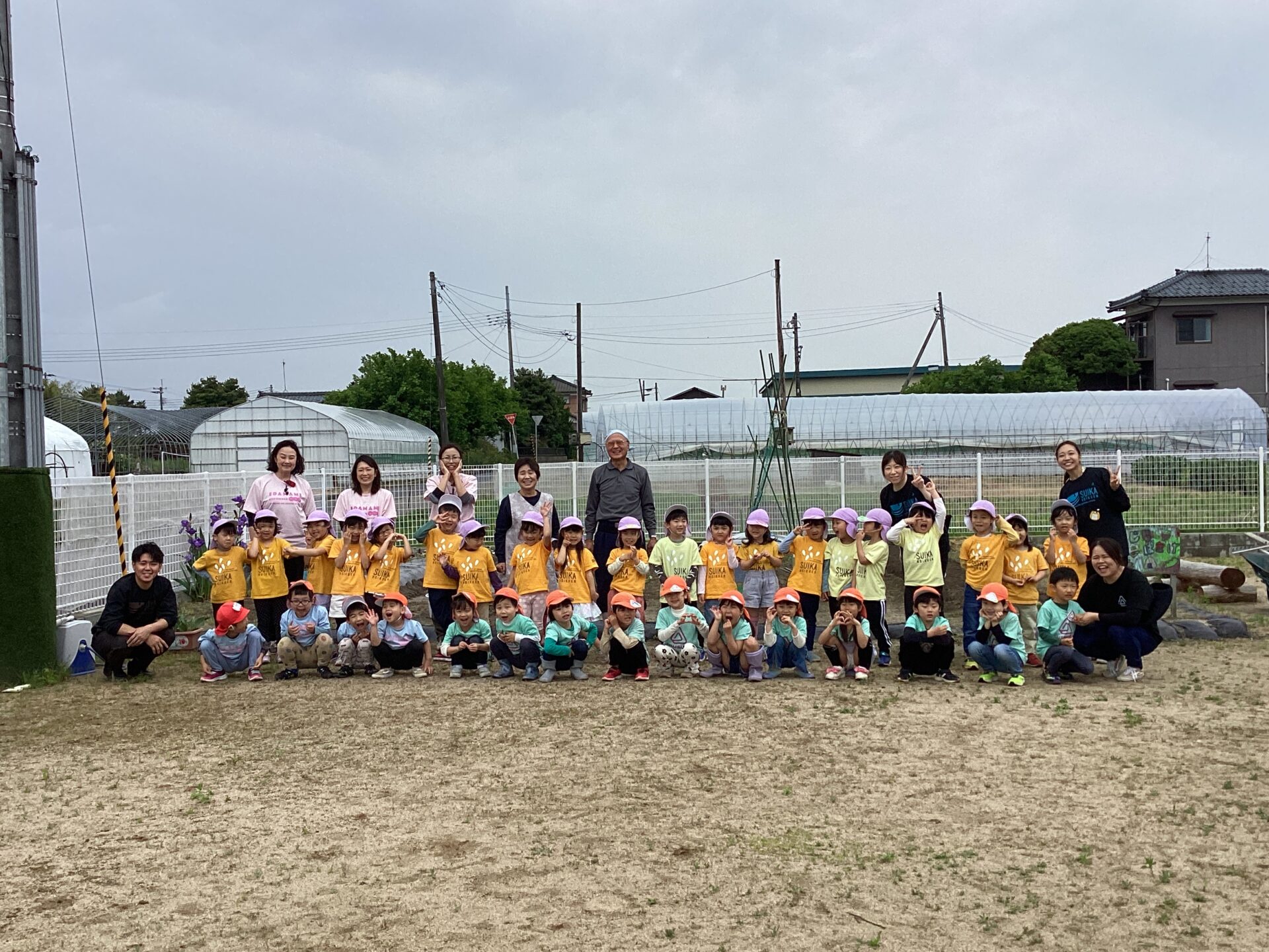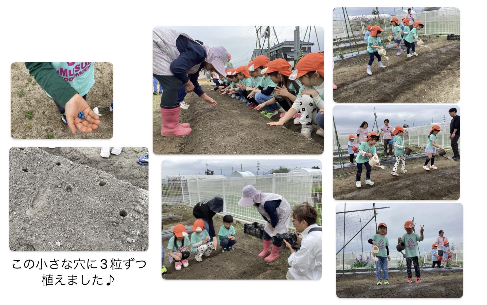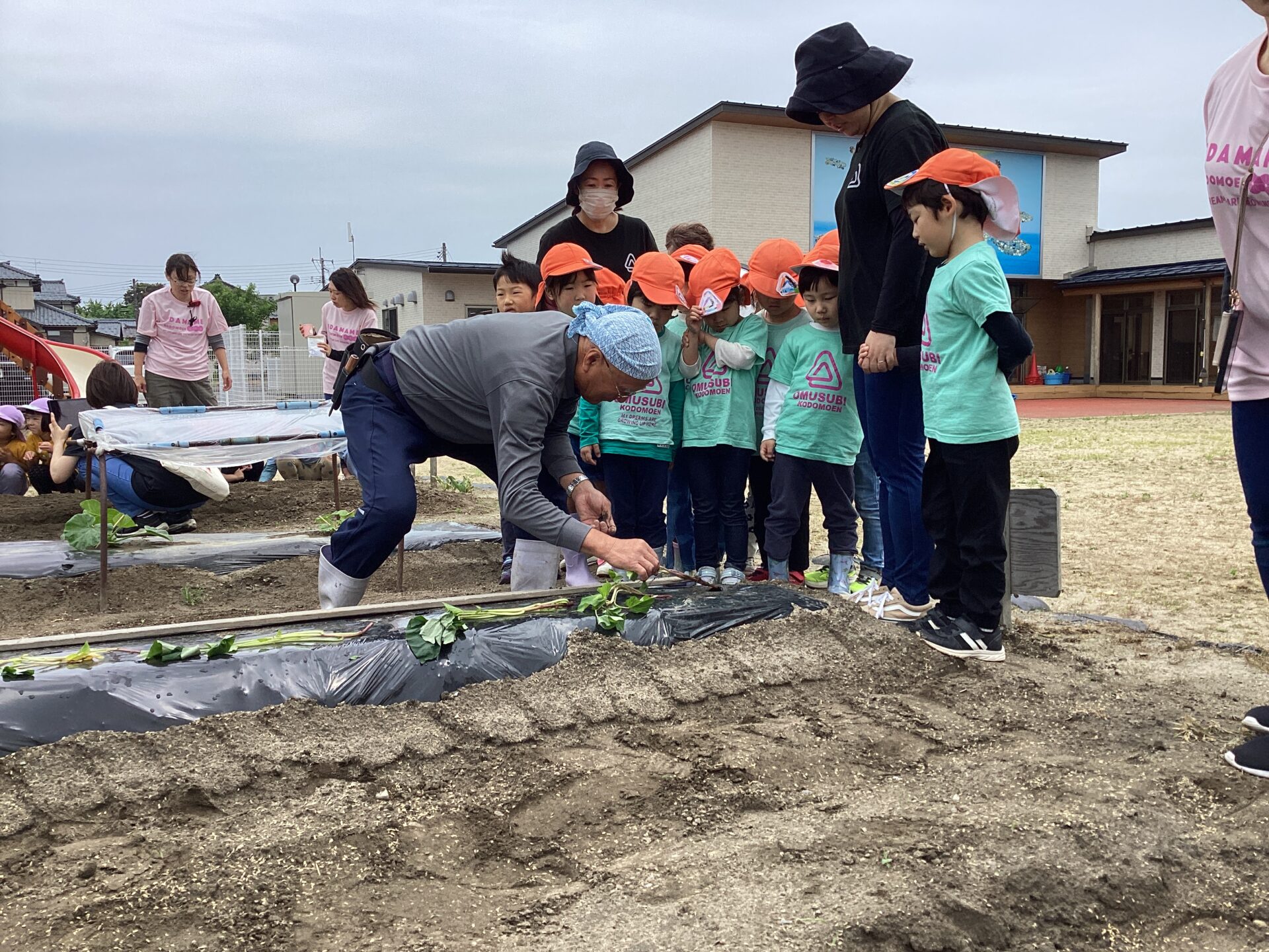 先日、新潟の姉妹園3園(すいか保育園、えだまめこども園、おむすびこども園)の年長組さんが集まって、枝豆やさつまいもを植えました。
