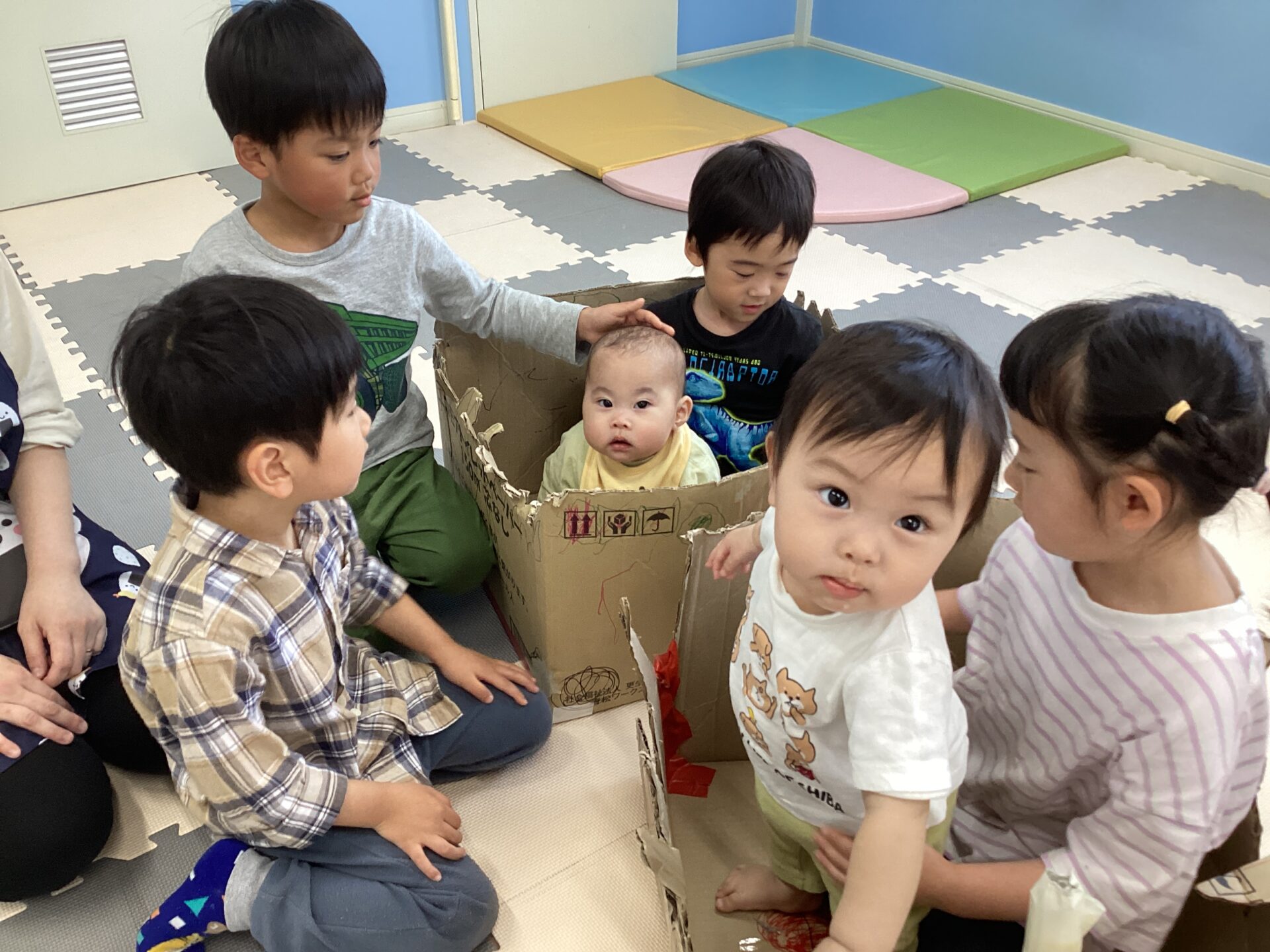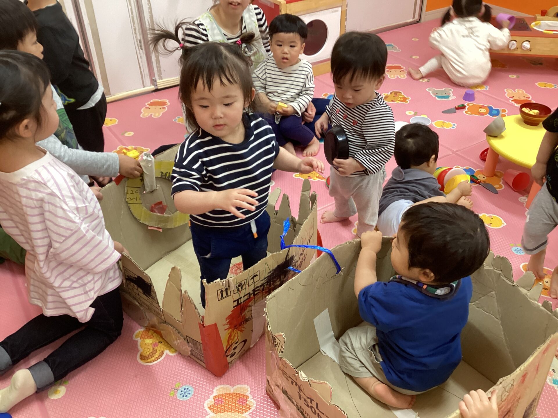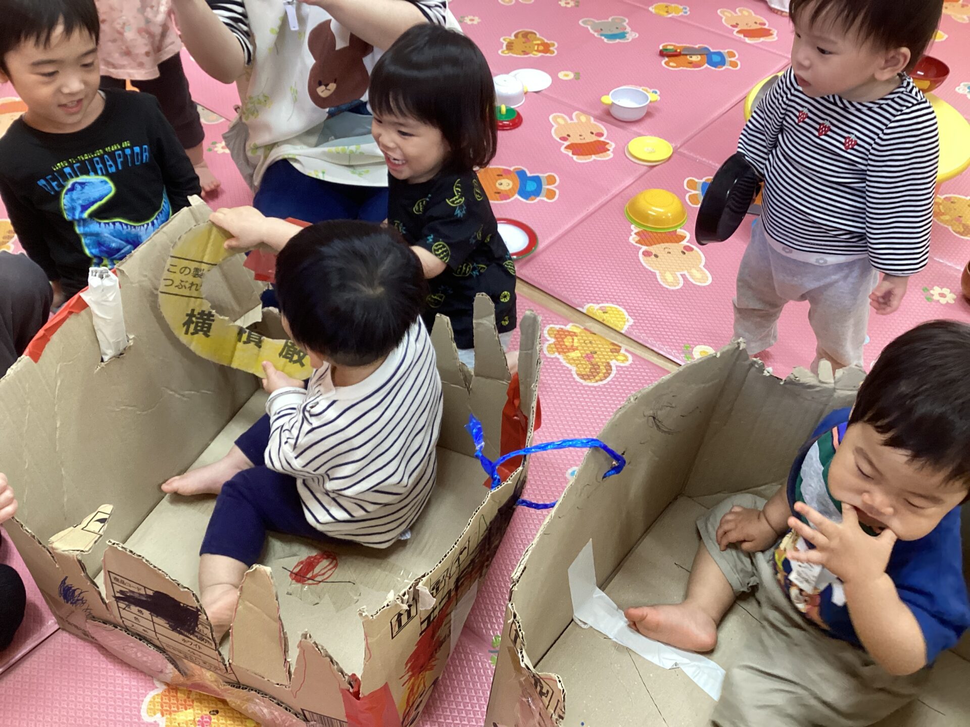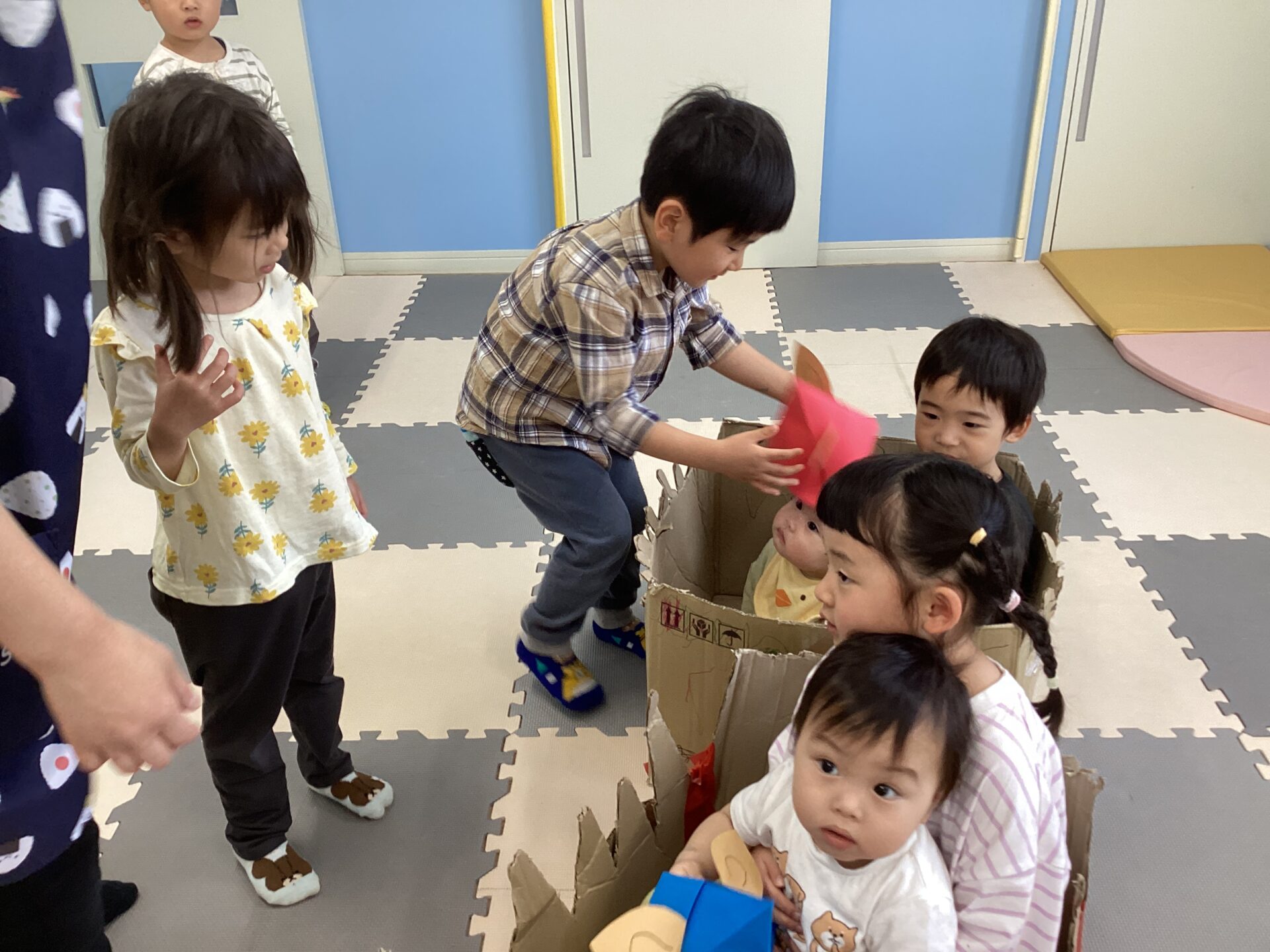 兄弟がいる子と小さいお友達にあまり馴染みがない子とで、触れ合い方や距離感は様々でしたが、自分達の作った車🚗に乗せてあげたいという思いは一緒😊お世話をしようと一生懸命な子どもたちの姿が頼もしかったです。