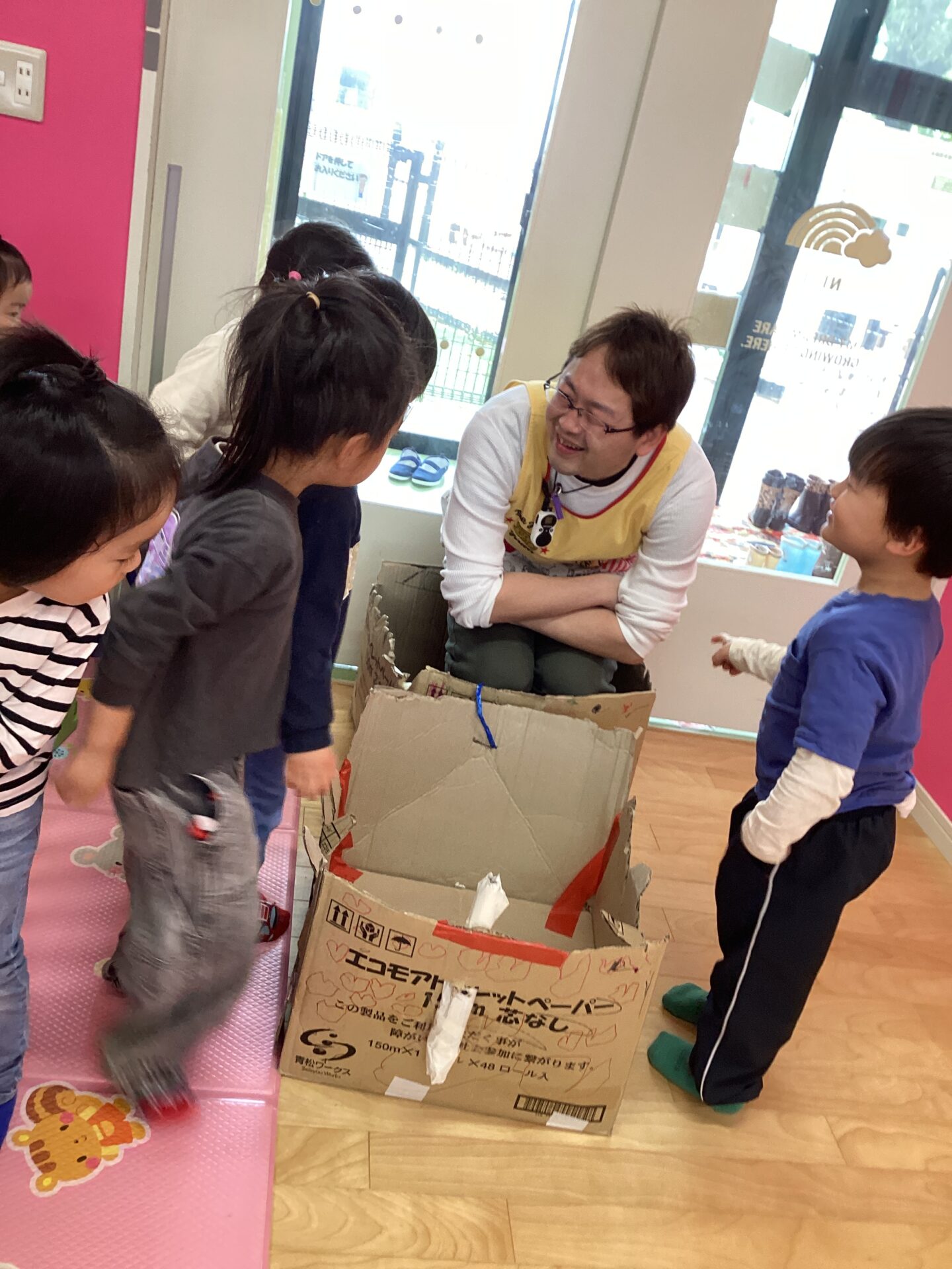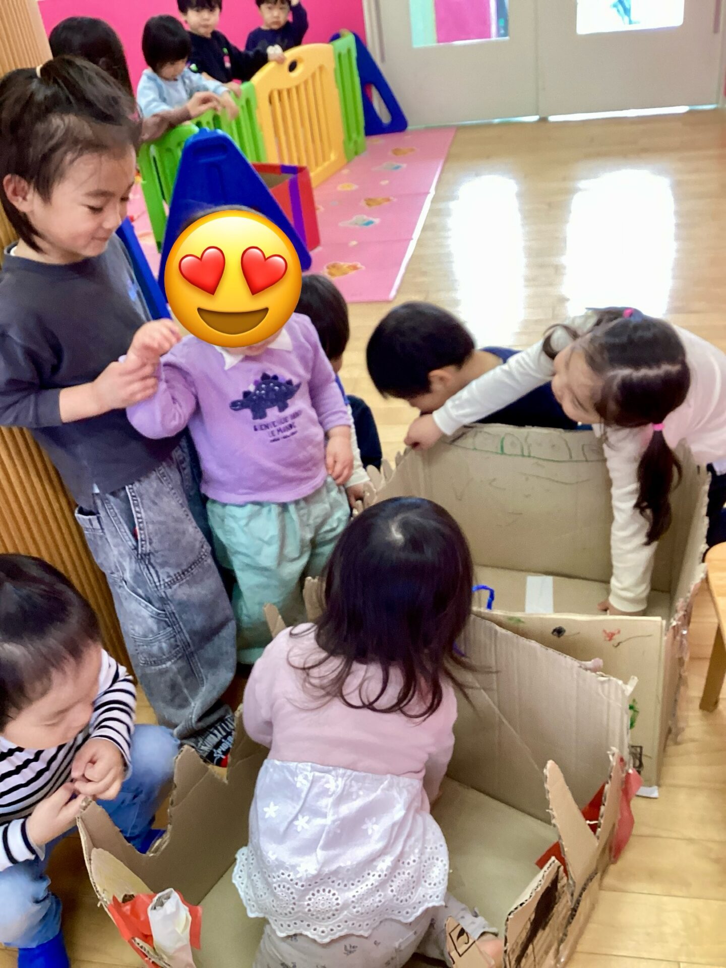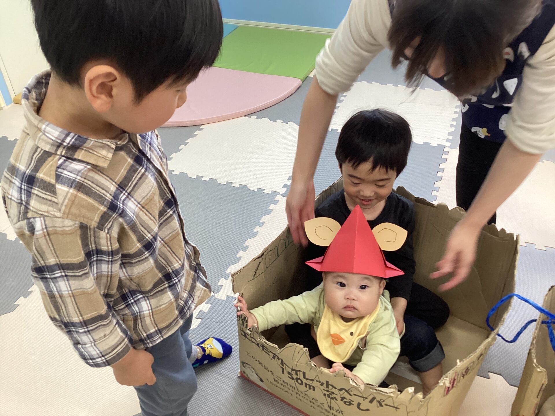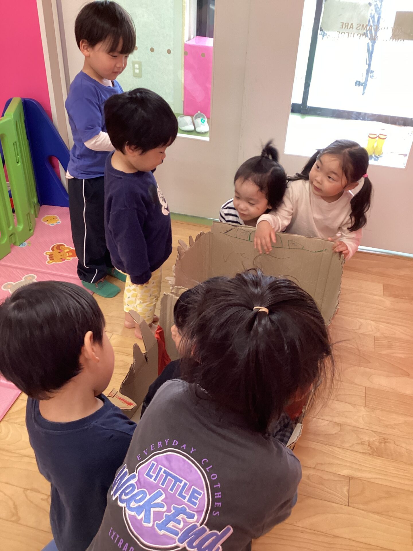 兄弟がいる子と小さいお友達にあまり馴染みがない子とで、触れ合い方や距離感は様々でしたが、自分達の作った車🚗に乗せてあげたいという思いは一緒😊お世話をしようと一生懸命な子どもたちの姿が頼もしかったです。