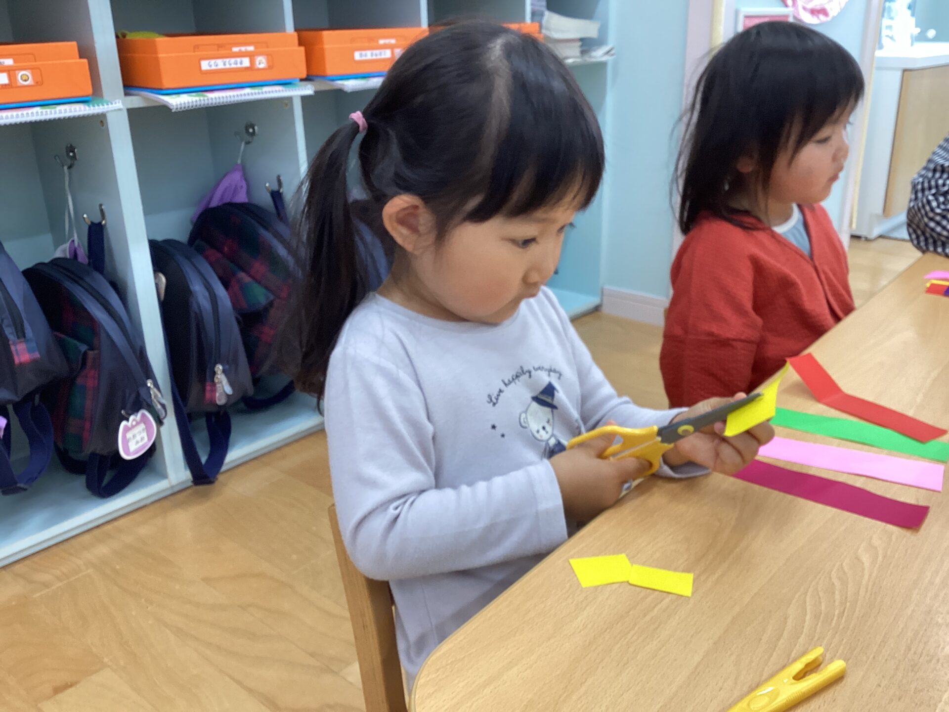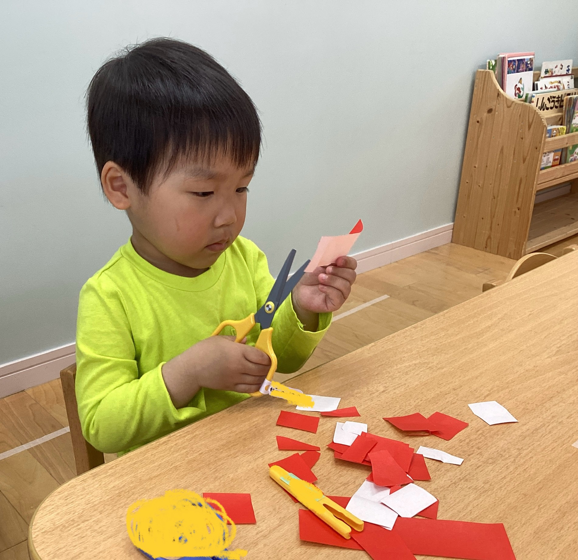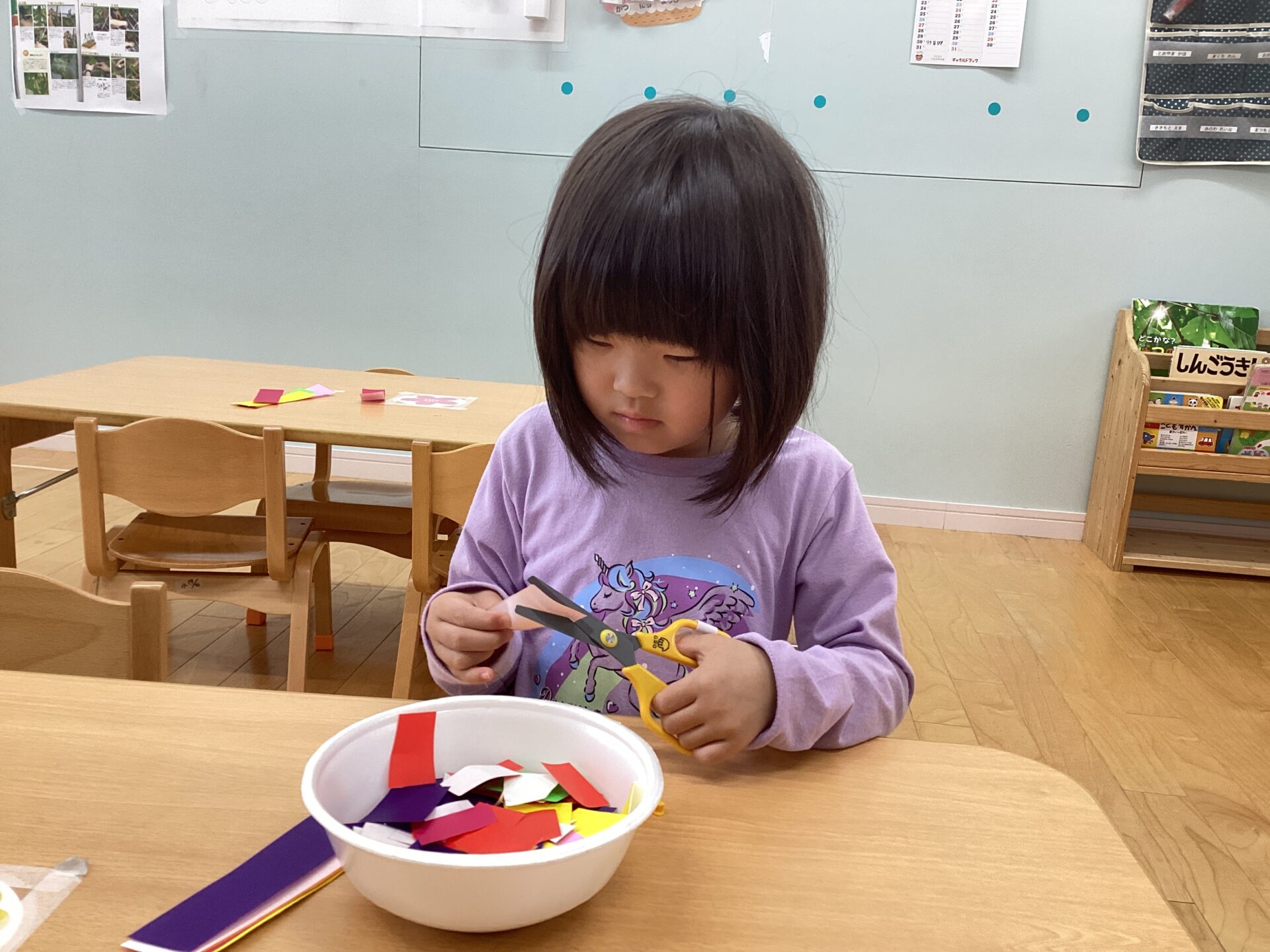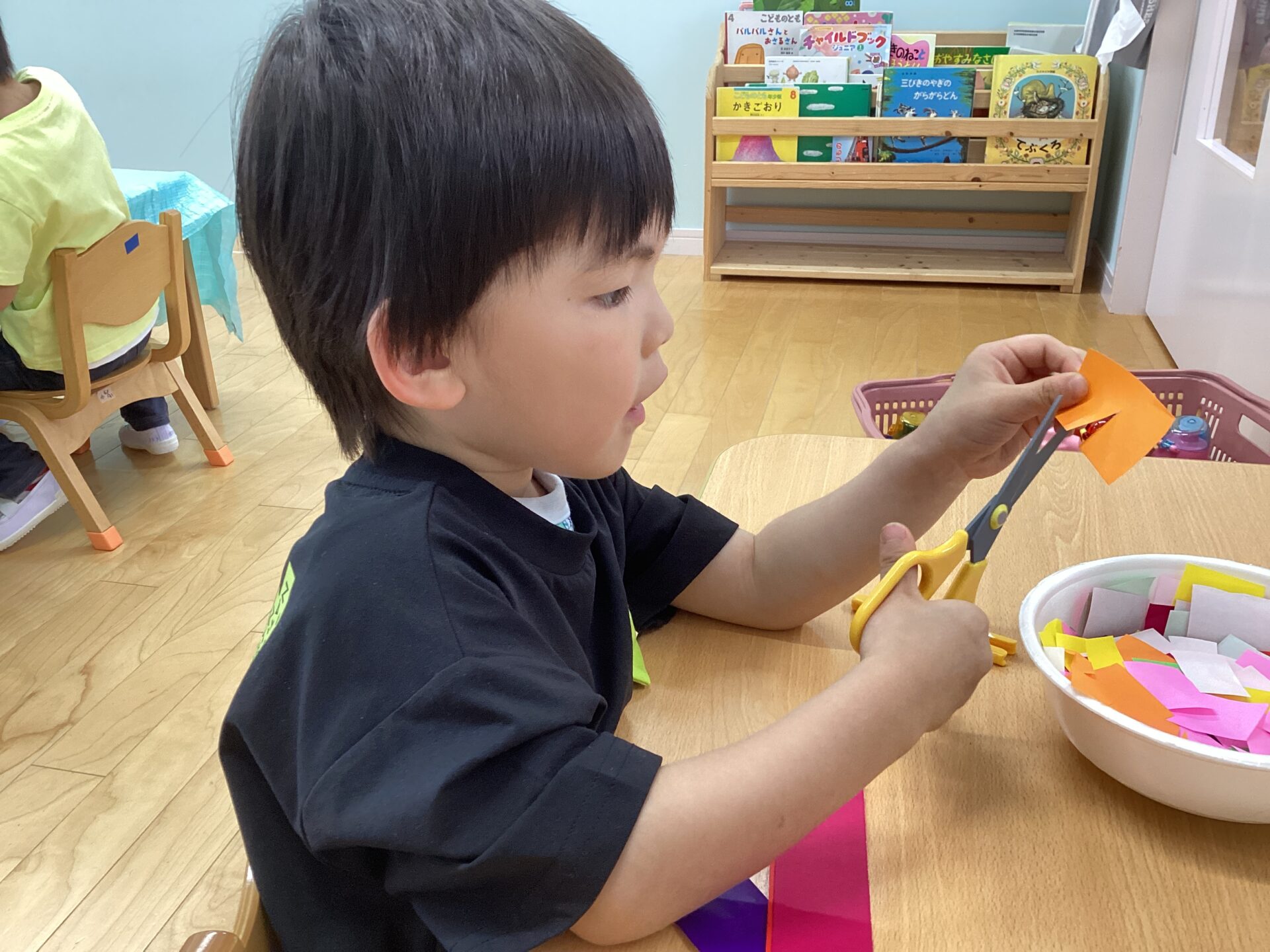 ハサミを使うのに慣れている子、ハサミの使い方が難しそうな子とさまざまでしたが真剣にハサミを使い切っていましたよ☆切り終わると「楽しかったね😄」「また、やりたいな♪」と楽しそうに話をしている子ども達がいました。