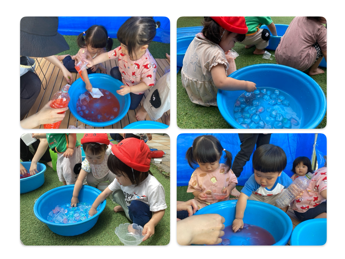 保育者の真似をして「カラカラ〜」と言葉にしながら氷に夢中になっていました😌